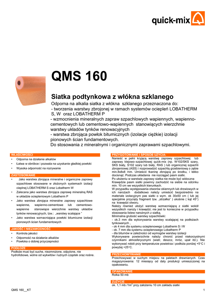 QMS 160 Siatka podtynkowa z włókna szklanego Odporna na alkalia siatka z włókna szklanego przeznaczona do: - tworzenia warstwy zbrojonej w ramach systemów ociepleń LOBATHERM S, W oraz LOBATHERM P - wzmocnienia mineralnych zapraw szpachlowych wapiennych, wapiennocementowych lub cementowo-wapiennych stanowiących wierzchnie warstwy układów tynków renowacyjnych - warstwa zbrojąca powłok bitumicznych (izolacje ciężkie) izolacji pionowych ścian fundamentowych. Do stosowania z mineralnymi i organicznymi zaprawami szpachlowymi. WŁAŚCIWOŚCI • Odporna na działanie alkaliów • Łatwa w obróbce i pozwala na uzyskanie gładkiej powłoki • Wysoka odporność na rozrywanie ZASTOSOWANIE • Jako warstwa zbrojąca mineralne i organiczne zaprawy szpachlowe stosowane w złożonych systemach izolacji cieplnej LOBATHERM S oraz Lobatherm W • Zalecana jako warstwa zbrojąca zaprawę mineralną RAS w układzie ociepleniowym Lobatherm P • Jako warstwa zbrojąca mineralne zaprawy szpachlowe wapienne, wapienno-cementowe lub cementowowapienne stanowiące wierzchnie warstwy układów tynków renowacyjnych, tzw.: „warstwy scalające ” • Jako warstwa wzmacniająca powłoki bitumiczne izolacji pionowych ścian fundamentowych JAKOŚĆ I NIEZAWODNOŚĆ • Kontrola jakości • • Odporność na działanie alkaliów Powłoka o dobrej przyczepności PODŁOŻE Podłoże musi być suche, niezmrożone, odpylone, nie hydrofobowe, wolne od wykwitów i luźnych cząstek oraz nośne. PRZYGOTOWANIE I SPOSÓB UZYCIA: Nanieść w pełni kryjącą warstwę zaprawy szpachlowej lub zaprawy klejowo–szpachlowej quick-mix (np. W102/SKS szary, SKS biały, S102 szary lub biały, RAS ) lub organicznej szpachli zbrojeniowej (ASS) i rozprowadzić szpachlą grzebieniową o zębie min.8x8x8 mm. Umieścić tkaninę zbrojącą po środku, i lekko docisnąć. Podczas układania nie rozciągać pasm siatki. Po ułożeniu w warstwie zaprawy siatka nie może być widoczna Krawędzie pasm siatki powinny zachodzić na siebie na odcinku min. 10 cm we wszystkich kierunkach. W przypadku występowania otworów okiennych lub drzwiowych w ich narożach dodatkowo należy umieścić bezpośrednio na materiale izolacyjnym pas siatki o wym. ok 30x50 cm ( lub jej specjalnie przycięty fragment tzw. „strzałka” ) ukośnie ( kąt 45°) na krawędzi otworu. Należy również ułożyć warstwę wzmacniającą z siatki wokół wszystkich naroży i krawędzi; nie jest to konieczne w przypadku stosowania listew narożnych z siatką. Minimalna grubość warstwy szpachlówki: - ok.3 mm dla wykonywania warstwy scalającej na podłożach tynkowanych , - ok 4 mm dla systemu ocieplenowego Lobatherm S i W - ok. 7 mm dla systemu ocieplenowego Lobatherm P - dla bitumów w zależności od wymogów warstwy izolacji Wykonywane powierzchnie należy chronić przed niekorzystnymi czynnikami atmosferycznymi (wiatr, deszcz, mróz, upał itd.). Nie wykonywać robót przy temperaturze powietrza i podłoża poniżej +5C i powyżej +25C. PRZECHOWYWANIE Przechowywać w suchym miejscu na paletach drewnianych. Czas magazynowania: 12 miesięcy od daty produkcji umieszczonej na opakowaniu. OPAKOWANIE Rolka 50 mb ZUŻYCIE ok. 1,1 mb /1m2 przy założeniu 10 cm zakładu siatki QMS 160__KT 1 UWAGI Przy zbrojeniu krawędzi, formowaniu zaokrągleń , itp. należy uważać, aby pod siatką nie pozostawić pustych przestrzeni nie wypełnionych zaprawą . Nie można szpachlować ani zbroić elewacji w pełnym słońcu lub na silnym wietrze (należy elewację odpowiednio osłonić). Przy szlifowaniu warstwy szpachlowej trzeba uważać, aby nie uszkodzić siatki. Powyższe stwierdzenia opierają się na szerokim programie badań i doświadczeń praktycznych. Nie są jednak przenoszalne na każdy przypadek zastosowania. Dlatego ewentualnie zalecamy wykonanie prób zastosowania. Zastrzegamy sobie zmiany techniczne w ramach doskonalenia produktu. W pozostałych sprawach stosują się nasze ogólne warunki handlowe DANE TECHNICZNE Masa powierzchniowa ok. 165 g/m2 wytrzymałość na rozrywanie: > 2,0 kN na 5cm Rozmiar oczek ok. 4 x 4mm temperatura stosowania: + 5C do + 25C zużycie: ok. 1,1 mb / m²(*) w suchym i przeznaczonym do przechowywanie: tego miejscu, 12 miesięcy od daty produkcji postać dostawy: Rolka 50 mb (*) przy założeniu 10 cm zakładu na łączeniach pasów Stan: wrzesień 2015 r. Z chwilą wydania nowej karty technicznej niniejsza wersja traci swą ważność Szersze informacje można uzyskać: quick-mix sp. z o.o. ul. Nyska 36 57-100 Strzelin tel. 71/ 392 72 20, 15 fax. 71/ 392 72 23, 24 e-mail: [email protected] www.quick-mix.pl QMS 160_KT 2