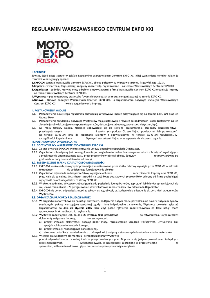 REGULAMIN WARSZAWSKIEGO CENTRUM EXPO XXI I. DEFINICJE Zawsze, jeżeli użyte zostały w tekście Regulaminu Warszawskiego Centrum EXPO XXI niżej wymienione terminy należy je rozumieć w następujący sposób: 1. EXPO XXI oznacza Warszawskie Centrum EXPO XXI, obiekt położony w Warszawie przy ul. Prądzyńskiego 12/14. 2. Imprezy – wydarzenia, targi, pokazy, kongresy koncerty itp. organizowane na terenie Warszawskiego Centrum EXPO XXI 3. Organizator - podmiot, który na mocy odrębnej umowy zawartej z firmą Warszawskie Centrum EXPO XXI organizuje Imprezy na terenie Warszawskiego Centrum EXPO XXI, 4. Wystawca – podmiot prawny oraz osoba fizyczna biorąca udział w Imprezie organizowanej na terenie EXPO XXI. 5. Umowa - Umowa pomiędzy Warszawskim Centrum EXPO XXI, a Organizatorem dotycząca wynajęcia Warszawskiego Centrum EXPO XXI w celu zorganizowania Imprezy. II. POSTANOWIENIA OGÓLNE 2.1. Postanowienia niniejszego regulaminu obowiązują Wystawców Imprez odbywających się na terenie EXPO XXI oraz ich Uczestników. 2.3. Postanowienia regulaminu dotyczące Wystawców mają zastosowanie również do podmiotów - osób działających na ich zlecenie (osoby dokonujące transportu eksponatów, dokonujące zabudowy, prace specjalistyczne , itp.). 2.3. Na mocy Umowy Najmu, Najemca zobowiązuje się do ścisłego przestrzegania przepisów bezpieczeństwa, przeciwpożarowych i sanitarnych podczas Okresu Najmu powierzchni lub pomieszczeń na terenie EXPO XXI oraz do zapoznania Klientów z obowiązującymi na terenie EXPO XXI regulacjami, w szczególności Regulaminem i Ogólnymi Warunkami Najmu oraz zapewnienia ich przestrzegania. III. POSTANOWIENIA ORGANIZACYJNE 3.1. GODZINY PRACY WARSZAWSKIEGO CENTRUM EXPO XXI 3.1.1 Za czas otwarcia EXPO XXI w okresie trwania umowy podnajmu odpowiada Organizator. 3.1.2 Organizator zobowiązany jest do uregulowania pod względem formalno finansowym wszelkich zobowiązań wynikających z przekroczenia unormowanego czasu pracy pracowników obsługi obiektu (dotyczy to pracy zarówno po godzinach, w nocy oraz w dni wolne od pracy). 3.2. ZABEZPIECZENIE TERENU I ZASADY ODPOWIEDZIALNOŚCI 3.2.1. EXPO XXI w okresach pomiędzy imprezami jest monitorowane przez służby ochrony wynajęte przez EXPO XXI w zakresie niezbędnym do codziennego funkcjonowania obiektu. 3.2.2. Organizator odpowiada za bezpieczeństwo, wynajęcie ochrony i zabezpieczenie Imprezy oraz EXPO XXI, przez cały okres najmu. Organizator zatrudni na swój koszt dodatkowych pracowników ochrony od firmy posiadającej wyłączność na ochronę obiektu ze strony EXPO XXI. 3.2.3. W okresie podnajmu Wystawcy zobowiązani są do posiadania identyfikatorów, zaproszeń lub biletów uprawniających do wejścia na teren obiektu. Za przygotowanie identyfikatorów, zaproszeń i biletów odpowiada Organizator. 3.2.4. EXPO XXI nie ponosi odpowiedzialności za szkody: utratę, ubytek, uszkodzenie lub zniszczenie eksponatów i przedmiotów Wystawców. 3.3. ORGANIZACJA PRAC PRZY REALIZACJI IMPREZ 3.3.1. W przypadku zapotrzebowania na usługi nietypowe, podłączenia dużych mocy, pozwolenia na pokazy z użyciem dymów scenicznych, pokazy wymagające specjalnej zgody i inne indywidualne zamówienia, Wystawca powinien zgłaszać Organizatorowi do dnia 29 stycznia 2016 roku. Zbyt późne zgłoszenie zapotrzebowania na takie usługi może spowodować brak możliwości ich wykonania. 3.3.2. Wystawca zobowiązany jest, do dnia 29 stycznia 2016 przedstawić do zatwierdzenia Organizatorowi dokumenty związane z Imprezą, a w szczególności: a) projekt instalacji elektrycznej, podając pobór mocy, rozmieszczenie urządzeń trójfazowych, usytuowanie linii specjalnych i sprzętu teletechnicznego; b) projekt instalacji wodociągowo-kanalizacyjnej, c) stosowne certyfikaty i zaświadczenia o trudno palności, dotyczące stosowanych do zabudowy stoisk materiałów, 3.3.3. W czasie przewidzianym dla montażu i demontażu imprezy Wystawca ponosi odpowiedzialność za rodzaj i zakres przeprowadzonych prac. Dopuszcza się jedynie prowadzenie niezbędnych robot montażowych i wykończeniowych. W szczególności zabronione są prace związane ze spawaniem, szlifowaniem drewna i gipsu oraz wszelkie prace powodujące zapylenie. 1 3.3.4. Wszelka zabudowa wystawiennicza łącznie z urządzeniami i eksponatami oraz nośnikami reklam powinna być montowana w taki sposób, żeby jej poszczególne elementy nie stanowiły zagrożenia dla bezpieczeństwa życia i zdrowia osób przebywających na terenie EXPO XXI. 3.3.5. W przypadku naruszenia przez Wystawcę pkt. 3.3.3 i 3.3.4 Regulaminu EXPO XXI dyrektor ds. administracyjno – technicznych ma prawo przerwać prace montażowe i nakazać usunięcie powstałego zagrożenia. 3.3.6. Zabrania się samowolnego wykonywania jakichkolwiek przyłączy do instalacji znajdujących się w kanałach medialnych. Wszelkie prace w kanałach, a także wszystkie przyłącza wyprowadzane z kanałów medialnych we wskazane na planie zabudowy miejsce, mogą być wykonywane wyłącznie przez autoryzowanych konserwatorów EXPO XXI. 3.3.7. Elementy zabudowy: fryzy, transparenty, markizy, opisy stoisk i eksponatów oraz znaki firmowe i towarowe oraz reklamy nie mogą blokować w żaden sposób przejść i ciągów komunikacyjnych oraz zatwierdzonej wysokości zabudowy. 3.3.8. Zabrania się bez uzgodnienia z Organizatorem, zawieszania i naklejania elementów stoisk, transparentów, reklam i dekoracji do konstrukcji hal, roznoszenia ulotek, gazet i innych materiałów reklamowych. Niestosowanie się do tego zakazu skutkować będzie obciążeniem Wystawcy stosowną karą oraz może wiązać się z nakazem przerwania prac montażowych. Zakaz ten dotyczy również osób, które posiadają bilet, zaproszenie lub otrzymały akredytację prasową i przyszły na targi w celu oglądania eksponatów. 3.3.9. Wystawca jest zobowiązany do bezwzględnego codziennego utrzymania czystości i porządku na wynajętym przez sieb