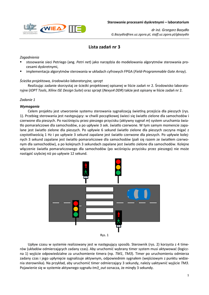 Sterowanie procesami dyskretnymi – laboratorium dr inż. Grzegorz Bazydło [email protected], staff.uz.zgora.pl/gbazydlo Lista zadań nr 3 Zagadnienia stosowanie sieci Petriego (ang. Petri net) jako narzędzia do modelowania algorytmów sterowania procesami dyskretnymi, implementacja algorytmów sterowania w układach cyfrowych FPGA (Field-Programmable Gate Array). Ścieżka projektowa, środowisko laboratoryjne, sprzęt Realizując zadanie skorzystaj ze ścieżki projektowej opisanej w liście zadań nr 2. Środowisko laboratoryjne (IOPT Tools, Xilinx ISE Design Suite) oraz sprzęt (Nexys4 DDR) także jest opisany w liście zadań nr 2. Zadanie 1 Wymagania Celem projektu jest utworzenie systemu sterowania sygnalizacją świetlną przejścia dla pieszych (rys. 1). Przebieg sterowania jest następujący: w chwili początkowej świeci się światło zielone dla samochodów i czerwone dla pieszych. Po naciśnięciu przez pieszego przycisku (aktywny sygnał m) system uruchamia światło pomarańczowe dla samochodów, a po upływie 3 sek. światło czerwone. W tym samym momencie zapalane jest światło zielone dla pieszych. Po upływie 6 sekund światło zielone dla pieszych zaczyna migać z częstotliwością 1 Hz i po upływie 3 sekund zapalane jest światło czerwone dla pieszych. Po upływie kolejnych 3 sekund zapalane jest światło pomarańczowe dla samochodów (pali się razem ze światłem czerwonym dla samochodów), a po kolejnych 3 sekundach zapalane jest światło zielone dla samochodów. Kolejne włączenie światła pomarańczowego dla samochodów (po wciśnięciu przycisku przez pieszego) nie może nastąpić szybciej niż po upływie 12 sekund. m m Rys. 1 Upływ czasu w systemie realizowany jest w następujący sposób. Sterownik (rys. 2) korzysta z 4 timerów (układów odmierzających zadany czas). Aby uruchomić wybrany timer system musi aktywować (logiczna 1) wyjście odpowiedzialne za uruchomienie timera (np. TM1, TM3). Timer po uruchomieniu odmierza zadany czas i jego upłynięcie sygnalizuje aktywnym, odpowiednim sygnałem (wejściowym z punktu widzenia sterownika). Na przykład, aby uruchomić timer odmierzający 3 sekundy, należy uaktywnić wyjście TM3. Pojawienie się w systemie aktywnego sygnału tm3_out oznacza, że minęły 3 sekundy. 1 m Sygnalizacja dla pieszych m SAM_C SAM_P STEROWNIK SAM_Z PIESI_C PIESI_Z TM1 tm1_out TM3 tm3_out TM6 tm6_out TM12 tm12_out Elementy biblioteczne (timery) Rys. 2 Wszystkie sygnały występujące w układzie scharakteryzowano w tabeli 1. Tabela 1. Opis sygnałów układu z zadania 1 Lp. Nazwa sygnału Rodzaj sygnału Źródło 1. m wejściowy przycisk 2. SAM_C wyjściowy sterownik 3. SAM_P wyjściowy sterownik 4. SAM_Z wyjściowy sterownik 5. PIESI_C wyjściowy sterownik 6. PIESI_Z wyjściowy sterownik 7. TM1 wyjściowy sterownik 8. tm1_out wejściowy timer 9. TM3 wyjściowy sterownik 10. tm3_out wejściowy timer 11. TM6 wyjściowy sterownik 12. tm6_out wejściowy timer 13. TM12 wyjściowy sterownik 14. tm12_out wejściowy timer Znaczenie Sygnał aktywny oznacza, że pieszy chce przejść na drugą stronę. Sygnał aktywny oznacza, że włączone są światła czerwone dla samochodów. Sygnał aktywny oznacza, że włączone są światła pomarańczowe dla samochodów. Sygnał aktywny oznacza, że włączone są światła zielone dla samochodów. Sygnał aktywny oznacza, że włączone są światła czerwone dla pieszych. Sygnał aktywny oznacza, że włączone są światła zielone dla pieszych. Sygnał aktywny oznacza uruchomienie timera odmierzającego czas 1 sekundy. Sygnał aktywny oznacza, że upłynął czas 1 sekundy od momentu uruchomienia timera. Sygnał aktywny oznacza uruchomienie timera odmierzającego czas 3 sekund. Sygnał aktywny oznacza, że upłynął czas 3 sekund od momentu uruchomienia timera. Sygnał aktywny oznacza uruchomienie timera odmierzającego czas 6 sekund. Sygnał aktywny oznacza, że upłynął czas 6 sekund od momentu uruchomienia timera. Sygnał aktywny oznacza uruchomienie timera odmierzającego czas 12 sekund. Sygnał aktywny oznacza, że upłynął czas 12 sekund od momentu uruchomienia timera. Krok 1 – Modelowanie Korzystając ze środowiska IOPT Tools zamodeluj sieć Petriego przedstawiającą model sterowania sygnalizacją świetlną. Odpowiednio zidentyfikuj i nazwij poszczególne miejsca (np. SCPZ – samochody światło czerwone, piesi światło zielone itp.) i tranzycje. Użyj dokładnie takich nazw sygnałów jak w tabeli 1. 2 Krok 2 – Walidacja Po zaprojektowaniu modelu układu sterowania, wykonaj symulację utworzonej sieci Petriego korzystając z symulatora IOPT Tools. Jeżeli wyniki symulacji wykażą, że model zawiera błędy, wróć do kroku pierwszego i popraw go. Jeżeli model przeszedł poprawnie etap symulacji, wyeksportuj jego opis w syntezowalnym języku opisu sprzętu VHDL. Krok 3 – Synteza Następnie korzystając z wytycznych prowadzącego utwórz projekt w środowisku Xilinx ISE Design Suite 14.7. Parametry projektu pokazano na rys. 3. Rys. 3 Następnie dodaj do projektu pliki Lab03_zad01_nexys4ddr.ucf oraz Timers.vhdl i zgodnie z wytycznymi prowadzącego dokonaj modyfikacji w pliku nazwaTwojegoProjektu_main.vhdl na podstawie pliku Lab03_main.vhdl dostępnego na stronie z materiałami do zajęć. Kolejnym etapem jest uruchomienie procesu syntezy, implementacji oraz generowania pliku wynikowego (bitstream) zawierającego dane służące do zaprogramowania układu. Krok 4 – Implementacja Podłącz do komputera układ Nexys 4 DDR i korzystając z narzędzia iMPACT oraz wytycznych prowadzącego wykonaj programowanie układu FPGA za pomocą wygenerowanego w poprzednim kroku bitstreamu. Krok 5 – Weryfikacja sprzętowa Zweryfikuj działanie układu przełączając poszczególne przełączniki i obserwując diody LED (rys. 4). SAM_C SAM_Z PIESI_Z SAM_P PIESI_C Reset Enable m Rys. 4 Po wykonaniu wszystkich zadań poproś prowadzącego o ocenę. W razie trudności lub