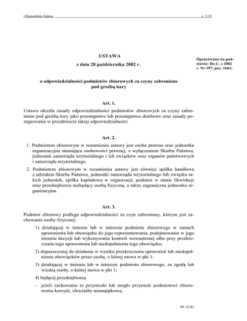 ©Kancelaria Sejmu s. 1/15 USTAWA Opracowano na podstawie: Dz.U. z 2002 r. Nr 197, poz. 1661; z dnia 28 października 2002 r. o odpowiedzialności podmiotów zbiorowych za czyny zabronione pod groźbą kary Art. 1. Ustawa określa zasady odpowiedzialności podmiotów zbiorowych za czyny zabronione pod groźbą kary jako przestępstwa lub przestępstwa skarbowe oraz zasady postępowania w przedmiocie takiej odpowiedzialności. Art. 2. 1. Podmiotem zbiorowym w rozumieniu ustawy jest osoba prawna oraz jednostka organizacyjna niemająca osobowości prawnej, z wyłączeniem Skarbu Państwa, jednostek samorządu terytorialnego i ich związków oraz organów państwowych i samorządu terytorialnego. 2. Podmiotem zbiorowym w rozumieniu ustawy jest również spółka handlowa z udziałem Skarbu Państwa, jednostki samorządu terytorialnego lub związku takich jednostek, spółka kapitałowa w organizacji, podmiot w stanie likwidacji oraz przedsiębiorca niebędący osobą fizyczną, a także zagraniczna jednostka organizacyjna. Art. 3. Podmiot zbiorowy podlega odpowiedzialności za czyn zabroniony, którym jest zachowanie osoby fizycznej: 1) działającej w imieniu lub w interesie podmiotu zbiorowego w ramach uprawnienia lub obowiązku do jego reprezentowania, podejmowania w jego imieniu decyzji lub wykonywania kontroli wewnętrznej albo przy przekroczeniu tego uprawnienia lub niedopełnieniu tego obowiązku; 2) dopuszczonej do działania w wyniku przekroczenia uprawnień lub niedopełnienia obowiązków przez osobę, o której mowa w pkt 1; 3) działającej w imieniu lub w interesie podmiotu zbiorowego, za zgodą lub wiedzą osoby, o której mowa w pkt 1; 4) będącej przedsiębiorcą - jeżeli zachowanie to przyniosło lub mogło przynieść podmiotowi zbiorowemu korzyść, chociażby niemajątkową. 09-12-02 ©Kancelaria Sejmu s. 2/15 Art. 4. Podmiot zbiorowy podlega odpowiedzialności, jeżeli popełnienie przestępstwa lub przestępstwa skarbowego przez osobę, o której mowa w art. 3, zostało stwierdzone prawomocnym wyrokiem skazującym, nakazem karnym, prawomocnym orzeczeniem o zezwoleniu na dobrowolne poddanie się odpowiedzialności lub prawomocnym orzeczeniem warunkowo umarzającym postępowanie albo prawomocnym orzeczeniem o umorzeniu postępowania z powodu okoliczności wyłączających ściganie sprawcy. Art. 5. Podmiot zbiorowy podlega odpowiedzialności w razie stwierdzenia co najmniej braku należytej staranności w wyborze osoby fizycznej, o której mowa w art. 3 pkt 2 lub 3, lub co najmniej braku należytego nadzoru nad tą osobą albo gdy organizacja działalności tego podmiotu nie zapewnia uniknięcia popełnienia czynu zabronionego, a mogło je zapewnić zachowanie należytej, wymaganej w danych okolicznościach ostrożności przez osobę, o której mowa w art. 3 pkt 1 lub 4. Art. 6. Odpowiedzialność albo brak odpowiedzialności podmiotu zbiorowego na zasadach określonych w niniejszej ustawie nie wyłącza odpowiedzialności cywilnej za wyrządzoną szkodę, odpowiedzialności administracyjnej ani indywidualnej odpowiedzialności prawnej sprawcy czynu zabronionego. Art. 7. 1. Za czyn określony w ustawie wobec podmiotu zbiorowego orzeka się karę pieniężną w wysokości do 10% przychodu określonego w trybie przepisów o podatku dochodowym od osób prawnych, osiągniętego w roku podatkowym poprzedzającym wydanie orzeczenia. 2. Jeżeli przychód, o którym mowa w ust. 1, jest niższy niż 1 000 000 zł, karę pieniężną orzeka się w wysokości do 10% wydatków poniesionych w roku poprzedzającym wydanie orzeczenia. 3. Kara pieniężna orzeczona na podstawie ust. 1 lub 2 nie może być niższa niż 5 000 zł. Art. 8. 1. Wobec podmiotu zbiorowego orzeka się przepadek: 1) przedmiotów pochodzących chociażby pośrednio z czynu zabronionego lub które służyły lub były przeznaczone do popełnienia czynu zabronionego; 2) korzyści majątkowej pochodzącej chociażby pośrednio z czynu zabronionego; 09-12-02 ©Kancelaria Sejmu s. 3/15 3) równowartości przedmiotów lub korzyści majątkowej pochodzących chociażby pośrednio z czynu zabronionego. 2. Przepadku wymienionego w ust. 1 nie orzeka się, jeżeli przedmiot, korzyść majątkowa lub ich równowartość podlega zwrotowi innemu uprawnionemu podmiotowi. Art. 9. 1. Wobec podmiotu zbiorowego można orzec: 1) zakaz promocji lub reklamy prowadzonej działalności, wytwarzanych lub sprzedawanych wyrobów, świadczonych usług lub udzielanych świadczeń; 2) zakaz korzystania z dotacji, subwencji lub innych form wsparcia finansowego środkami publicznymi; 3) zakaz korzystania z pomocy organizacji międzynarodowych, których Rzeczpospolita Polska jest członkiem; 4) zakaz ubiegania się o zamówienia publiczne; 5) zakaz prowadzenia określonej działalności podstawowej lub ubocznej; 6) podanie wyroku do publicznej wiadomości. 2. Zakazy, o których mowa w ust. 1 pkt 1-5, orzeka się na okres od 1 roku do lat 5; orzeka się je w latach. 3. Zakazu, o którym mowa w ust. 1 pkt 5, nie orzeka się, jeżeli jego orzeczenie mogłoby doprowadzić do upadłości albo likwidacji podmiotu zbiorowego lub zwolnień, o których mowa w art. 1 ustawy z dnia 28 grudnia 1989 r. o szczególnych zasadach rozwiązywania z pracownikami stosunków pracy z przyczyn dotyczących zakładu pracy (Dz.U. z 2002 r. Nr 112, poz. 980 i Nr 135, poz. 1146). Art. 10. Orzekając karę pieniężną, zakazy lub podanie wyroku do publicznej wiadomości, sąd uwzględnia w szczególności rozmiary korzyści uzyskanej przez podmiot zbiorowy, a także społeczne następstwa ukarania. Art. 11. 1. Orzekając karę pieniężną lub przepadek, sąd uwzględnia prawomocne orzeczenie o nałożeniu na podmiot zbiorowy odpowiedzialności posiłkowej za grzywnę lub przepadek orzeczone wobec osoby fizycznej, o której mowa w art. 3, za przestępstwo skarbowe określone w Kodeksie karnym skarbowym. 2. Orzekając przepadek korzyści majątkowej lub jej równowartoś