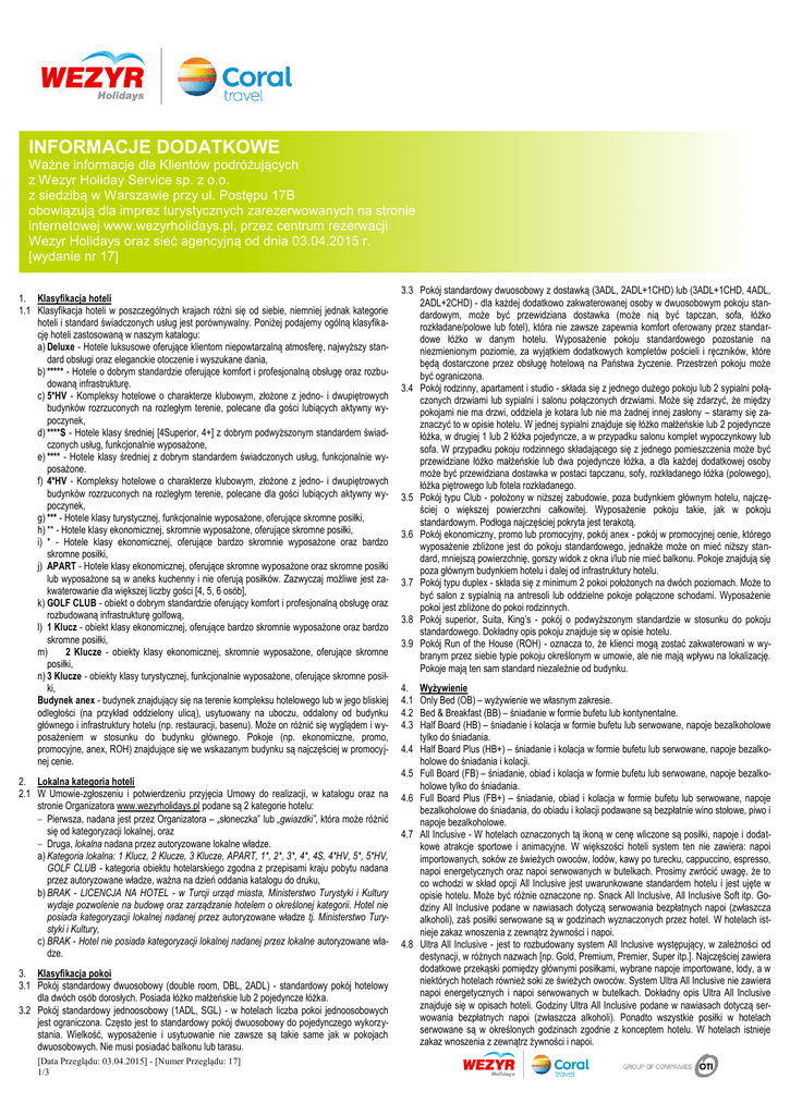 INFORMACJE DODATKOWE Ważne informacje dla Klientów podróżujących z Wezyr Holiday Service sp. z o.o. z siedzibą w Warszawie przy ul. Postępu 17B obowiązują dla imprez turystycznych zarezerwowanych na stronie internetowej www.wezyrholidays.pl, przez centrum rezerwacji Wezyr Holidays oraz sieć agencyjną od dnia 03.04.2015 r. [wydanie nr 17] 1. Klasyfikacja hoteli 1.1 Klasyfikacja hoteli w poszczególnych krajach różni się od siebie, niemniej jednak kategorie hoteli i standard świadczonych usług jest porównywalny. Poniżej podajemy ogólną klasyfikację hoteli zastosowaną w naszym katalogu: a) Deluxe - Hotele luksusowe oferujące klientom niepowtarzalną atmosferę, najwyższy standard obsługi oraz eleganckie otoczenie i wyszukane dania, b) ***** - Hotele o dobrym standardzie oferujące komfort i profesjonalną obsługę oraz rozbudowaną infrastrukturę. c) 5*HV - Kompleksy hotelowe o charakterze klubowym, złożone z jedno- i dwupiętrowych budynków rozrzuconych na rozległym terenie, polecane dla gości lubiących aktywny wypoczynek, d) ****S - Hotele klasy średniej [4Superior, 4+] z dobrym podwyższonym standardem świadczonych usług, funkcjonalnie wyposażone, e) **** - Hotele klasy średniej z dobrym standardem świadczonych usług, funkcjonalnie wyposażone. f) 4*HV - Kompleksy hotelowe o charakterze klubowym, złożone z jedno- i dwupiętrowych budynków rozrzuconych na rozległym terenie, polecane dla gości lubiących aktywny wypoczynek, g) *** - Hotele klasy turystycznej, funkcjonalnie wyposażone, oferujące skromne posiłki, h) ** - Hotele klasy ekonomicznej, skromnie wyposażone, oferujące skromne posiłki, i) * - Hotele klasy ekonomicznej, oferujące bardzo skromnie wyposażone oraz bardzo skromne posiłki, j) APART - Hotele klasy ekonomicznej, oferujące skromne wyposażone oraz skromne posiłki lub wyposażone są w aneks kuchenny i nie oferują posiłków. Zazwyczaj możliwe jest zakwaterowanie dla większej liczby gości [4, 5, 6 osób], k) GOLF CLUB - obiekt o dobrym standardzie oferujący komfort i profesjonalną obsługę oraz rozbudowaną infrastrukturę golfową, l) 1 Klucz - obiekt klasy ekonomicznej, oferujące bardzo skromnie wyposażone oraz bardzo skromne posiłki, m) 2 Klucze - obiekty klasy ekonomicznej, skromnie wyposażone, oferujące skromne posiłki, n) 3 Klucze - obiekty klasy turystycznej, funkcjonalnie wyposażone, oferujące skromne posiłki, Budynek anex - budynek znajdujący się na terenie kompleksu hotelowego lub w jego bliskiej odległości (na przykład oddzielony ulicą), usytuowany na uboczu, oddalony od budynku głównego i infrastruktury hotelu (np. restauracji, basenu). Może on różnić się wyglądem i wyposażeniem w stosunku do budynku głównego. Pokoje (np. ekonomiczne, promo, promocyjne, anex, ROH) znajdujące się we wskazanym budynku są najczęściej w promocyjnej cenie. 2. Lokalna kategoria hoteli 2.1 W Umowie-zgłoszeniu i potwierdzeniu przyjęcia Umowy do realizacji, w katalogu oraz na stronie Organizatora www.wezyrholidays.pl podane są 2 kategorie hotelu: Pierwsza, nadana jest przez Organizatora – „słoneczka” lub „gwiazdki”, która może różnić się od kategoryzacji lokalnej, oraz Druga, lokalna nadana przez autoryzowane lokalne władze. a) Kategoria lokalna: 1 Klucz, 2 Klucze, 3 Klucze, APART, 1*, 2*, 3*, 4*, 4S, 4*HV, 5*, 5*HV, GOLF CLUB - kategoria obiektu hotelarskiego zgodna z przepisami kraju pobytu nadana przez autoryzowane władze, ważna na dzień oddania katalogu do druku, b) BRAK - LICENCJA NA HOTEL - w Turcji urząd miasta, Ministerstwo Turystyki i Kultury wydaje pozwolenie na budowę oraz zarządzanie hotelem o określonej kategorii. Hotel nie posiada kategoryzacji lokalnej nadanej przez autoryzowane władze tj. Ministerstwo Turystyki i Kultury, c) BRAK - Hotel nie posiada kategoryzacji lokalnej nadanej przez lokalne autoryzowane władze. 3. Klasyfikacja pokoi 3.1 Pokój standardowy dwuosobowy (double room, DBL, 2ADL) - standardowy pokój hotelowy dla dwóch osób dorosłych. Posiada łóżko małżeńskie lub 2 pojedyncze łóżka. 3.2 Pokój standardowy jednoosobowy (1ADL, SGL) - w hotelach liczba pokoi jednoosobowych jest ograniczona. Często jest to standardowy pokój dwuosobowy do pojedynczego wykorzystania. Wielkość, wyposażenie i usytuowanie nie zawsze są takie same jak w pokojach dwuosobowych. Nie musi posiadać balkonu lub tarasu. [Data Przeglądu: 03.04.2015] - [Numer Przeglądu: 17] 1/3 3.3 Pokój standardowy dwuosobowy z dostawką (3ADL, 2ADL+1CHD) lub (3ADL+1CHD, 4ADL, 2ADL+2CHD) - dla każdej dodatkowo zakwaterowanej osoby w dwuosobowym pokoju standardowym, może być przewidziana dostawka (może nią być tapczan, sofa, łóżko rozkładane/polowe lub fotel), która nie zawsze zapewnia komfort oferowany przez standardowe łóżko w danym hotelu. Wyposażenie pokoju standardowego pozostanie na niezmienionym poziomie, za wyjątkiem dodatkowych kompletów pościeli i ręczników, które będą dostarczone przez obsługę hotelową na Państwa życzenie. Przestrzeń pokoju może być ograniczona. 3.4 Pokój rodzinny, apartament i studio - składa się z jednego dużego pokoju lub 2 sypialni połączonych drzwiami lub sypialni i salonu połączonych drzwiami. Może się zdarzyć, że między pokojami nie ma drzwi, oddziela je kotara lub nie ma żadnej innej zasłony – staramy się zaznaczyć to w opisie hotelu. W jednej sypialni znajduje się łóżko małżeńskie lub 2 pojedyncze łóżka, w drugiej 1 lub 2 łóżka pojedyncze, a w przypadku salonu komplet wypoczynkowy lub sofa. W przypadku pokoju rodzinnego składającego się z jednego pomieszczenia może być przewidziane łóżko małżeńskie lub dwa pojedyncze łóżka, a dla każdej dodatkowej osoby może być przewidziana dostawka w postaci tapczanu, sofy, rozkładanego łóżka (polowego), łóżka piętrowego lub fotela rozkładanego. 3.5 Pokój typu Club - położony w niższej zabudowie, poza budy