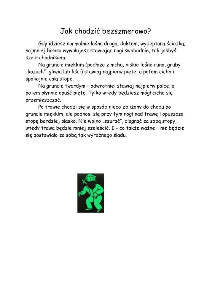 Jak chodzić bezszmerowo? Gdy idziesz normalnie leśną drogą, duktem, wydeptaną ścieżką, najmniej hałasu wywołujesz stawiając nogi swobodnie, tak jakbyś szedł chodnikiem. Na gruncie miękkim (podłoże z mchu, niskie leśne runo, gruby „kożuch” igliwia lub liści) stawiaj najpierw piętę, a potem cicho i spokojnie całą stopę. Na gruncie twardym – odwrotnie: stawiaj najpierw palce, a potem płynnie opuść piętę. Tylko wtedy będziesz mógł cicho się przemieszczać. Po trawie chodzi się w sposób nieco zbliżony do chodu po gruncie miękkim, ale podnosi się przy tym nogi nad trawę i opuszcza stopę bardziej płasko. Nie wolno „szurać”, ciągnąć za sobą stopy, wtedy trawa będzie mniej szeleścić. I - co także ważne – nie będzie się zostawiało za sobą tak wyraźnego śladu. Jak się maskować? W naturalnym tle wszystkie obiekty posiadające ostre formy geometryczne rażą swoją obecnością, swoją obcością i natychmiast rzucają się w oczy (np. rozstawione namioty, różnego rodzaju domki). Natomiast obiekty specyficzne dla danego środowiska (np. kopki siana, stare stogi, kupy chrustu) nie wyróżniają się zbytnio. To samo dotyczy barw. Jaskrawa czerwień kurtki sportowej rzuca się w oczy na tle wiosennej zieleni. Zresztą w terenie leśno – polowym rażą oko nie tylko duże jednobarwne płaszczyzny ubioru, ale także części jasne, wypolerowane, świecące. Te przedmioty potrafią odbijać promienie słoneczne, a przy ruchu zdradzają naszą obecność. Mogą to być okulary, szkła od zegarków, soczewki od aparatów fotograficznych, a nawet sprzączki przy pasie. Cień jest z jednej strony zjawiskiem sprzyjającym maskowaniu, z drugiej jednak strony może nas łatwo zdradzić, szczególnie wtedy, gdy słońce jest nisko. Jeżeli musisz zbliżyć się do obiektu obserwacji, dokonać niezbędnego przemieszczenia, nie pokonuj drogi, np. szczytem pagórka, gdyż wtedy niechybnie zostaniesz dostrzeżony. Nie pokazuj się w „całej okazałości” na tle jasnych ścian zwartej roślinności. Zawsze wykorzystuj doskonale maskujące kupy kamieni, niewielki różnokształtne krzewy, gdyż mają one liczne obszary cieni i półcieni. Niezwykle ważne jest także umiejętne i bezszmerowe poruszanie się po terenie. Szczególnie w grupie nawet dwu-, trzyosobowej konieczna jest przecież jakaś wymiana zdań. Trzeba to robić bardzo cicho, a najlepiej używając prostych gestów porozumiewawczych, by nie zdradzić swojego położenia. Maksimum ciszy i minimum ruchu! O czym mówią zwierzęta? Komar uciekając przed niebezpieczeństwem wydaje specyficzne brzęczenie skrzydłami, na którego odgłos uciekają również inne komary Dzięcioły „grają” na sękach lub suchych pniach, uderzając w nie bardzo szybko swoim mocnym dziobem. Każdy dzięcioł stuka w innym rytmie. Znawcy potrafią przy tym określić z dużą dokładnością – czy dzięcioł „gra” na swoim terytorium, czy ma zamiar zająć cudze, a może wabi samiczkę i chce jej pokazać miejsce wybrane na gniazdo Dawno temu sądzono, że ptaki śpiewają po to, by umilić ludziom życie. To stwierdzenie było miłe, ale nie prawdziwe. Śpiew ptaków spełnia różnorakie funkcje. Ptak śpiewa dla umilenia swej małżonce trudnych chwil wysiadywania piskląt. Śpiewem ptak „ochrania” swoje terytorium. Śpiew jest także częścią rytuału godowego: ma na celu przywołanie samiczki. Środkiem komunikowania się u zwierząt są także substancje zapachowe, wydzielana przez ich organizmy. Kuny i lisy na przykład tak nasycają nimi swoje terytoria, że czuje je nawet człowiek. Lisy i wilki mają swego rodzaju „słupy graniczne” – drzewa, krzewy, leżące pnie, kamienie – które często zwilżają moczem o charakterystycznym zapachu. Gruczoły zapachowe u dzikich ssaków występują przeważnie w miejscach, którymi zwierzęta ocierają się o trawę, krzewy, pnie; u kuny np. na podeszwach łap, u sarn – za porożem, u zajęcy i królików – również na wargach. Traperskie biuro prognozy pogody (część I) Ptaki: Wrona przed deszczem kracze nastroszona z opuszczonymi skrzydłami na gałęzi lub parkanie, jakby zgarbiona: głos ma wtedy głuchy, z chrypą. Wróży ładną pogodę, gdy jest ruchliwa, a kracze głosem dźwięcznym i wyraźnym. Gdy wrony zasiadają na nocleg wszystkie głowami w jedną stronę, należy oczekiwać wiatru z tej właśnie strony, w którą zwróciły głowy. Na dobrą pogodę obsiadują drzewa byle jak. Skowronek koncertujący wysoko nad polami od rana – przepowiada dobra pogodę na cały dzień. Jeśli nawet krząta się na ziemi, żeruje – jest to również oznaką nadejścia dobrej pogody. Jeśli zaś milczy i nie przejawia aktywności oznacza to, że spodziewa się deszczu. Również słowik jest dość pewnym przepowiadaczem. Jeśli daje się słyszeć jego nie milknący koncert przez całą noc – nazajutrz będzie „murowana” pogoda bez opadów. Jaskółki nisko latają – będzie deszcz. Znamy ten wskaźnik pogody od dawna, sprawdza się również. Ale to nie same jaskółki latają nisko; one po prostu polują w tym czasie na owady, które zwiększona wilgoć powietrza „przygniata” ku powierzchni ziemi. Pod wieczór przepowiednie jaskółek nie zawsze się sprawdzają, bo owady też opuszczają się na nocleg nisko. Nie przewiduj pogody na podstawie zachowania się jaskółek brzegówek; niezależnie od pogody mają zwyczaj latania bardzo Traperskie biuro prognozy pogody (część II) Owady: Jeżeli wieczorem pszczoły pracują długo i powracają do ula późno – oczekuj nazajutrz deszczowej pogody. Jeśli wieczorem wcześnie kończą swój trud – będzie ładna pogoda. Gdy pszczoły nie wylatują od rana zbierać nektaru i pyłku, siedzą w ulu i brzęczą – w ciągu najbliższych 6 – 8 godzin możesz spodziewać się deszczu. Jeśli w jasny słoneczny dzień daje się zaobserwować masowy powrót 