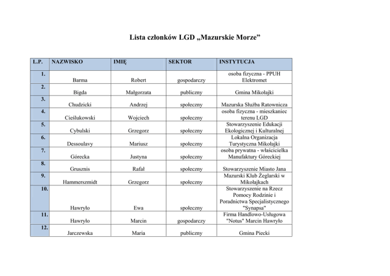 Lista członków LGD „Mazurskie Morze” L.P. NAZWISKO IMIĘ SEKTOR INSTYTUCJA Barma Robert gospodarczy osoba fizyczna - PPUH Elektromet Bigda Małgorzata publiczny Gmina Mikołajki Chudzicki Andrzej społeczny Cieślukowski Wojciech społeczny Cybulski Grzegorz społeczny Dessoulavy Mariusz społeczny Górecka Justyna społeczny Mazurska Służba Ratownicza osoba fizyczna - mieszkaniec terenu LGD Stowarzyszenie Edukacji Ekologicznej i Kulturalnej Lokalna Organizacja Turystyczna Mikołajki osoba prywatna - właścicielka Manufaktury Góreckiej Grusznis Rafał społeczny Hammerszmidt Grzegorz społeczny Hawryło Ewa społeczny Hawryło Marcin gospodarczy Stowarzyszenie Miasto Jana Mazurski Klub Żeglarski w Mikołajkach Stowarzyszenie na Rzecz Pomocy Rodzinie i Poradnictwa Specjalistycznego "Synapsa" Firma Handlowo-Usługowa "Notus" Marcin Hawryło Jarczewska Maria publiczny Gmina Piecki 1. 2. 3. 4. 5. 6. 7. 8. 9. 10. 11. 12. Kaczmarczyk Marek społeczny Stowarzyszenie nad Nidzkim w Rucianem Nidzie Kamiński Eligiusz publiczny Centrum Kultury "Kłobuk" Kizling Dariusz publiczny/społeczny Gmina Orzysz Kizling Katarzyna społeczny osoba fizyczna - nauczyciel Kowalczyk Tadeusz społeczny Konefał Zbigniew społeczny Krzywiński Andrzej społeczny Kubicka Walentyna gospodarczy osoba fizyczna - nauczyciel Strażnicy Nietlickich Bagien Mazurska Straż Ochrony osoba fizyczna - właściciel Parku Dzikich Zwierząt osoba fizyczna - Biuro Rachunkowe Leszczyńska Grażyna Anna publiczny Leszczyński Jan gospodarczy Łukasik Leszek Społeczny Małecka Katarzyna gospodarczy Małecki Marek gospodarczy Markiewicz Bogdan społeczny Mataj Aldona społeczny 13. 14. 15. 16. 17. 18. 19. 20. 21. 22. 23. 24. 25. 26. 27. Gmina Pisz osoba fizyczna - działalność gospodarcza osoba fizyczna - rolnik, leśniczy, 8 sztuk koników polskich, 22 ha Warmińsko-Mazurski Bank Spółdzielczy osoba fizyczna - Katarzyna Małecka Marek Małecki Spółka Cywilna Koliberek Stowarzyszenie Turystyczne "Śniardwy-Nowe Guty" Orzyskie Stowarzyszenie Terapeutów i Animatorów Kultury 28. Mielczarczyk Bogdan społeczny Musik Krzysztof społeczny Niedbalscy Sławomir społeczny Niedbalska Anna społeczny Pęczek Dorota społeczny osoba fizyczna Stowarzyszenie Przyjaciół Wojnowa Stowarzyszenie Na Rzecz Rozwoju Turystyki Wiejskiej Potocki Aleksander gospodarczy osoba fizyczna Roehrig Magdalena społeczny Rutkowski Wiesław społeczny osoba fizyczna Warmińsko Mazurska Izba Rolnicza Siwonia Henryk społeczny osoba fizyczna Siwonia Joanna społeczny Siwonia Wanda gospodarczy osoba fizyczna – rolnik "Przygoda" Usługi Turystyczne Dla Dzieci i Młodzieży - Wanda Siwonia Słonawski Sławomir publiczny Gmina Biała Piska Sokołowska Beata publiczny Powiat Piski Syta Karol publiczny Szymankiewicz Beata społeczny Gmina Ruciane – Nida Stowarzyszenie Kultury Nieestradowej im. M. Kajki w Ogródku 29. Koło PZW "Śniardwy" Stowarzyszenie Sportowe "Pegaz" 30. 31. 32. 33. 34. 35. 36. 37. 38. 39. 40. 41. 42. 43. Ochotnicza Straż Pożarna w Grabówce Szymczyk Bolesław społeczny Truszkowska Larysa społeczny Wieczorek Stanisław gospodarczy Wodziński Cezary społeczny Wróbel Joanna społeczny Ciukszo Kinga społeczny Zęgota Zbigniew społeczny Zyskowska Renata społeczny Kragiel Marek Gospodarczy Wiszowaty Cezary gospodarczy Chróst Ryszard publiczny osoba fizyczna – rolnik Stowarzyszenie Miłośników Kultury "Nasza Biała" Gospodarstwo Rybackie „Śniardwy” Sp. z.o.o Gospodarstwo Rybackie „Mikołajki” Sp.z.o.o. Zakład Ekologii Mikroorganizmów Kaczmarczyk Marek publiczny Dom Kultury Ruciane-Nida Szymankiewicz Beata publiczny Dom Kultury w Orzyszu Ptak Kazimierz Społeczny Rybak Pisiak Robert Społeczny Społeczny Rybak Czyżewski Andrzej 44. 45. osoba fizyczna – radna osoba fizyczna wypożyczalnia kajaków 46. 47. 48. osoba fizyczna – filozof Stowarzyszenie Oświatowo Kulturalne Zełwągi Lokalna Organizacja Turystyczna "Mazury Południowe" 49. 50. 51. 52. 53. 54. 55. 56. 57. 58. Rybak Społeczny 59. Grabowski Jerzy Grabowski Wiesław Rybak Społeczny 60. Rybak Społeczny 61. Marchewka Adam Wróblewski Andrzej Rybak Społeczny 62. Rybak Społeczny 63. Magalas Irena Lubiecka Elżbieta Sawa Władysław Rybak Społeczny 64. Rybak Społeczny 65. Rybak Społeczny 66. Jawor Jerzy Orłowski Zdzisław Rybak Społeczny 67. Rybak Społeczny 68. Ruszewski Wojciech Faron Piotr Kucner Helena Rybak Społeczny 69. Rybak Społeczny 70. Rybak Społeczny 71. Petrykowski Walenty Wołczak Adam Rybak Społeczny 72. Rybak Społeczny 73. Czekajło Waldemar Kulik Kazimierz Legacki Jerzy Rybak Społeczny 74. Rybak Społeczny 75. Rybak Społeczny 76. Piasecki Arkadiusz Nalepa Adam Rybak Społeczny 77. Rybak Społeczny 78. Klimek Krystyna Szymański Marian Rybak Społeczny 79. Rybak Społeczny 80. Kierzkowska Grażyna Wiszowaty Cezary Aścik Adam Rybak 81. 82. gospodarczy Społeczny Rybak Rybak Społeczny 83. Pieńskowski Krzysztof Kwast Bernhardt Rybak Społeczny 84. Rybak Społeczny 85. Kwast Ewa Cichocki Stanisław Stępień Celina Rybak Społeczny 86. Rybak Społeczny 87. Rybak Społeczny 88. Stępień Zygfryd Urban Jerzy, Edwin Rybak Społeczny 89. Rybak Społeczny 90. Stępień Waldemar Michalski Marek Kwast Adam Rybak Społeczny 91. Rybak Społeczny 92. Rybak 93. Gworek Mirosław gospodarczy Lisowski Karol gospodarczy Gospodarstwo Rybackie PZW w Suwałkach Czeraniuk Józef społeczny Rybak Witkowski Zbigniew Społeczny Bućko Jacek Społeczny Witkiewicz Adam Społeczny 94. 95. 96. 97. FHU "DANET" 98. Zawalich Hanna Publiczny Miejsko-Gminny Ośrodek Kultury w Białej Piskiej Zawalich Hanna Publiczny Biblioteka Publiczna Puzio Edmund Gospodarczy Przedsiębiorca Tymiński Piotr Społeczny Żebrowska Ewa Gospodarczy Kiśluk Jacek Społeczny Konefał Witold gospodarczy Ks. Juroszek Bogusław Społeczny Adamiec Józef społeczny Konefał Anna gospodarczy 99. 100. 101. 102. 103. 104. F.H.U. "JUKA" Uczniowski Klub Sportowy "Hetman" 105. 106. 107. 
