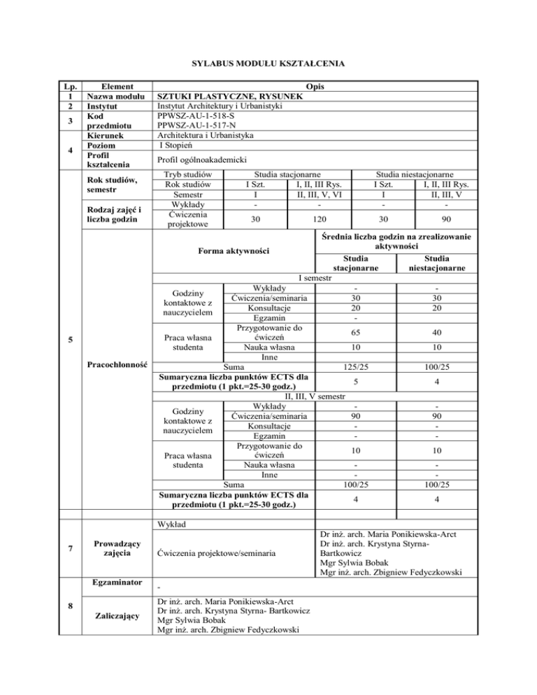 SYLABUS MODUŁU KSZTAŁCENIA Lp. 1 2 3 4 Element Nazwa modułu Instytut Kod przedmiotu Kierunek Poziom Profil kształcenia Opis SZTUKI PLASTYCZNE, RYSUNEK Instytut Architektury i Urbanistyki PPWSZ-AU-1-518-S PPWSZ-AU-1-517-N Architektura i Urbanistyka I Stopień Profil ogólnoakademicki Tryb studiów Rok studiów Semestr Wykłady Ćwiczenia projektowe Rok studiów, semestr Rodzaj zajęć i liczba godzin 5 Pracochłonność Studia stacjonarne I Szt. I, II, III Rys. I II, III, V, VI 30 120 Studia niestacjonarne I Szt. I, II, III Rys. I II, III, V 30 90 Średnia liczba godzin na zrealizowanie aktywności Forma aktywności Studia Studia stacjonarne niestacjonarne I semestr Wykłady Godziny Ćwiczenia/seminaria 30 30 kontaktowe z Konsultacje 20 20 nauczycielem Egzamin Przygotowanie do 65 40 ćwiczeń Praca własna studenta Nauka własna 10 10 Inne Suma 125/25 100/25 Sumaryczna liczba punktów ECTS dla 5 4 przedmiotu (1 pkt.=25-30 godz.) II, III, V semestr Wykłady Godziny Ćwiczenia/seminaria 90 90 kontaktowe z Konsultacje nauczycielem Egzamin Przygotowanie do 10 10 ćwiczeń Praca własna studenta Nauka własna Inne Suma 100/25 100/25 Sumaryczna liczba punktów ECTS dla 4 4 przedmiotu (1 pkt.=25-30 godz.) Wykład 7 Prowadzący zajęcia Egzaminator 8 Zaliczający Ćwiczenia projektowe/seminaria Dr inż. arch. Maria Ponikiewska-Arct Dr inż. arch. Krystyna Styrna- Bartkowicz Mgr Sylwia Bobak Mgr inż. arch. Zbigniew Fedyczkowski Dr inż. arch. Maria Ponikiewska-Arct Dr inż. arch. Krystyna StyrnaBartkowicz Mgr Sylwia Bobak Mgr inż. arch. Zbigniew Fedyczkowski 9 Wymagania (kompetencje) wstępne 10 Cel przedmiotu 11 Efekty kształcenia 12 Forma i warunki potwierdzenia efektu kształcenia 1. Znajomość podstawowych zasad dotyczących perspektywy (perspektywa z jednym oraz wieloma punktami zbiegu). 2. Umiejętność rysowania i konstruowania brył: sześcianu, prostopadłościanu, ostrosłupa oraz walca. 3. Podstawowe wiadomości dotyczące techniki rysowania ołówkiem: kreska, walor, światłocień. 4. Wstępne wiadomości dotyczące kompozycji. 5. Pozytywnie zdany egzamin wstępny z rysunku. C1- Kształtowanie umiejętności studiów z natury oraz twórczej interpretacji. rzeczywistości. C2- Pogłębienie zdobytych wiadomości o perspektywie i praktyczne jej zastosowanie. C3- Szlifowanie warsztatu plastycznego; zapoznanie z różnymi technikami rysunku C4- Rozwijanie wrażliwości przestrzennej, plastycznej i kompozycyjnej. C5- Przygotowanie wszechstronnego warsztatu przyszłego architekta, projektanta. Odniesienie do Odniesienie do Efekt (Wiedza, Umiejętności, Kompetencje efektów efektów społeczne) kierunkowych obszarowych Zna i rozumie zasady rysowania K_W02 T1A_W01 W1 i konstruowania obiektów w K_W03 T1A_W07 przestrzeni Zna różne techniki plastyczne, T1A_W03 W2 narzędzia rysunkowe oraz K_W17 Wiedza T1A_W04 zasady komponowania Ma wiedzę z historii sztuki i T1A_W03 aktualnych działań w obszarze W3 K_W14 T1A_W04 architektury i sztuki współczesnej Potrafi swobodnie i twórczo T1A _U08 operować kreską, plamą barwną U1 K_U15 T1A_U09 i walorem uwzględniając zasady InzA_U07 perspektywy Potrafi umiejętnie łączyć Umiejętność U2 poznane techniki plastyczne w K_U27 T1A_U16 rysunku, projekcie Potrafi świadomie komponować T1A_U01 U3 i kreować przestrzeń na K_U01 T1A_U13 płaszczyźnie Rozumie potrzebę i zna możliwości ciągłego Kompetencje dokształcania się — K1 K_K01 T1A_K01 społeczne podnoszenia kompetencji zawodowych, osobistych i społecznych Efekt Sposób potwierdzenia (weryfikacji) kształcenia Poprawne konstruowanie obiektów rysunkowych, zgodnie z zasadami W1 geometrii i perspektywy – ćwiczenia, egzamin z rysunku Operowanie różnymi technikami i narzędziami w tworzeniu rysunków, W2 projektów, zgodnie z zasadami kompozycji i tematem danego ćwiczenia Świadome i kreatywne inspiracje zagadnieniami ze sztuki W3 współczesnej i historii sztuki Poprawne tworzenie projektów i rysunków, z natury i wyobraźni – U1 klauzura (zadanie wykonane w czasie ćwiczeń, ale samodzielnie bez korekt prowadzącego) Estetyczne i ciekawe opracowanie rysunków, projektów z U2 wykorzystaniem zróżnicowanych możliwości warsztatu rysunkowego Umiejętność realizowania zróżnicowanych tematów rysunkowych z U3 natury i wyobraźni K1 Poszerzanie zdobytych wiadomości i umiejętności, podnoszenie 13 Treści merytoryczne przedmiotu 14 Wykaz literatury podstawowej 15 Wykaz literatury uzupełniającej (pomocniczej) kwalifikacji 1. Poszerzenie wiadomości o konstrukcji brył: sześcianu, prostopadłościanu, elipsy i praktycznym ich zastosowaniu w rysunku architektonicznym. 2. Rozwinięcie wiadomości o perspektywie: siatka zbiegów, perspektywa z jednym i wieloma punktami zbiegu (widok brył z góry- z lotu ptaka i od dołu – p. żabia) 3. Rodzaje kompozycji; cechy kompozycji dynamicznej i statycznej, otwartej i zamkniętej, kadrowanie. 4. Kształtowanie umiejętności studiów z natury, myślenia przestrzennego oraz swobodnej i twórczej interpretacji rzeczywistości 5. Kreska, walor, plama barwna i ich wzajemne relacje sposobem wyrażania przestrzeni na płaszczyźnie. 6. Projektowanie wnętrza – przedstawienie rozwiązań architektonicznych, funkcja, konstrukcja. 7. Poszerzanie warsztatu plastycznego, wykorzystanie różnorodnych technik rysunkowych, malarskich. 8. Projekt witrażu, collage, oraz inne ćwiczenia projektowe rozbudzające wrażliwość i zainteresowanie szeroko pojętą sztuką, miejscem architektury we współczesnym świecie. 9. Rysunki z wyobraźni i z natury o charakterze architektonicznym. 1. J. Bruzda, Szkice architektoniczne, , Wyd. Politechnika Krakowska, Kraków 1993 2. W. Franzblau, M. Gałek, M. Uruszczak, Podstawy rysunku architektonicznego, , Wyd. „Atropos” Kraków 3. T. Romaszkiewicz- Białas, Perspektywa praktyczna dla architektów, Oficyna Wydawnicza Politechniki Wrocławskiej 4. R. Smitch, M. Wright, J. Horton, Szkoła rysowan