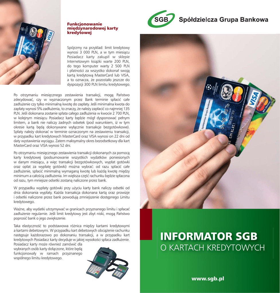 Funkcjonowanie międzynarodowej karty kredytowej Spójrzmy na przykład: limit kredytowy wynosi 3 000 PLN, a w tym miesiącu Posiadacz karty zakupił w sklepie Internetowym książki warte 200 PLN, do tego komputer warty 2 500 PLN i płatności za wszystko dokonał swoją kartą kredytową MasterCard lub VISA, a to oznacza, że pozostało jeszcze do dyspozycji 300 PLN limitu kredytowego. Po otrzymaniu miesięcznego zestawienia transakcji, mogą Państwo zdecydować, czy w wyznaczonym przez Bank terminie spłacić całe zadłużenie czy tylko minimalną kwotę do zapłaty. Jeśli minimalna kwota do zapłaty wynosi 5% zadłużenia, to znaczy, że należy zapłacić co najmniej 135 PLN. Jeśli dokonana zostanie spłata całego zadłużenia w kwocie 2 700 PLN, w kolejnym miesiącu Posiadacz karty będzie mógł dysponować pełnym limitem, a bank nie naliczy żadnych odsetek (pod warunkiem, iż w tym okresie kartą będą dokonywane wyłącznie transakcje bezgotówkowe). Spłaty należy dokonać w terminie oznaczonym na zestawieniu transakcji, w przypadku kart kredytowych MasterCard oraz VISA wynosi on 22 dni od daty wystawienia wyciągu. Zatem maksymalny okres bezodsetkowy dla kart MasterCard oraz VISA wynosi 52 dni. Po otrzymaniu miesięcznego zestawienia transakcji dokonanych za pomocą karty kredytowej (podsumowanie wszystkich wydatków poniesionych w danym miesiącu, a więc transakcji bezgotówkowych, wypłat gotówki oraz opłat za wypłatę gotówki) można wybrać: od razu spłacić całe zadłużenie, spłacić minimalną wymaganą kwotę lub każdą kwotę między minimum a całością zadłużenia. Im większa część rachunku będzie spłacona od razu, tym mniejsze odsetki zostaną naliczone przez bank. W przypadku wypłaty gotówki przy użyciu karty bank naliczy odsetki od dnia dokonania wypłaty. Każda transakcja dokonana kartą oraz prowizje i odsetki naliczone przez bank powodują zmniejszenie dostępnego Limitu kredytowego. Ważne, aby wydatki utrzymywać w granicach przyznanego limitu i spłacać zadłużenie regularnie. Jeśli limit kredytowy jest zbyt niski, mogą Państwo poprosić bank o jego zwiększenie. Taka elastyczność to podstawowa różnica między kartami kredytowymi a kartami debetowymi. W przypadku kart debetowych obciążenie rachunku następuje każdorazowo po dokonaniu transakcji, a w przypadku kart kredytowych Posiadacz karty decyduje w jakiej wysokości spłaca zadłużenie. Posiadacz karty może również zamówić dla wybranych osób karty dołączone, które będą funkcjonowały w ramach przyznanego wspólnego limitu kredytowego. INFORMATOR SGB O KARTACH KREDYTOWYCH www.sgb.pl Prosta i bezpieczna zapłata Indywidualny limit kredytowy dopasowany do stylu życia Spłata kredytu dokonywana w dowolnym tempie Nowoczeny sposób zarządzania budżetem Swoboda dysponowania pieniędzmi Posiadacz karty kredytowej może posługiwać się kartą do wysokości przyznanego przez bank limitu kredytowego, z uwzględnieniem limitów dziennych. Banki Spółdzielczej Grupy Bankowej oferują Państwu następujące karty kredytowe: . . krajową kartę kredytową MasterCard Electronic międzynarodowe karty kredytowe VISA oraz MasterCard Wygoda, której potrzebujesz Krajowa karta kredytowa MasterCard Electronic Aby móc w łatwysposób, w każdym miejscu i o każdej porze dokonywać płatności należy dobrze poznać karty kredytowe. Za pomocą karty kredytowej MasterCard Electronic można dokonywać zarówno transakcji gotówkowych, jak i płatności bezgotówkowych w terminalach POS. Karta kredytowa jest właściwą odpowiedzią na Państwa codzienne potrzeby. Wystarczy jeden podpis lub PIN, aby zrobić zakupy lub pobrać gotówkę praktycznie w dowolnym miejscu i o każdej porze. Bezpieczeństwo, na które zasługujesz Nie zawsze trzeba mieć w kieszeni gotówkę, bo używając karty kredytowej zawsze można z niej skorzystać! A w czasie podróży jest ona bezpiecznym sposobem kupowania wszystkiego bez konieczności zaprzątania sobie głowy wymianą waluty (dotyczy to kart międzynarodowych). Karta kredytowa to idealne rozwiązanie, które czyni Państwa życie znacznie łatwiejszym. Karta kredytowa sprawia, że nie przeoczy się okazji w sklepie, a także daje poczucie bezpieczeństwa wnieprzewidzianych sytuacjach finansowych. Wolność, której pragniesz Karty kredytowej można używać praktycznie wszędzie, odkrywając wygodę i prawdziwą przyjemność, które towarzyszą zakupom. W Polsce i na całym świecie czeka na Państwa niezliczona ilość punktów handlowo-usługowych i bankomatów. Dzięki karcie kredytowej Posiadacz karty dysponuje z góry określonym zapasem środków, który umożliwia kupowanie niemal wszystkiego, wszędzie i o każdej porze, gdzie karta jest akceptowana. Limit kredytowy jest ustalany stosownie do indywidualnych potrzeb, jak również do możliwości finansowych Klienta. W miarę dokonywania zakupów, zmniejsza się dostępna kwota limitu kredytowego. Gdy zostanie spłacona cała wykorzystana kwota kredytu, przywrócona zostaje do Państwa dyspozycji pełna kwota limitu kredytowego karty. Dzięki swojej karcie kredytowej można zarządzać swoim budżetem, za każdym razem, gdy chcemy coś kupić. Po prostu używamy swojej karty! Funkcjonowanie krajowej karty kredytowej Spójrzmy na przykład: limit kredytowy wynosi 5 000 PLN, a w tym miesiącu Posiadacz karty dokonał zakupu płyt CD wartych 100 PLN, do tego telewizor warty 2 500 PLN i zapłacił kartą kredytową MasterCard Electronic, a to oznacza, że pozostało jeszcze do dyspozycji 2 400 PLN. Po otrzymaniu miesięcznego zestawienia transakcji, mogą Państwo zdecydować, czy w wyznaczonym przez Bank terminie spłacić całe zadłużenie czy tylko minimalną kwotę do zapłaty. Minimalna kwota do zapłaty wynosi 5% zadłużenia, to znaczy, że należy zapłacić co najmniej 130 PLN. Jeśli zostanie dokonana spłata całego zadłużenia w kwocie 2 600 PLN, Posiadacz karty b