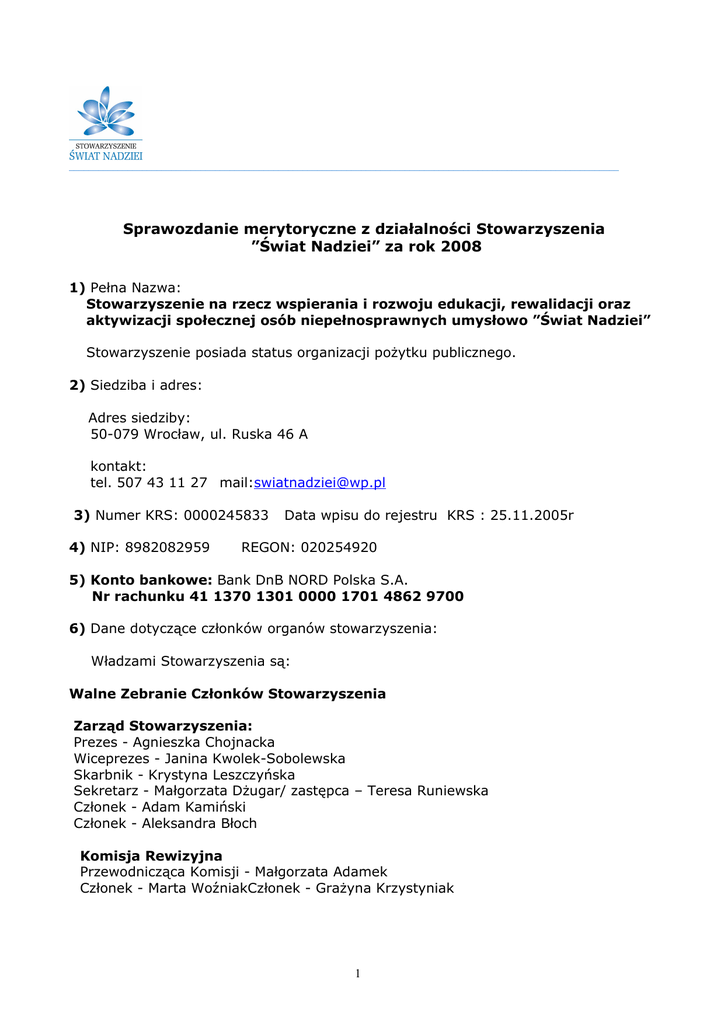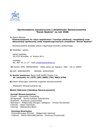 _________________________________________________________________________________________________________________ Sprawozdanie merytoryczne z działalności Stowarzyszenia ”Świat Nadziei” za rok 2008 1) Pełna Nazwa: Stowarzyszenie na rzecz wspierania i rozwoju edukacji, rewalidacji oraz aktywizacji społecznej osób niepełnosprawnych umysłowo ”Świat Nadziei” Stowarzyszenie posiada status organizacji pożytku publicznego. 2) Siedziba i adres: Adres siedziby: 50-079 Wrocław, ul. Ruska 46 A kontakt: tel. 507 43 11 27 mail:[email protected] 3) Numer KRS: 0000245833 4) NIP: 8982082959 Data wpisu do rejestru KRS : 25.11.2005r REGON: 020254920 5) Konto bankowe: Bank DnB NORD Polska S.A. Nr rachunku 41 1370 1301 0000 1701 4862 9700 6) Dane dotyczące członków organów stowarzyszenia: Władzami Stowarzyszenia są: Walne Zebranie Członków Stowarzyszenia Zarząd Stowarzyszenia: Prezes - Agnieszka Chojnacka Wiceprezes - Janina Kwolek-Sobolewska Skarbnik - Krystyna Leszczyńska Sekretarz - Małgorzata Dżugar/ zastępca – Teresa Runiewska Członek - Adam Kamiński Członek - Aleksandra Błoch Komisja Rewizyjna Przewodnicząca Komisji - Małgorzata Adamek Członek - Marta WoźniakCzłonek - Grażyna Krzystyniak 1 7) Cele statutowe : Celem Stowarzyszenia jest prowadzenie działalności na rzecz osób niepełnosprawnych umysłowo, poprawa jakości życia, rewalidacji i edukacji tych osób oraz stwarzanie szansy na ich lepsze funkcjonowanie i integrację w społeczeństwie, w szczególności : a/ działania edukacyjno-rewalidacyjne - propagowanie i rozwijanie nowoczesnych form i metod edukacji i rewalidacji - prowadzenie zajęć w tym zakresie b/ promowanie kultury fizycznej i sportu osób niepełnosprawnych c/ wspieranie aktywności twórczej osób i promowanie uczestnictwa osób niepełnosprawnych w życiu kulturalnym d/ wsparcie i pomoc rodzinom i opiekunom wychowującym dzieci niepełnosprawne e/ upowszechnianie i ochrona praw osób niepełnosprawnych umysłowo - współpraca z organizacjami i instytucjami działającymi na rzecz praw osób niepełnosprawnych - wspieranie i ochronę działań na rzecz tych osób. 8) Prowadzenie działalności gospodarczej – nie dotyczy 9) Opis działalności prowadzonej w roku 2008: W roku 2008 Stowarzyszenie Świat Nadziei realizowało zadania w ramach Programu Aktywizacji Społecznej Osób Niepełnosprawnych Umysłowo „Sztuka Aktywności”. Program stworzony przez nasze stowarzyszenie z myślą o poprawie warunków funkcjonowania społecznego osób z niepełnosprawnością umysłową, realizowany jest od początku 2007 roku. Na realizacje Programu /X-XII.2008r / Stowarzyszenie otrzymało dofinansowanie Urzędu Miejskiego Wrocławia. Celem programu jest : • Umożliwienie osobom niepełnosprawnym umysłowo pełniejszego i aktywnego uczestniczenia w życiu społecznym. • Poprawa jakości życia osób niepełnosprawnych i ich rodzin poprzez poszukiwanie i tworzenie nowych możliwości realizowania się społecznego i zawodowego tych osób. • Zwrócenie uwagi środowisk i instytucji kulturalno-społecznych na problematykę osób niepełnosprawnych umysłowo, zainicjowanie kontaktu i nawiązanie współpracy w tworzeniu przestrzeni do społecznego funkcjonowania tych osób. • Pozyskiwanie współpracy przedsiębiorstw, podmiotów, instytucji, którym bliskie są zasady odpowiedzialności społecznej tzw. corporate social responsibility, oraz propagowanie tych zasad. Działania w zakresie programu obejmują : 1. Organizowanie i prowadzenie zajęć w zakresie aktywizacji społecznej osób 2 niepełnosprawnych umysłowo we współpracy z ważnymi wrocławskimi instytucjami i organizacjami społecznymi, związanymi z kulturą i sztuką. Udział w Programie biorą m.in. : Teatr Polski, Teatr Pieśń Kozła, Zakład Narodowy Imienia Ossolińskich, BWA Wrocław - Galerie Sztuki Współczesnej, Fundacja Wro-Centrum Sztuki Mediów, Gazeta Wyborcza, Czasopismo Ludzka Sprawa, Galeria Miejska, Wydział Ceramiki i Szkła oraz Muzeum Akademii Sztuk Pięknych we Wrocławiu, Galeria Entropia. Współpraca ta obejmuje Odwiedzanie instytucji przez osoby niepełnosprawne umysłowo i uczestniczenie w prezentowanych przez nie wydarzeniach (wystawy, pokazy filmów, spektakle itp.) Zapoznawanie się przez osoby niepełnosprawne z funkcjonowaniem instytucji, obserwowanie i poznawanie specyfiki pracy ludzi zatrudnionych na różnych stanowiskach (artyści, aktorzy, reżyserzy, bibliotekarze, trenerzy, sportowcy, dyrektorzy, muzycy, obsługa techniczna) Wspólnie z dyrekcją i pracownikami instytucji podjęcie próby umożliwienia osobom niepełnosprawnym umysłowo odnalezienia miejsca dla własnej aktywności i społecznego funkcjonowania. Mogą to być jednorazowe lub cykliczne zdarzenia, w których te osoby mogłyby realizować się poprzez działania twórcze lub zdobywanie nowych umiejętności i doświadczenia w pełnieniu obowiązków i działań społecznych takich jak pomaganie w przygotowaniach do przedstawienia lub wystawy, drobne prace porządkowe w bibliotece, galerii sztuki i teatrze, pomoc w szatni, pomoc w czasie wernisażu lub premiery. 2. Organizowanie warsztatów i spotkań artystyczno – edukacyjnych prowadzonych przez artystów, terapeutów, dziennikarzy dających osobom niepełnosprawnym umysłowo możliwości wypowiedzenia się i zaistnienia w społeczeństwie poprzez działania artystyczne. Program kierowany jest do dzieci, młodzieży z niepełnosprawnością umysłową z terenu Wrocławia. Udział w warsztatach biorą dzieci i młodzież, podopieczni Stowarzyszenia Świat Nadziei, a także ze Stowarzyszenia Ostoja, Stowarzyszenia Handicap oraz z wrocławskich szkól i placówek specjalnych (m.in. z Zespołu Szkół Specjalnych nr 27, Specjalnego Ośrodka Szkolno-Wychowawczego nr 8, Specjalnego Ośrodka Szkolno-Wychowawczego nr10, Rodzinnego Domu Dziecka nr11 ). Łącznie ponad 120 osób. Zaangażowanie poważnych instytucji związanych z