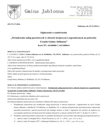 ZP.271.27.2016 Jabłonna, dn. 01.12.2016 r. Ogłoszenie o zamówieniu „Świadczenie usług pocztowych w obrocie krajowym i zagranicznym na potrzeby Urzędu Gminy Jabłonna” Kod CPV: 64100000-7, 64110000-0 SEKCJA I: ZAMAWIAJĄCY I. 1) NAZWA I ADRES: Gmina Jabłonna, ul. ul. Modlińska 152, 05110 Jabłonna, woj. mazowieckie, państwo Polska, tel. 22 767 73 32, e-mail , faks 22 774 38 34. Adres strony internetowej (URL): www.ug.jablonna.ibip.pl I. 2) RODZAJ ZAMAWIAJĄCEGO: Administracja samorządowa Adres strony internetowej, na której zamieszczona będzie specyfikacja istotnych warunków zamówienia: www.ug.jablonna.ibip.pl Oferty lub wnioski o dopuszczenie do udziału w postępowaniu należy przesyłać: Oferty składa się pod rygorem nieważności w formie pisemnej. Adres: Urząd Gminy Jabłonna ul. Modlińska 152, 05-110 Jabłonna SEKCJA II: PRZEDMIOT ZAMÓWIENIA II.1) Nazwa nadana zamówieniu przez zamawiającego: „Świadczenie usług pocztowych w obrocie krajowym i zagranicznym na potrzeby Urzędu Gminy Jabłonna” Numer referencyjny: ZP.271.27.2016 II.2) Rodzaj zamówienia: usługa II.3) Informacja o możliwości składania ofert częściowych Zamówienie podzielone jest na części: Nie II.4) Opis przedmiotu zamówienia oraz określenie wielkości lub zakresu zamówienia: 1. Przedmiotem zamówienia jest świadczenie usług pocztowych w obrocie krajowym i zagranicznym na rzecz Urzędu Gminy Jabłonna z siedzibą 05-110 Jabłonna, ul. Modlińska 152, w zakresie przyjmowania, przemieszczania i doręczania przesyłek pocztowych i paczek pocztowych (do każdego miejsca w kraju i zagranicą) ich zwrotów do nadawcy po wyczerpaniu możliwości ich doręczenia lub wydania adresatowi w okresie od dnia 02.01.2017 r. do dnia 31.12.2017 r. 2. Przedmiot zamówienia będzie realizowany na zasadach określonych w powszechnie obowiązujących przepisach prawa tj: 1) ustawie z dnia 23 listopada 2012 r. Prawo Pocztowe (t.j. Dz. U. z 2016 r., poz. 1113 ze zm.); 2) ustawie z dnia 29 sierpnia 1997 r. Ordynacja Podatkowa (t.j. Dz. U. z 2015 r., poz. 613 ze zm.); 3) ustawie z dnia 14 czerwca 1960 r. Kodeks postępowania administracyjnego (t.j. Dz. U. z 2016 r., poz. 23 ze zm.); 4) międzynarodowymi przepisami pocztowymi w przypadku usług pocztowych w obrocie zagranicznym: Regulamin Poczty Listowej (Dz. U. z 2007 r. nr 108, poz. 744), Regulamin dotyczący paczek pocztowych (Dz. U. z 2007 r., nr 108, poz. 745). 5) Innych aktów prawnych związanych z realizacją usług będących przedmiotem umowy wydanych na podstawie ustaw i rozporządzeń oraz postanowień Specyfikacji Istotnych Warunków Zamówienia. 3. Przedmiot zamówienia obejmuje: 1) usługi pocztowe w obrocie krajowym i zagranicznym dla przesyłek listowych o wadze do 2000 g oraz paczek pocztowych do 10 kg w obrocie krajowym w zakresie ich przyjmowania, przemieszczania i doręczania; 2) doręczanie zwrotów przesyłek listowych niedoręczonych, po wyczerpaniu wszystkich możliwości ich doręczenia lub wydania odbiorcy (z podaniem przyczyny niedoręczenia) oraz zwrot potwierdzeń odbioru pokwitowanych przez adresata do siedziby Zamawiającego; 3) 4. doręczanie Zamawiającemu wszystkich przychodzących za pośrednictwem Wykonawcy przesyłek pocztowych. Przez przesyłki pocztowe będące przedmiotem zamówienia rozumie się: 4.1. przesyłki listowe nierejestrowane (zwykłe) krajowe i zagraniczne, tj. nadane i doręczone bez pokwitowania, 4.2. przesyłki listowe rejestrowane (polecone) krajowe i zagraniczne, tj. przesyłki nadane i doręczone za pokwitowaniem lub z potwierdzeniem odbioru, w tym ze zwrotnym poświadczeniem odbioru zgodnym z Kodeksem postępowania administracyjnego, 4.3. przesyłki pocztowe w obrocie krajowym i zagranicznym przyjmowane na warunkach szczególnych wysyłane będą jako priorytetowe z uwzględnieniem podziału na przesyłki ekonomiczne i priorytetowe oraz gabaryty. Przedmiot umowy będzie realizowany zgodnie z zasadami zawartymi w Specyfikacji Istotnych Warunków Zamówienia i szczegółowym Opisie przedmiotu zamówienia oraz formularzem cenowym. II.5) Kod CPV: 64100000-7, 64110000-0 II.6) Czy przewiduje się udzielenie zamówień, o których mowa w art. 67 ust. 1 pkt 6 i 7 lub w art. 134 ust. 6 pkt 3 ustawy Pzp: nie II.7) Okres, w którym realizowane będzie zamówienie: data zakończenia: 31.12.2017 r. SEKCJA III: INFORMACJE O CHARAKTERZE PRAWNYM, EKONOMICZNYM, FINANSOWYM I TECHNICZNYM III.1) WARUNKI UDZIAŁU W POSTĘPOWANIU O udzielenie zamówienia mogą ubiegać się wykonawcy, którzy: 1. nie podlegają wykluczeniu na podstawie art. 24 ust. 1 ustawy; 2. spełniają warunki udziału w postępowaniu dotyczące: 1) kompetencji lub uprawnień do prowadzenia określonej działalności zawodowej, o ile wynika to z odrębnych przepisów; Określenie warunku: O udzielenie zamówienia mogą się ubiegać wykonawcy posiadający uprawnienia do wykonywania działalności pocztowej na podstawie aktualnego wpisu do rejestru operatorów pocztowych, prowadzanego przez Prezesa Urzędu Komunikacji Elektronicznej zgodnie z art. 6 ustawy z dnia 23 listopada 2012r. Prawo pocztowe (t. j Dz.U. z 2016 r., poz. 1113 ze zm.), pozwalającego na wykonywania działalności pocztowej w zakresie przyjmowania, przemieszczania i doręczania przesyłek w obrocie krajowym i zagranicznym; 2) sytuacji ekonomicznej lub finansowej; Określenie warunku: O udzielenie zamówienia mogą ubiegać się wykonawcy, którzy posiadają dokument potwierdzający, że wykonawca jest ubezpieczony od odpowiedzialności cywilnej w zakresie prowadzonej działalności związanej z przedmiotem zamówienia na sumę gwarancyjną co najmniej 100.000 zł. 3) zdolności technicznej lub zawodowej; Określenie warunków: 1. O udzielenie zamówienia mogą się ubiegać wykonawcy, którzy w ciągu ostatnich trzech lat przed upływem terminu składania ofert, a jeżeli okres prowadzenia działalności jest krótszy – w tym okresie, wykonali należycie, a w przypadku świa