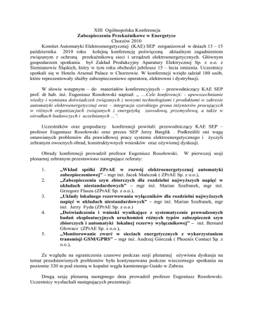 XIII Ogólnopolska Konferencja Zabezpieczenia Przekaźnikowe w Energetyce Chorzów 2010 Komitet Automatyki Elektroenergetycznej (KAE) SEP zorganizował w dniach 13 – 15 października 2010 roku kolejną konferencję poświęconą aktualnym zagadnieniom związanym z ochroną przekaźnikową sieci i urządzeń elektroenergetycznych. Głównym gospodarzem spotkania był Zakład Produkcyjny Aparatury Elektrycznej Sp. z o.o. z Siemianowic Śląskich, który w tym roku obchodzi jubileusz 15 – lecia istnienia. Uczestnicy spotkali się w Hotelu Arsenal Palace w Chorzowie. W konferencji wzięło udział 180 osób, które reprezentowały służby zabezpieczeniowe operatora, elektrowni i dystrybucji. W słowie wstępnym – do materiałów konferencyjnych – przewodniczący KAE SEP prof. dr hab. inż. Eugeniusz Rosołowski napisał: „ …Cele konferencji: - upowszechnianie wiedzy i wymiana doświadczeń związanych z nowymi technologiami i produktami w zakresie automatyki elektroenergetycznej oraz – integracja szerokiego grona inżynierów pracujących w różnych organizacjach związanych z energetyką zawodową, przemysłową, a także w ośrodkach badawczych i uczelnianych ...”. Uczestników oraz gospodarzy konferencji powitali: przewodniczący KAE SEP – profesor Eugeniusz Rosołowski oraz prezes SEP Jerzy Barglik . Podkreślili oni wagę omawianych problemów dla prawidłowej pracy systemu elektroenergetycznego i życzyli zebranym owocnych obrad, konstruktywnych wniosków oraz ożywionej dyskusji. Obrady konferencji prowadził profesor Eugeniusz Rosołowski. plenarnej zebranym przestawiono następujące referaty: 1. 2. 3. 4. 5. W pierwszej sesji „Wkład spółki ZPrAE w rozwój elektroenergetycznej automatyki zabezpieczeniowej” – mgr inż. Jacek Mańczak ( ZPrAE Sp. z o.o.), „Zabezpieczenia szyn zbiorczych dla rozdzielni najwyższych napięć w układach niestandardowych” – mgr inż. Marian Szafranek, mgr inż. Grzegorz Flasza (ZPrAE Sp. z o.o.), „Układy lokalnego rezerwowania wyłączników dla rozdzielni najwyższych napięć w układach niestandardowych” – mgr inż. Marian Szafranek, mgr inż. Jerzy Fyda (ZPrAE Sp. z o.o.) „Doświadczenia i wnioski wynikające z systematycznie prowadzonych badań eksploatacyjnych uruchomień różnych typów zabezpieczeń szyn zbiorczych i automatyki lokalnej rezerwy wyłącznikowej” – inż. Bernard Głowacz (ZPrAE Sp. z o.o.), „Monitorowanie zwarć w sieciach energetycznych z wykorzystaniem transmisji GSM/GPRS” – mgr inż. Andrzej Górczak ( Phoenix Contact Sp. z o.o.), Ze względu na ograniczenia czasowe podczas sesji plenarnej ożywiona dyskusja na temat przedstawionych problemów była kontynuowana podczas wieczornego spotkania na poziomie 320 m pod ziemią w kopalni węgla kamiennego Guido w Zabrzu. Drugą sesję plenarną następnego dnia prowadził profesor Eugeniusz Rosołowski. Uczestnicy wysłuchali następujących prezentacji: 1. 2. 3. 4. 5. 6. „Analiza działania zabezpieczenia różnicowego dwutorowych linii przesyłowych” – dr inż. Krzysztof Solak, dr hab. inż. Waldemar Rebizant (Politechnika Wrocławska), „Analiza działania zabezpieczeń różnicowych transformatorów 110/SN” – mgr inż. Grzegorz Dąbrowski, dr inż. Krzysztof Woliński (PGE Dystrybucja SA, Oddział Białystok), mgr inż. Sławomir Skrodzki (Instytut Energetyki Warszawa), „Zabezpieczenia różnicowe w pracach koncepcyjno – konstruktorskich Instytutu Energetyki” – dr inż. Zygmunt Kuran, mgr inż. Sławomir Skrodzki, mgr inż. Emil Tomczak (Instytut Energetyki Warszawa), „Automatyka SPZ w układach wielowyłącznikowych rozdzielni NN” – mgr inż. Romuald Obara, mgr inż. Maria Tomica (PSE Południe SA), „Działanie zabezpieczeń odległościowych w liniach WN i NN o sezonowej zmianie obciążenia dopuszczalnego” – dr hab. inż. Adrian Halinka, mgr inż. Marcin Niedopytalski, dr hab. inż. Paweł Sowa, dr inż. Michał Szewczyk (Politechnika Śląska), „Zapobieganie eksplozji transformatorów olejowych” – Teatyna Vynnyk (SERGI Holding – Transformer Protektor – Francja). Następnie odbyła się dyskusja techniczna, podczas której tematem wiodącym były problemy nastawiania parametrów impedancyjnych członów pomiarowych w zabezpieczeniach odległościowych. Trzecią sesję plenarną prowadziła dr inż. Sylwia Wróblewska (Instytut Energetyki Warszawa). Uczestników zapoznano z następującą tematyką: 1. 2. 3. 4. „Wybrane aspekty parametryzacji zabezpieczeń odległościowych linii WN z odczepowo przyłączoną farmą wiatrową„ – dr hab. inż. Adrian Halinka, dr hab. inż. Paweł Sowa, dr inż. Michał Szewczyk, mgr inż. Piotr Rzepka, mgr inż. Mateusz Szablicki (Politechnika Śląska); „Zabezpieczenia odległościowe dla linii przesyłowych z szeregową kompensacją kondensatorową „ – dr inż. Piotr Maźniewski, prof. dr hab. inż. Jan Iżykowski (Politechnika Wrocławska), „Wymagania ENSTO-E RGCE (EX.UCTE) Operation Handbook Policy 5 w zakresie działań OSP w stanach zakłóceniowych i podczas odbudowy systemu” – mgr inż. Rafał Kuczyński (PSE Operator SA), „Kierunki rozwoju elektroenergetycznej automatyki zabezpieczeniowej” – mgr inż. Adam Babś (Instytut Energetyki oddział Gdańsk) Jak zwykle zabrakło czasu na dyskusje podczas sesji plenarnej. Dlatego kontynuowano ją do późnych godzin wieczornych – po seansie w Planetarium Śląskim i wizycie w Teatrze Korez. Czwartą sesję plenarną prowadził profesor Eugeniusz Rosołowski. Zebrani wysłuchali następujących wystąpień: 1. „Drgania własne obwodów doziemnych jako kryterium oceny stopnia zestrojenia kompensacji ziemnozwarciowej w sieci SN” – dr inż. Jacek Handke, prof. dr hab. inż. Józef Lorenc (Politechnika Poznańska), 2. „Automatyka SZR zrealizowana przez urządzenie SO-52v11-e MSZR produkcji Mikronika” – mgr inż. Zbigniew Matuszczyk (Badawczo- 3. rozwojowa Spółdzielnia P