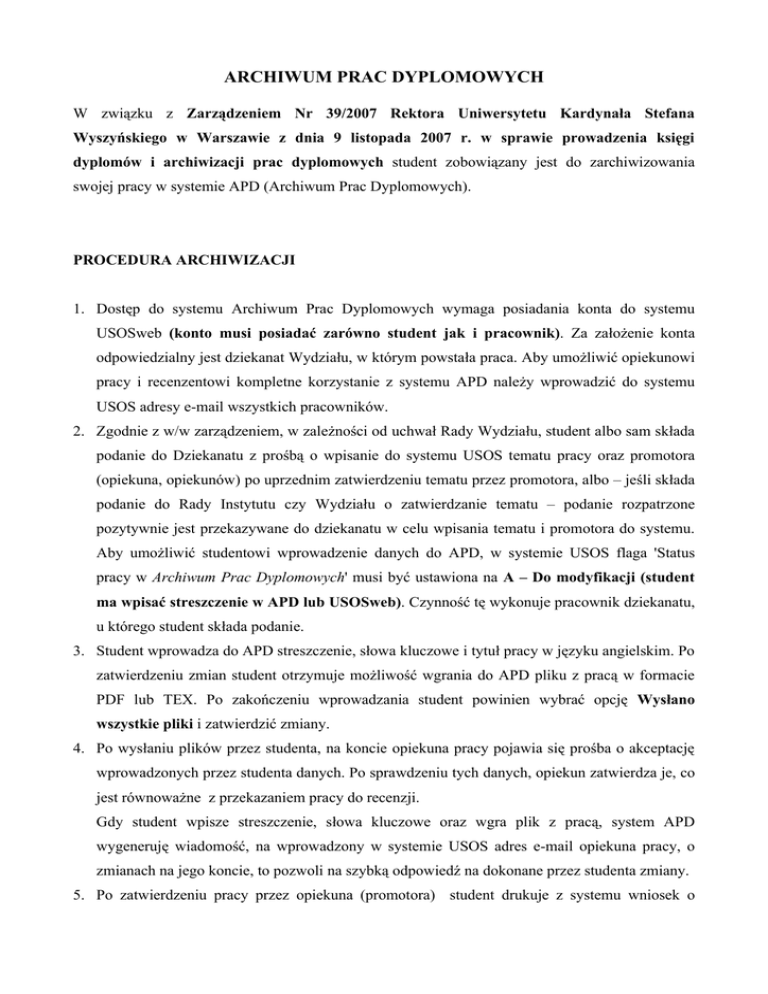 ARCHIWUM PRAC DYPLOMOWYCH W związku z Zarządzeniem Nr 39/2007 Rektora Uniwersytetu Kardynała Stefana Wyszyńskiego w Warszawie z dnia 9 listopada 2007 r. w sprawie prowadzenia księgi dyplomów i archiwizacji prac dyplomowych student zobowiązany jest do zarchiwizowania swojej pracy w systemie APD (Archiwum Prac Dyplomowych). PROCEDURA ARCHIWIZACJI 1. Dostęp do systemu Archiwum Prac Dyplomowych wymaga posiadania konta do systemu USOSweb (konto musi posiadać zarówno student jak i pracownik). Za założenie konta odpowiedzialny jest dziekanat Wydziału, w którym powstała praca. Aby umożliwić opiekunowi pracy i recenzentowi kompletne korzystanie z systemu APD należy wprowadzić do systemu USOS adresy e-mail wszystkich pracowników. 2. Zgodnie z w/w zarządzeniem, w zależności od uchwał Rady Wydziału, student albo sam składa podanie do Dziekanatu z prośbą o wpisanie do systemu USOS tematu pracy oraz promotora (opiekuna, opiekunów) po uprzednim zatwierdzeniu tematu przez promotora, albo – jeśli składa podanie do Rady Instytutu czy Wydziału o zatwierdzanie tematu – podanie rozpatrzone pozytywnie jest przekazywane do dziekanatu w celu wpisania tematu i promotora do systemu. Aby umożliwić studentowi wprowadzenie danych do APD, w systemie USOS flaga 'Status pracy w Archiwum Prac Dyplomowych' musi być ustawiona na A – Do modyfikacji (student ma wpisać streszczenie w APD lub USOSweb). Czynność tę wykonuje pracownik dziekanatu, u którego student składa podanie. 3. Student wprowadza do APD streszczenie, słowa kluczowe i tytuł pracy w języku angielskim. Po zatwierdzeniu zmian student otrzymuje możliwość wgrania do APD pliku z pracą w formacie PDF lub TEX. Po zakończeniu wprowadzania student powinien wybrać opcję Wysłano wszystkie pliki i zatwierdzić zmiany. 4. Po wysłaniu plików przez studenta, na koncie opiekuna pracy pojawia się prośba o akceptację wprowadzonych przez studenta danych. Po sprawdzeniu tych danych, opiekun zatwierdza je, co jest równoważne z przekazaniem pracy do recenzji. Gdy student wpisze streszczenie, słowa kluczowe oraz wgra plik z pracą, system APD wygeneruję wiadomość, na wprowadzony w systemie USOS adres e-mail opiekuna pracy, o zmianach na jego koncie, to pozwoli na szybką odpowiedź na dokonane przez studenta zmiany. 5. Po zatwierdzeniu pracy przez opiekuna (promotora) student drukuje z systemu wniosek o powołanie komisji egzaminacyjnej, który należy wypełnić, podpisać oraz zanieść do dziekanatu. Po rozpatrzeniu przez Dziekana wniosku o wyznaczenie komisji, pracownik dziekanatu uzupełnia w systemie USOS dane dotyczące komisji egzaminacyjnej. Po wprowadzeniu do systemu składu komisji, zostaje wysłana wiadomość do promotora i recenzenta, zawierająca informacje na temat prac gotowych do recenzji. 6. Zarówno opiekun pracy jak i recenzent widzą na swoim koncie w APD pliki dostarczone przez studenta. Wpisują treść recenzji, następnie należy ją zatwierdzić i wydrukować. Wydrukowaną i podpisaną recenzję należy dostarczyć do dziekanatu jednostki, w której powstała praca. Treść zatwierdzonej recenzji jest widoczna dla studenta na jego koncie w systemie APD. Po przejściu powyższej procedury praca staje się ZARCHIWIZOWANA