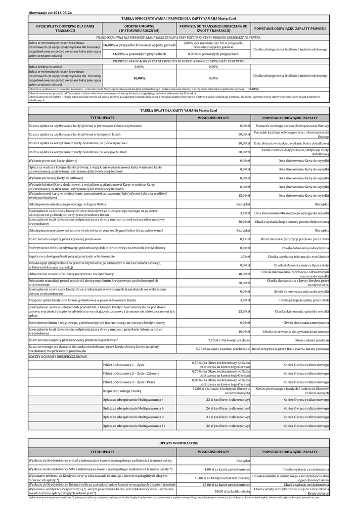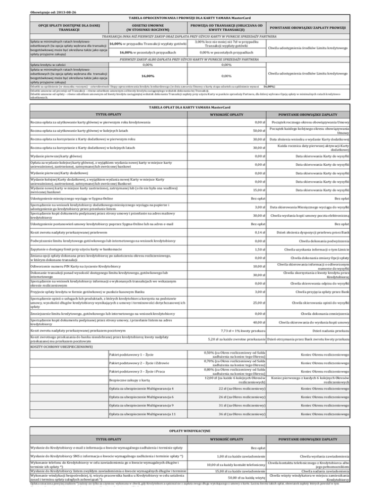 Obowiązuje od: 2013-08-26 TABELA OPROCENTOWANIA I PROWIZJI DLA KARTY YAMAHA MasterCard OPCJE SPŁATY DOSTĘPNE DLA DANEJ TRANSAKCJI ODSETKI UMOWNE (W STOSUNKU ROCZNYM) PROWIZJA OD TRANSAKCJI (OBLICZANA OD KWOTY TRANSAKCJI) POWSTANIE OBOWIĄZKU ZAPŁATY PROWIZJI TRANSAKCJA INNA NIŻ PIERWSZY ZAKUP ORAZ ZAPŁATA PRZY UŻYCIU KARTY W PUNKCIE SPRZEDAŻY PARTNERA Spłata w minimalnych ratach kredytowo16,00% w przypadku Transakcji wypłaty gotówki odsetkowych (ta opcja spłaty wybrana dla transakcji bezgotówkowej może być określana także jako opcja 16,00% w pozostałych przypadkach spłaty przyjazne zakupy) 3,00% lecz nie mniej niż 7zł w przypadku Transakcji wypłaty gotówki Chwila udostępnienia środków Limitu kredytowego 0,00% w pozostałych przypadkach PIERWSZY ZAKUP ALBO ZAPŁATA PRZY UŻYCIU KARTY W PUNKCIE SPRZEDAŻY PARTNERA Spłata kredytu w całości Spłata w minimalnych ratach kredytowoodsetkowych (ta opcja spłaty wybrana dla transakcji bezgotówkowej może być określana także jako opcja spłaty przyjazne zakupy) 0,00% 0,00% 16,00% 0,00% Chwila udostępnienia środków Limitu kredytowego Odsetki za opóźnienie (w stosunku rocznym) – czterokrotność Stopy oprocentowania kredytu lombardowego (w dniu zawarcia Umowy o kartę stopa odsetek za opóźnienie wynosi 16,00%) Odsetki umowne od prowizji od Transakcji – równe odsetkom umownym od kwoty kredytu zaciągniętego wskutek dokonania tej Transakcji. Odsetki umowne od opłaty – równe odsetkom umownym od kwoty kredytu zaciągniętej wskutek dokonania Transakcji zapłaty przy użyciu Karty w punkcie sprzedaży Partnera, dla której wybrano Opcję spłaty w minimalnych ratach kredytowoodsetkowych. TABELA OPŁAT DLA KARTY YAMAHA MasterCard TYTUŁ OPŁATY WYSOKOŚĆ OPŁATY Roczna opłata za użytkowanie karty głównej w pierwszym roku kredytowania POWSTANIE OBOWIĄZKU ZAPŁATY 0,00 zł Początek rocznego okresu obowiązywania Umowy Roczna opłata za użytkowanie karty głównej w kolejnych latach 50,00 zł Początek każdego kolejnego okresu obowiązywania Umowy Roczna opłata za korzystanie z Karty dodatkowej w pierwszym roku 30,00 zł Data złożenia wniosku o wydanie Karty dodatkowej Roczna opłata za korzystanie z Karty dodatkowej w kolejnych latach 30,00 zł Każda rocznica daty pierwszej aktywacji Karty dodatkowej Wydanie pierwszej karty głównej 0,00 zł Data skierowania Karty do wysyłki Opłata za wydanie kolejnej karty głównej, z wyjątkiem wydania nowej karty w miejsce karty unieważnionej, zastrzeżonej, zatrzymanej lub zwróconej bankowi 0,00 zł Data skierowania Karty do wysyłki Wydanie pierwszej Karty dodatkowej 0,00 zł Data skierowania Karty do wysyłki Wydanie kolejnej Karty dodatkowej, z wyjątkiem wydania nowej Karty w miejsce Karty unieważnionej, zastrzeżonej, zatrzymanej lub zwróconej Bankowi Wydanie nowej karty w miejsce karty zastrzeżonej, zatrzymanej lub (o ile nie była ona wadliwa) zwróconej bankowi Udostępnienie miesięcznego wyciągu w Sygma Online Sporządzenie na wniosek kredytobiorcy dodatkowego miesięcznego wyciągu na papierze i udostępnienie go kredytobiorcy przez przesłanie listem Sporządzenie kopii dokumentu podpisanej przez strony umowy i przesłanie na adres mailowy kredytobiorcy 0,00 zł Data skierowania Karty do wysyłki 15,00 zł Data skierowania Karty do wysyłki Bez opłat Bez opłat 3,00 zł Data skierowania Miesięcznego wyciągu do wysyłki 30,00 zł Chwila wysłania kopii umowy poczta elektroniczną Bez opłat Bez opłat Koszt zwrotu nadpłaty przekazywanej przelewem 0,14 zł Dzień złożenia dyspozycji przelewu przez Bank Podwyższenie limitu kredytowego gotówkowego lub internetowego na wniosek kredytobiorcy 0,00 zł Chwila dokonania podwyższenia Zapytanie o dostępny limit przy użyciu karty w bankomacie 1,50 zł Chwila uzyskania informacji o tym Limicie Zmiana opcji spłaty dokonana przez kredytobiorcę po zakończeniu okresu rozliczeniowego, w którym dokonano transakcji 0,00 zł Udostępnienie postanowień umowy kredytobiorcy poprzez Sygma Online lub na adres e-mail Odtworzenie numeru PIN Karty na życzenie Kredytobiorcy 10,00 zł Dokonanie transakcji ponad wysokość dostępnego limitu kredytowego, gotówkowego lub internetowego Sporządzenie na wniosek kredytobiorcy informacji o wykonanych transakcjach we wskazanym okresie rozliczeniowym 30,00 zł 0,00 zł Chwila skierowania odpisu do wysyłki 3,00 zł Chwila przyjęcia spłaty przez Bank 25,00 zł Chwila skierowania opinii do wysyłki 0,00 zł Chwila dokonania zmniejszenia 40,00 zł Chwila skierowania do wysłania kopii umowy 7,73 zł + 1% kwoty przekazu Dzień nadania przekazu Przyjecie spłaty kredytu w formie gotówkowej w punkcie kasowym Banku Sporządzenie opinii o usługach lub produktach, z których kredytobiorca korzysta na podstawie umowy, wysokości długów kredytobiorcy wynikających z umowy i terminowości dotychczasowej ich spłaty Zmniejszenie limitu kredytowego, gotówkowego lub internetowego na wniosek kredytobiorcy Sporządzenie kopii dokumentu podpisanej przez strony umowy, i przesłanie listem na adres kredytobiorcy Koszt zwrotu nadpłaty przekazywanej przekazem pocztowym Koszt zwrotnego przekazania do banku nieodebranej przez kredytobiorcę kwoty nadpłaty przekazanej mu przekazem pocztowym Chwila dokonania zmiany Opcji spłaty Chwila skierowania informacji o odtworzonym numerze do wysyłki Chwila skorzystania z kwoty kredytu przez Kredytobiorcę 5,20 zł za każde zwrotne przekazanie Dzień otrzymania przez Bank zwrotu kwoty przekazu KOSZTY OCHRONY UBEZPIECZENIOWEJ 0,50% (za Okres rozliczeniowy od Salda zadłużenia na koniec tego Okresu) 0,70% (za Okres rozliczeniowy od Salda zadłużenia na koniec tego Okresu) 0,80% (za Okres rozliczeniowy od Salda zadłużenia na koniec tego Okresu) 12,00 zł (za każde 6 kolejnych Okresów rozliczeniowych) Koniec pierwszego z kazdych 6 kolejnych Okresów rozliczeniowych Opłata za ubezpieczenie Multigwarancja 4 22 zł (za Okres rozlic