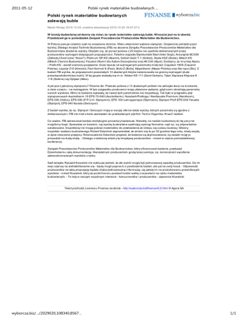 2011-05-12 Polski rynek materiałów budowlanych … Polski rynek materiałów budowlanych zalewają buble Marek Wielgo 2010-10-25, ostatnia aktualizacja 2010-10-25 18:47:27.0 W branży budowlanej od dawna się mówi, że rynek materiałów zalewają buble. Wreszcie jest na to dowód. Przedstawił go w poniedziałek Związek Pracodawców Producentów Materiałów dla Budownictwa. W Polsce panuje ostatnio szał na ocieplanie domów. Wielu właścicieli wybiera styropian. Oczywiście potrzebny jest też klej. Dlatego Instytut Techniki Budowlanej (ITB) na zlecenie Związku Pracodawców Producentów Materiałów dla Budownictwa zbadał te wyroby. Okazało się, że ponad połowa z 25 klejów nie spełniła deklarowanych przez producentów wymagań dotyczących przyczepności. Fatalnie wypadły Styrokontakt Start (Inter Grąd), Anserglob BCX39 (Zakłady Chemiczne "Anser"), Platinum SP-KS (Akamit), Solbet Gabit T-1 (Solbet), Skała KSZ (Skała), Mitech KS (Mitech Chemia Budowlana), Fasakol (Remil dla Kabex Docieplenia) oraz AK 530 (Alpol). Dodajmy, że inny klej Alpolu - Prefix KS - został oceniony pozytywnie. Dużo lepsze od wymaganych parametry miały też: Capatect 190S (Caparol Polska), Lepstyr 210 (Kreisel), Fast Normal S (Fast), Bolix Z (Bolix), Mapeitherm (Mapei Polska) oraz Sto-ispo (Sto). Z badań ITB wynika, że przyczepność pozostałych 10 zbadanych klejów balansowała na granicy wymagań (duże prawdopodobieństwo bubli). W tej grupie znalazły się m.in. Weber KS 111 (Saint Gobain), Tytan Zaprawa Klejowa E 118 (Selena) czy Optyzar (Atlas). A jak jest z jakością styropianu? Równie źle. Przeszło połowa z 13 zbadanych próbek nie zaliczyła testu na ściskanie, a dwie z pięciu - na rozciąganie. W tym przypadku producenci mają ułatwione zadanie, gdyż sami określają parametry swoich wyrobów. Mimo to badania wykazały, że nawet tych parametrów nie respektują. Tak było w przypadku płyt styropianowych Austrotherm 15 EPS 70-040 (Austrotherm), Neodach/Podłoga i Neofasada Premium (Neotherm), EPS 038 (Yetico), EPS 036 (P.P.U.H. Styropmin), EPS 100 samogasnące (Styrmann), Styropol Profi EPS 040 Fasada (Styropol), EPS 040 fasada (Swisspor). Z badań wynika, że np. Styropol i Swisspor mają w swojej ofercie także wyroby, których parametry są zgodne z deklarowanymi. ITB nie miał z kolei zastrzeżeń do przebadanych płyt firm Termo Organika, Knauf i Izolbet. Co ważne, ITB zastosował bardzo restrykcyjne procedury badawcze. Niestety, na nadzór budowlany do tej pory nie mogliśmy liczyć. Sprawdza on bowiem, czy wyroby budowlane spełniają wymogi formalne, czyli np. są odpowiednio oznakowane. Inspektorzy nie mogą pobrać materiałów do przebadania ze sklepu czy z placu budowy. Główny inspektor nadzoru budowlanego Robert Dziwiński zapowiedział, że zmieni się to po 30 grudnia tego roku, kiedy wejdą w życie stosowne przepisy. Równocześnie Dziwiński przyznał, że badania są zbyt kosztowne, by nadzór mógł je prowadzić na dużą skalę. - Dlatego z radością witamy tę inicjatywę producentów - mówił w czasie poniedziałkowej konferencji. Związek Pracodawców Producentów Materiałów dla Budownictwa, który sfinansował badania, przekazał Dziwińskiemu całą dokumentację. Nierzetelnym producentom grożą teraz sankcje, np. konieczność wycofania zakwestionowanych wyrobów z rynku. Szef związku Ryszard Kowalski nie wyklucza jednak, że złe wyniki mogły być jednorazową wpadką producentów. Da im więc szansę na zrehabilitowanie się - będą mogli poprosić o powtórzenie badań, ale już na swój koszt. - Odpowiedź producentów na taką propozycję będzie chyba jednoznaczną informacją, czy zależy im na produkowaniu prawidłowych wyrobów - mówił Kowalski, który za punkt honoru postawił sobie walkę z oszustami na rynku materiałów budowlanych. - To leży w naszym wspólnym interesie - konsumentów i producentów - zapewnia Kowalski. Tekst pochodzi z serwisu Finanse osobiste - http://wyborcza.biz/finanse/0,0.html © Agora SA wyborcza.biz/…/2029020,108340,8567… 1/1