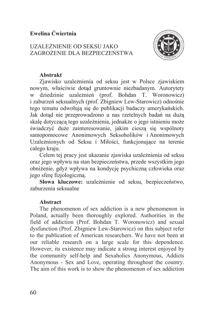 Ewelina Ćwiertnia UZALEŻNIENIE OD SEKSU JAKO ZAGROŻENIE DLA BEZPIECZEŃSTWA Abstrakt Zjawisko uzależnienia od seksu jest w Polsce zjawiskiem nowym, właściwie dotąd gruntownie niezbadanym. Autorytety w dziedzinie uzależnień (prof. Bohdan T. Woronowicz) i zaburzeń seksualnych (prof. Zbigniew Lew-Starowicz) odnośnie tego tematu odwołują się do publikacji badaczy amerykańskich. Jak dotąd nie przeprowadzono u nas rzetelnych badań na dużą skalę dotyczącą tego uzależnienia, jednakże o jego istnieniu może świadczyć duże zainteresowanie, jakim cieszą się wspólnoty samopomocowe Anonimowych Seksoholików i Anonimowych Uzależnionych od Seksu i Miłości, funkcjonujące na terenie całego kraju. Celem tej pracy jest ukazanie zjawiska uzależnienia od seksu oraz jego wpływu na stan bezpieczeństwa, przede wszystkim jego obniżenie, gdyż wpływa na kondycję psychiczną człowieka oraz jego sferę fizjologiczną. Słowa kluczowe: uzależnienie od seksu, bezpieczeństwo, zaburzenia seksualne Abstract The phenomenon of sex addiction is a new phenomenon in Poland, actually been thoroughly explored. Authorities in the field of addiction (Prof. Bohdan T. Woronowicz) and sexual dysfunction (Prof. Zbigniew Lew-Starowicz) on this subject refer to the publication of American researchers. We have not been at our reliable research on a large scale for this dependence. However, its existence may indicate a strong interest enjoyed by the community self-help and Sexaholics Anonymous, Addicts Anonymous - Sex and Love, operating throughout the country. The aim of this work is to show the phenomenon of sex addiction 60 and its impact on the security situation, especially its reduction, as it affects the mental health of the person and the sphere of physiological. Key words: sex addiction, safety, sexual dysfunction 1. CHARAKTERYSTYKA UZALEŻNIENIA OD SEKSU W niniejszej pracy ukazane zostanie zjawisko uzależnienia od seksu oraz jego aspekty wpływające na wymiary bezpieczeństwo społeczeństwa (Piwowarski 2012:6-15; Piwowarski 2013:8-9). W klasyfikacji chorób i zaburzeń psychicznych zjawisko erotomanii jest pojęciem względnie nowym, od niedawna funkcjonującym jako uzależnienie. Po raz pierwszy zbadane i opisane zostało w latach 80. XX w. przez amerykańskiego lekarza seksuologa Patricka Carnesa, który swą działalność naukową i zawodową w głównej mierze poświęcił badaniu uzależnienia od seksu, zyskując miano największego autorytetu w tej dziedzinie na świecie. Ta praca w znacznej większości oparta jest na kompleksowych badaniach i obserwacjach Patricka Carnesa w dziedzinie leczenia seksualnego uzależnienia, które zawarł w książce Od nałogu do miłości. Jak wyzwolić się z uzależnienia od seksu i odnaleźć prawdziwie uczucie, wydanej w Polsce w roku 2001 (czyli 10 lat od wydania oryginału w języku angielskim). Podobnie jak na przełomie XIX i XX wieku panowała era nerwic, tak na przełomie XX i XXI stulecia zapanowała era uzależnień (Woronowicz 2009:15). Siłą napędową dla uzależnień stało się szybkie tempo życia, chęć ucieczki od trudnych i nieakceptowanych stanów emocjonalnych, poszukiwanie szybkiej przyjemności i natychmiastowej nagrody, a także trudność w panowaniu nad impulsami. Uważne obserwowanie tego, co w ostatnich dziesięcioleciach dzieje się w naszej rzeczywistości prowadzi do wniosku, że coraz więcej naszych zachowań przybiera charakter nałogowy, to znaczy chorobowy, co w konsekwencji wpływa niekorzystnie na różne sfery życia. 61 Rola odgrywana przez uzależnienia jest coraz bardziej znacząca i dotyka coraz większej liczby osób. Wśród najbardziej destrukcyjnych nałogów znajduje się erotomania, czyli uzależnienie od myśli i zachowań seksualnych (Carnes 2001:18). Niniejsza praca służy przybliżeniu zjawiska uzależnienia od seksu. Pokrótce omówione zostaną poszczególne jego obszary: klasyfikacje, etiologia, objawy oraz skutki. Omawiając ten temat skupimy się przede wszystkim na problematyce terapii tego uzależnienia, w szczególności leczenia opartego na zmodyfikowanym i przystosowanym do potrzeb osób uzależnionych od seksu programie Dwunastu Kroków. Zarysowany zostanie także przebieg procesu zdrowienia, którego celem nie jest całkowita abstynencja seksualna (jak to ma miejsce na przykład w leczeniu uzależnienia od alkoholu, gdy uzależniony musi dożywotnio odstawić alkohol), lecz nabycie umiejętności prowadzenia zdrowego i niedestrukcyjnego życia seksualnego. Życiorysy osób uzależnionych od seksu wyglądają różnie, jednak w ich zmaganiu się z chorobą można dostrzec wiele cech wspólnych. Wspólne dla nich jest występowanie autodestrukcyjnych zachowań seksualnych, nad którymi nie są w stanie zapanować. Konsekwencje kompulsji związanych z erotomanią również są podobne. Do najdotkliwszych skutków tego uzależnienia należy rozpad więzi rodzinnych, utrata pracy i dochodów, a nawet utrata zdrowia i ryzyko utraty życia. Znaczna większość uzależnionych doświadczyła w dzieciństwie seksualnego, fizycznego i (lub) emocjonalnego wykorzystywania. Najczęściej dorastali w rodzinach dotkniętych uzależnieniami, zwykle od alkoholu. Sami również muszą często borykać się równolegle z innymi uzależnieniami, jednakże to właśnie z erotomanii najtrudniej jest się im wyzwolić (Carnes 2001:7). Amerykańskie Towarzystwo Problemów Seksualnych oszacowało, że uzależnionych od seksu jest około 10-15% Amerykanów, czyli około 25 mln osób (Woronowicz 2009:504). Coleman (Coleman 1994 za Lew-Starowicz 1997:180) stwierdza, że zaburzenie to dotyczy 5% całej populacji. Szacuje się, że w Polsce uzależnionych może być nawet kilkaset tysięcy osób, 62 choć należy być ostrożnym w tych szacunkach, gdyż nie przeprowadzono u nas jeszcze dokładnych badań na ten temat (Adamczyk 2003). 1.2. Definicja i klasyfikacja Jak podaje Woronowicz, za Encyklopedi