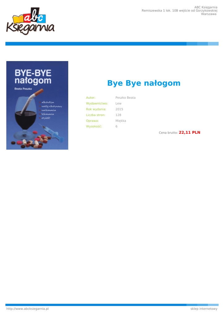 ABC Księgarnia Remiszewska 1 lok. 10B wejście od Gorzykowskiej Warszawa Bye Bye nałogom Autor: Peszko Beata Wydawnictwo: Lew Rok wydania: 2015 Liczba stron: 128 Oprawa: Miękka Wysokość: 6 Cena brutto: http://www.abcksiegarnia.pl 22,11 PLN sklep internetowy