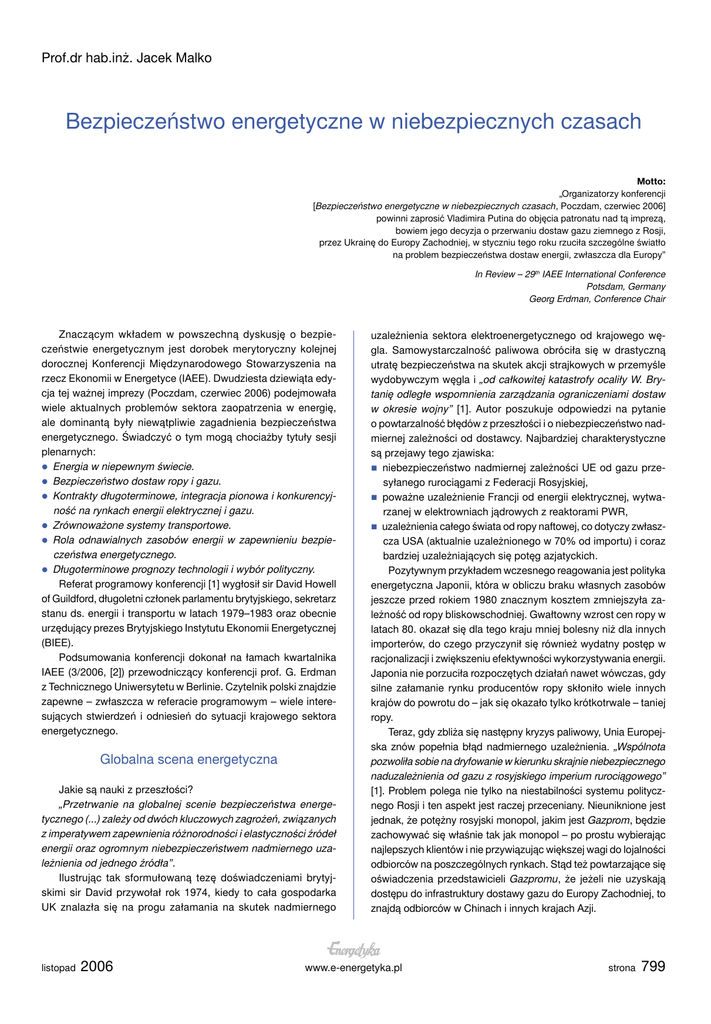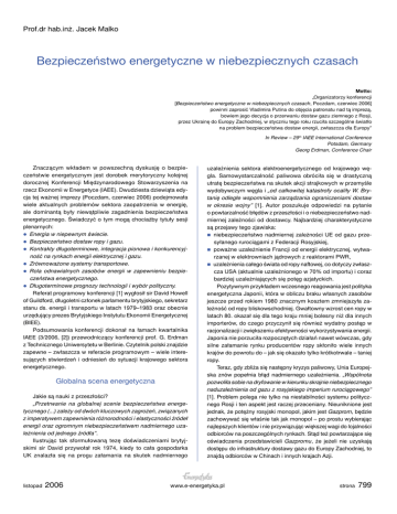 Prof.dr hab.inż. Jacek Malko Bezpieczeństwo energetyczne w niebezpiecznych czasach Motto: „Organizatorzy konferencji [Bezpieczeństwo energetyczne w niebezpiecznych czasach, Poczdam, czerwiec 2006] powinni zaprosić Vladimira Putina do objęcia patronatu nad tą imprezą, bowiem jego decyzja o przerwaniu dostaw gazu ziemnego z Rosji, przez Ukrainę do Europy Zachodniej, w styczniu tego roku rzuciła szczególne światło na problem bezpieczeństwa dostaw energii, zwłaszcza dla Europy” In Review – 29th IAEE International Conference Potsdam, Germany Georg Erdman, Conference Chair Znaczącym wkładem w powszechną dyskusję o bezpieczeństwie energetycznym jest dorobek merytoryczny kolejnej dorocznej Konferencji Międzynarodowego Stowarzyszenia na rzecz Ekonomii w Energetyce (IAEE). Dwudziesta dziewiąta edycja tej ważnej imprezy (Poczdam, czerwiec 2006) podejmowała wiele aktualnych problemów sektora zaopatrzenia w energię, ale dominantą były niewątpliwie zagadnienia bezpieczeństwa energetycznego. Świadczyć o tym mogą chociażby tytuły sesji plenarnych: Energia w niepewnym świecie. Bezpieczeństwo dostaw ropy i gazu. Kontrakty długoterminowe, integracja pionowa i konkurencyjność na rynkach energii elektrycznej i gazu. Zrównoważone systemy transportowe. Rola odnawialnych zasobów energii w zapewnieniu bezpieczeństwa energetycznego. Długoterminowe prognozy technologii i wybór polityczny. Referat programowy konferencji [1] wygłosił sir David Howell of Guildford, długoletni członek parlamentu brytyjskiego, sekretarz stanu ds. energii i transportu w latach 1979–1983 oraz obecnie urzędujący prezes Brytyjskiego Instytutu Ekonomii Energetycznej (BIEE). Podsumowania konferencji dokonał na łamach kwartalnika IAEE (3/2006, [2]) przewodniczący konferencji prof. G. Erdman z Technicznego Uniwersytetu w Berlinie. Czytelnik polski znajdzie zapewne – zwłaszcza w referacie programowym – wiele interesujących stwierdzeń i odniesień do sytuacji krajowego sektora energetycznego. Globalna scena energetyczna Jakie są nauki z przeszłości? „Przetrwanie na globalnej scenie bezpieczeństwa energetycznego (...) zależy od dwóch kluczowych zagrożeń, związanych z imperatywem zapewnienia różnorodności i elastyczności źródeł energii oraz ogromnym niebezpieczeństwem nadmiernego uzależnienia od jednego źródła”. Ilustrując tak sformułowaną tezę doświadczeniami brytyjskimi sir David przywołał rok 1974, kiedy to cała gospodarka UK znalazła się na progu załamania na skutek nadmiernego listopad 2006 uzależnienia sektora elektroenergetycznego od krajowego węgla. Samowystarczalność paliwowa obróciła się w drastyczną utratę bezpieczeństwa na skutek akcji strajkowych w przemyśle wydobywczym węgla i „od całkowitej katastrofy ocaliły W. Brytanię odległe wspomnienia zarządzania ograniczeniami dostaw w okresie wojny” [1]. Autor poszukuje odpowiedzi na pytanie o powtarzalność błędów z przeszłości i o niebezpieczeństwo nadmiernej zależności od dostawcy. Najbardziej charakterystyczne są przejawy tego zjawiska: niebezpieczeństwo nadmiernej zależności UE od gazu przesyłanego rurociągami z Federacji Rosyjskiej, poważne uzależnienie Francji od energii elektrycznej, wytwarzanej w elektrowniach jądrowych z reaktorami PWR, uzależnienia całego świata od ropy naftowej, co dotyczy zwłaszcza USA (aktualnie uzależnionego w 70% od importu) i coraz bardziej uzależniających się potęg azjatyckich. Pozytywnym przykładem wczesnego reagowania jest polityka energetyczna Japonii, która w obliczu braku własnych zasobów jeszcze przed rokiem 1980 znacznym kosztem zmniejszyła zależność od ropy bliskowschodniej. Gwałtowny wzrost cen ropy w latach 80. okazał się dla tego kraju mniej bolesny niż dla innych importerów, do czego przyczynił się również wydatny postęp w racjonalizacji i zwiększeniu efektywności wykorzystywania energii. Japonia nie porzuciła rozpoczętych działań nawet wówczas, gdy silne załamanie rynku producentów ropy skłoniło wiele innych krajów do powrotu do – jak się okazało tylko krótkotrwale – taniej ropy. Teraz, gdy zbliża się następny kryzys paliwowy, Unia Europejska znów popełnia błąd nadmiernego uzależnienia. „Wspólnota pozwoliła sobie na dryfowanie w kierunku skrajnie niebezpiecznego naduzależnienia od gazu z rosyjskiego imperium rurociągowego” [1]. Problem polega nie tylko na niestabilności systemu politycznego Rosji i ten aspekt jest raczej przeceniany. Nieuniknione jest jednak, że potężny rosyjski monopol, jakim jest Gazprom, będzie zachowywać się właśnie tak jak monopol – po prostu wybierając najlepszych klientów i nie przywiązując większej wagi do lojalności odbiorców na poszczególnych rynkach. Stąd też powtarzające się oświadczenia przedstawicieli Gazpromu, że jeżeli nie uzyskają dostępu do infrastruktury dostawy gazu do Europy Zachodniej, to znajdą odbiorców w Chinach i innych krajach Azji. www.e-energetyka.pl strona 799 Obcesowe, ale nie pozbawione realizmu są słowa Wiktora Kristenki – ministra energetyki Rosji: „jeżeli zależność jest zła, to każdy może od tej zależności uciec”. Rzeczywiście, ale czy nie jest na to za późno? Sytuację można zatem opisać na dwa sposoby. Po pierwsze – nie istnieje pełne bezpieczeństwo energetyczne. Złudzeniem jest wizja całkowicie stabilnego, długoterminowego i regularnego dostarczania energii, gwarantującego stałe, niezmienne w czasie i w pełni niezawodne zasilanie energią elektryczną zależnych od elektryczności społeczeństw jutra. Taki wzorzec jest nie do utrzymania. Jeżeli podejmiemy wysiłki dla osiągnięcia tak zdefiniowanego celu, nie przyniosą one trwałych skutków. Zdarzenia losowe i zachodzące przemiany zawsze dają o sobie znać i zawsze uniemożliwiają funkcjonowanie takich wyidealizowanych systemów. Druga konstatacja wynika z poprzednich s