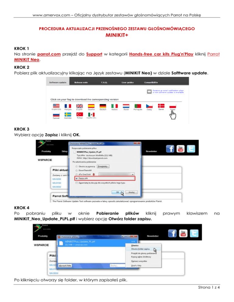 www.amervox.com – Oficjalny dystrybutor zestawów głośnomówiących Parrot na Polskę PROCEDURA AKTUALIZACJI PRZENOŚNEGO ZESTAWU GŁOŚNOMÓWIĄCEGO MINIKIT+ KROK 1 Na stronie parrot.com przejdź do Support w kategorii Hands-free car kits Plug'n'Play kliknij Parrot MINIKIT Neo. KROK 2 Pobierz plik aktualizacyjny klikając na Język zestawu (MINIKIT Neo) w dziale Softtware update. KROK 3 Wybierz opcję Zapisz i kliknij OK. KROK 4 Po pobraniu pliku w oknie Pobieranie plików kliknij MINIKIT_Neo_Update_PLPL.plf i wybierz opcję Otwórz folder zapisu. prawym klawiszem na Po kliknięciu otworzy się folder, w którym zapisałeś plik. Strona 1 z 4 www.amervox.com – Oficjalny dystrybutor zestawów głośnomówiących Parrot na Polskę KROK 5 Włącz MINIKIT Neo KROK 6 Wciśnij i przekręć przycisk pokrętła aż trafisz do menu o nazwie Aktualizacja. Aktualizacja. KROK 7 Następnie przyciśnij przycisk pokrętła, by przejść do trybu aktualizacji. Zestaw potwierdzi gotowość do aktualizacji. Oczekiwanie na aktualizację. Strona 2 z 4 www.amervox.com – Oficjalny dystrybutor zestawów głośnomówiących Parrot na Polskę KROK 8 Korzystając z przewodu dostarczonego w zestawie (miniUSB/USB) podłącz zestaw MINIKIT Neo do komputera. KROK 9 Komputer wykryje zestaw jako „Urządzenie pamięci masowej USB”. Po prostu skopiuj plik z aktualizacją (z katalogu, do którego został pobrany) do zestawu MINIKIT Neo. KROK 10 Usuń bezpiecznie urządzenie z systemu. Następnie odłącz przewód miniUSB/USB od zestawu. Strona 3 z 4 www.amervox.com – Oficjalny dystrybutor zestawów głośnomówiących Parrot na Polskę KROK 11 Zestaw poinformuje o rozpoczęciu aktualizacji. Trwa aktualizacja. Proszę czekać. KROK 12 Po kilku minutach użytkownik zostanie poinformowany o zakończeniu aktualizacji komunikatem Aktualizacja oprogramowania powiodła się. Aktualizacja oprogramowania powiodła się. KONTAKT Tel.: 41/368 30 66 e-mail: [email protected] e-mail: [email protected] Strona 4 z 4