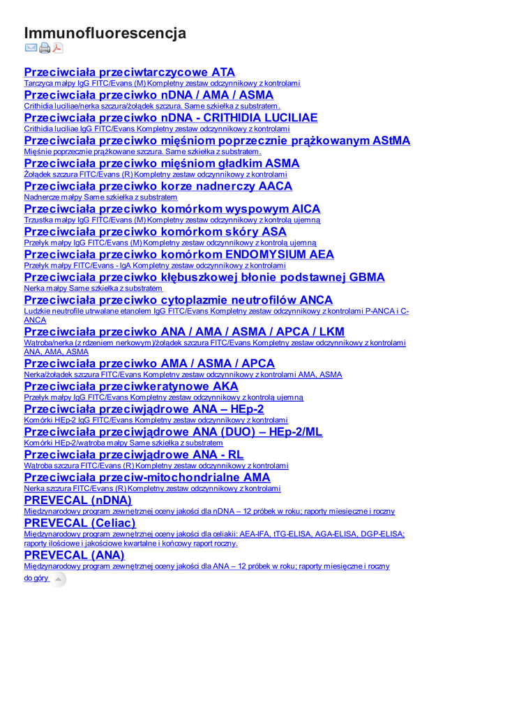 Immunofluorescencja Przeciwciała przeciwtarczycowe ATA Tarczyca małpy IgG FITC/Evans (M) Kompletny zestaw odczynnikowy z kontrolami Przeciwciała przeciwko nDNA / AMA / ASMA Crithidia luciliae/nerka szczura/żołądek szczura. Same szkiełka z substratem. Przeciwciała przeciwko nDNA - CRITHIDIA LUCILIAE Crithidia luciliae IgG FITC/Evans Kompletny zestaw odczynnikowy z kontrolami Przeciwciała przeciwko mięśniom poprzecznie prążkowanym AStMA Mięśnie poprzecznie prążkowane szczura. Same szkiełka z substratem. Przeciwciała przeciwko mięśniom gładkim ASMA Żołądek szczura FITC/Evans (R) Kompletny zestaw odczynnikowy z kontrolami Przeciwciała przeciwko korze nadnerczy AACA Nadnercze małpy Same szkiełka z substratem Przeciwciała przeciwko komórkom wyspowym AICA Trzustka małpy IgG FITC/Evans (M) Kompletny zestaw odczynnikowy z kontrolą ujemną Przeciwciała przeciwko komórkom skóry ASA Przełyk małpy IgG FITC/Evans (M) Kompletny zestaw odczynnikowy z kontrolą ujemną Przeciwciała przeciwko komórkom ENDOMYSIUM AEA Przełyk małpy FITC/Evans - IgA Kompletny zestaw odczynnikowy z kontrolami Przeciwciała przeciwko kłębuszkowej błonie podstawnej GBMA Nerka małpy Same szkiełka z substratem Przeciwciała przeciwko cytoplazmie neutrofilów ANCA Ludzkie neutrofile utrwalane etanolem IgG FITC/Evans Kompletny zestaw odczynnikowy z kontrolami P-ANCA i CANCA Przeciwciała przeciwko ANA / AMA / ASMA / APCA / LKM Wątroba/nerka (z rdzeniem nerkowym)/żołądek szczura FITC/Evans Kompletny zestaw odczynnikowy z kontrolami ANA, AMA, ASMA Przeciwciała przeciwko AMA / ASMA / APCA Nerka/żołądek szczura FITC/Evans Kompletny zestaw odczynnikowy z kontrolami AMA, ASMA Przeciwciała przeciwkeratynowe AKA Przełyk małpy IgG FITC/Evans Kompletny zestaw odczynnikowy z kontrolą ujemną Przeciwciała przeciwjądrowe ANA – HEp-2 Komórki HEp-2 IgG FITC/Evans Kompletny zestaw odczynnikowy z kontrolami Przeciwciała przeciwjądrowe ANA (DUO) – HEp-2/ML Komórki HEp-2/wątroba małpy Same szkiełka z substratem Przeciwciała przeciwjądrowe ANA - RL Wątroba szczura FITC/Evans (R) Kompletny zestaw odczynnikowy z kontrolami Przeciwciała przeciw-mitochondrialne AMA Nerka szczura FITC/Evans (R) Kompletny zestaw odczynnikowy z kontrolami PREVECAL (nDNA) Międzynarodowy program zewnętrznej oceny jakości dla nDNA – 12 próbek w roku; raporty miesięczne i roczny PREVECAL (Celiac) Międzynarodowy program zewnętrznej oceny jakości dla celiakii: AEA-IFA, tTG-ELISA, AGA-ELISA, DGP-ELISA; raporty ilościowe i jakościowe kwartalne i końcowy raport roczny. PREVECAL (ANA) Międzynarodowy program zewnętrznej oceny jakości dla ANA – 12 próbek w roku; raporty miesięczne i roczny do góry