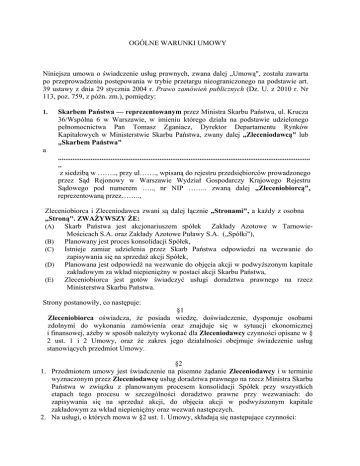 OGÓLNE WARUNKI UMOWY Niniejsza umowa o świadczenie usług prawnych, zwana dalej „Umową", została zawarta po przeprowadzeniu postępowania w trybie przetargu nieograniczonego na podstawie art. 39 ustawy z dnia 29 stycznia 2004 r. Prawo zamówień publicznych (Dz. U. z 2010 r. Nr 113, poz. 759, z późn. zm.), pomiędzy: 1. Skarbem Państwa — reprezentowanym przez Ministra Skarbu Państwa, ul. Krucza 36/Wspólna 6 w Warszawie, w imieniu którego działa na podstawie udzielonego pełnomocnictwa Pan Tomasz Zganiacz, Dyrektor Departamentu Rynków Kapitałowych w Ministerstwie Skarbu Państwa, zwany dalej „Zleceniodawcą" lub „Skarbem Państwa" a ........................................................................................................................................... .. z siedzibą w …….., przy ul……., wpisaną do rejestru przedsiębiorców prowadzonego przez Sąd Rejonowy w Warszawie Wydział Gospodarczy Krajowego Rejestru Sądowego pod numerem ….., nr NIP …….. zwaną dalej „Zleceniobiorcą", reprezentowaną przez…….., Zleceniobiorca i Zleceniodawca zwani są dalej łącznie „Stronami", a każdy z osobna „Stroną". ZWAŻYWSZY ŻE: (A) Skarb Państwa jest akcjonariuszem spółek Zakłady Azotowe w TarnowieMościcach S.A. oraz Zakłady Azotowe Puławy S.A. („Spółki"), (B) Planowany jest proces konsolidacji Spółek, (C) Istnieje zamiar udzielenia przez Skarb Państwa odpowiedzi na wezwanie do zapisywania się na sprzedaż akcji Spółek, (D) Planowana jest odpowiedź na wezwanie do objęcia akcji w podwyższonym kapitale zakładowym za wkład niepieniężny w postaci akcji Skarbu Państwa, (E) Zleceniobiorca jest gotów świadczyć usługi doradztwa prawnego na rzecz Ministerstwa Skarbu Państwa. Strony postanowiły, co następuje: §1 Zleceniobiorca oświadcza, że posiada wiedzę, doświadczenie, dysponuje osobami zdolnymi do wykonania zamówienia oraz znajduje się w sytuacji ekonomicznej i finansowej, ażeby w sposób należyty wykonać dla Zleceniodawcy czynności opisane w § 2 ust. 1 i 2 Umowy, oraz że zakres jego działalności obejmuje świadczenie usług stanowiących przedmiot Umowy. §2 1. Przedmiotem umowy jest świadczenie na pisemne żądanie Zleceniodawcy i w terminie wyznaczonym przez Zleceniodawcę usług doradztwa prawnego na rzecz Ministra Skarbu Państwa w związku z planowanym procesem konsolidacji Spółek przy wszystkich etapach tego procesu w szczególności doradztwo prawne przy wezwaniach: do zapisywania się na sprzedaż akcji, do objęcia akcji w podwyższonym kapitale zakładowym za wkład niepieniężny oraz wezwań następczych. 2. Na usługi, o których mowa w §2 ust. 1. Umowy, składają się następujące czynności: 1) doradztwo prawne na rzecz Skarbu Państwa w związku z planowaną konsolidacją spółek chemicznych; 2) doradztwo w zakresie identyfikacji i eliminacji ryzyk prawnych związanych z przeprowadzeniem konsolidacji spółek chemicznych; 3) uczestnictwo w spotkaniach i telekonferencjach z doradcami Spółki i Zamawiającego; 4) wydanie niezbędnych opinii prawnych oraz przygotowywanie komunikatów związanych z konsolidacją spółek chemicznych w szczególności w przedmiocie zagadnień korporacyjnych; 5) doradztwo prawne w zakresie przygotowania: niezbędnych dokumentów związanych z koniecznością uzyskania zgód lub poinformowania właściwych organów państwowych z związku z przeprowadzaną konsolidacją oraz wymaganych w procesie umów; 6) doradztwo prawne przy ogłoszonych wezwaniach: a) na sprzedaż akcji Skarbu Państwa w spółkach chemicznych, b) do objęcia akcji w podwyższonym kapitale zakładowym za wkład niepieniężny w postaci akcji Skarbu Państwa, c) wezwań następczych. 1. Strony ustaliły, że użyte powyżej określenie „na pisemne żądanie Zleceniodawcy i w terminie wyznaczonym przez Zleceniodawcę” należy rozumieć w ten sposób, że Zleceniodawca w formie pisemnej wyznaczy dzień rozpoczęcia wykonania czynności, określonych w ust. 2. §3 2. Zleceniobiorca zobowiązuje się do wykonywania prac objętych zakresem Umowy przy zachowaniu najwyższej staranności wynikającej z zawodowego charakteru prowadzonej działalności. Zleceniobiorca zobowiązuje się do udzielania Zleceniodawcy porad prawnych w sposób zgodny z profesjonalnymi standardami, zgodnie z wiedzą posiadaną przez Zleceniobiorcę lub, którą Zleceniobiorca powinien posiadać przy dołożeniu należytej zawodowej staranności. 3. W przypadku powstania jakichkolwiek przeszkód w wykonaniu Umowy, z przyczyn niezależnych od Zleceniobiorcy, Zleceniobiorca zawiadomi o tym niezwłocznie Zleceniodawcę. Jeżeli usunięcie takich przeszkód będzie możliwe w wyniku działań Zleceniobiorcy, Zleceniobiorca zobowiązuje się do podjęcia takich działań. 4. Zleceniobiorca może powierzyć wykonanie zamówienia podwykonawcom. §4 5. Zleceniobiorca zobowiązuje się do zapewnienia zespołu osób uczestniczących w wykonywaniu zamówienia, składającego się, zgodnie ze Specyfikacją Istotnych Warunków Zamówienia oraz ofertą Zleceniobiorcy, ze specjalistów posiadających odpowiednie kwalifikacje i doświadczenie, dającego rękojmię realizacji przedmiotu umowy na wymaganym przez Skarb Państwa poziomie. Osoby uczestniczące w wykonywaniu zamówienia zostaną wskazane w załączniku nr 1 do niniejszej umowy. 6. Zmiany osób uczestniczących w wykonywaniu zamówienia, o których mowa w ust. 1, w tym zwiększenie ich liczby, jest dopuszczalne w uzasadnionych przypadkach. Osoby zastępujące muszą spełniać co najmniej analogiczne warunki i kryteria jak osoby zastępowane, zgodnie ze Specyfikacją Istotnych Warunków Zamówienia. 7. Zleceniobiorca niezwłocznie zgłosi każdą zmianę personalną w zespole osób realizujących zamówienie. 8. Zmiany personalne w zakresie osób, o których mowa w niniejszym paragrafie, nie stanowią zmian postanowień niniejszej umowy. 1. 2. 3. 4. 5. 6. 7. §5 Z