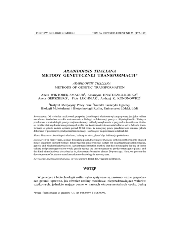 ARABIDOPSIS THALIANA - METODY GENETYCZNEJ TRANSFORMACJI POSTÊPY BIOLOGII KOMÓRKI 177 TOM 36, 2009 SUPLEMENT NR 25 (177187) ARABIDOPSIS THALIANA METODY GENETYCZNEJ TRANSFORMACJI* ARABIDOPSIS THALIANA METHODS OF GENETIC TRANSFORMATION Aneta WIKTOREK-SMAGUR1, Katarzyna HNATUSZKO-KONKA2, Aneta GERSZBERG2, Piotr £UCHNIAK2, Andrzej K. KONONOWICZ2 1 Instytut Medycyny Pracy oraz 2Katedra Genetyki Ogólnej, Biologii Molekularnej i Biotechnologii Rolin, Uniwersytet £ódzki, £ód Streszczenie: Od wielu lat rzodkiewnik pospolity (Arabidopsis thaliana) wykorzystywany jest jako rolina modelowa. Znalaz³ on szerokie zastosowanie w biologii molekularnej, genetyce i fizjologii rolin. Wa¿nym prze³omem w metodologii genetycznej transformacji rolin by³o wykazanie w przypadku Arabidopsis thaliana mo¿liwoci uzyskania transgenicznych rolin bez koniecznoci stosowania kultur in vitro. Metoda transformacji in planta zosta³a opisana ponad 20 lat temu. W niniejszej pracy przedstawiono zmiany, jakich dokonano w procedurze genetycznej transformacji Arabidopsis na przestrzeni ostatnich lat. S³owa kluczowe: Arabidopsis thaliana, kultury in vitro, floral dip, infiltracja pró¿niowa. Summary: For many years, a small flowering plant Arabidopsis thaliana is the most thoroughly studied model organism in plant biology. It has become a major model system for investigating plant molecular, genetic and biochemical processes. A plant transformation method that does not require the use of tissue culture and plant regeneration would greatly reduce the time necessary to produce transgenic plants, and this kind of method was described as in planta transformation almost 20 years ago. Here, we present the development of in planta transformation methodology in recent years. Key words: Arabidopsis thaliana, in vitro culture, floral dip, vacuum infiltration. WSTÊP W genetyce i biotechnologii rolin wykorzystywane s¹ zarówno wa¿ne gospodarczo gatunki uprawne, jak równie¿ roliny modelowe, nieprzedstawiaj¹ce walorów u¿ytkowych, jednak¿e maj¹ce cenne w naukach eksperymentalnych cechy. Jedn¹ *Praca finansowana z grantów U£ nr 505/0397 i 506/0996. 178 A. WIKTOREK-SMAGUR, K. HNATUSZKO-KONKA, A. GERSZBERG, P. £UCHNIAK, A. K. KONONOWICZ z gatunków rolin modelowych jest pospolity chwast, rzodkiewnik pospolity (Arabidopsis thaliana L. Heynh.). Znany jest on botanikom od ponad czterech wieków, a w badaniach laboratoryjnych wykorzystywany jest od blisko 100 lat. Po raz pierwszy zosta³ opisany w 1577 roku przez niemieckiego lekarza Johannensa Thala, jako Pilosella siliquosa minor [30]. W ci¹gu nastêpnych stuleci by³ znany pod ponad 30 ró¿nymi nazwami. W 1753 roku Karol Linneusz dokona³ dok³adniejszej charakterystyki gatunku pod nazw¹ Arabis thaliana. Obecn¹ nazwê, po raz pierwszy podali w 1842 roku w czasopimie Flora Sachsoniae Holi i Hynhold [35]. Arabidopsis thaliana jest pospolit¹ i dobrze poznan¹ rolin¹ nale¿¹c¹ do rodziny Brassicaceae (Cruciferae). Rodzina to obejmuje oko³o 340 rodzajów i przesz³o trzy tysi¹ce gatunków, w tym liczne wa¿ne roliny uprawne. Cechami w³aciwymi dla niej s¹ przede wszystkim: budowa kwiatu z³o¿onego z czterech okó³ków, z czterema d³u¿szymi i dwoma krótszymi prêcikami; owoc charakterystycznie pêkaj¹cy dwoma klapami i maj¹cy tzw. przegrodê fa³szyw¹, zwany ³uszczyn¹ lub ³uszczynk¹ oraz wystêpowanie oleju gorczycznego. Rodzaj Arabidopsis obejmuje 27 gatunków pochodz¹cych g³ównie z centralnej Azji. Naturalne populacje A. thaliana wystêpuj¹ równie¿ w Europie i w Ameryce Pó³nocnej. W zwi¹zku z du¿ym zasiêgiem geograficznym i ekologicznym, wród rolin ró¿nych populacji wystêpuje du¿a zmiennoæ genetyczna. Zmiennoæ ta dotyczy g³ównie takich cech, jak: wra¿liwoæ na niskie temperatury i d³ugoæ dnia czy czas kwitnienia [1]. Zgromadzone w kolekcjach roliny z ró¿nych dzikich populacji wykorzystywano najpierw do badañ nad wernalizacj¹, fotoperiodyzmem i kwitnieniem oraz innymi fizjologicznymi i molekularnymi podstawami rozwoju, a nastêpnie w badaniach genetycznych i molekularnych. Linie Arabidopsis u¿ywane w laboratoriach pochodz¹ z nasion dzikich rolin rozmna¿anych przez wiele pokoleñ i obecnie stanowi¹ dobrze scharakteryzowane linie homozygotyczne. Najpowszechniej wykorzystywanymi liniami s¹ Columbia wild-type i Landsberg erecta. Obie te linie by³y wyselekcjonowane z ekotypu Landsberg w kolekcji Laibacha [35]. Wiêkszoæ ekotypów A. thaliana to roliny jednoroczne, ozime. Nasiona ich kie³kuj¹ jesieni¹, zim¹ pozostaj¹ w stadium rozety, a wiosn¹, przy odpowiedniej iloci wiat³a przechodz¹ w fazê rozwoju generatywnego. Rozwój roliny i czas kwitnienia zale¿y od genotypu, a tak¿e od warunków hodowli. Niedobór substancji od¿ywczych powoduje szybkie zakwitanie, krótk¹ fazê generatywn¹ oraz produkcjê niewielkiej liczby nasion. Arabidopsis szybko zakwita w warunkach dnia d³ugiego lub ci¹g³ego owietlenia. Krótki dzieñ i niska temperatura wyd³u¿aj¹ fazê wegetatywn¹ i znacznie opóniaj¹ kwitnienie [34]. Dojrza³a rolina A. thaliana ma rozetê ma³ych lici i pêd g³ówny zakoñczony kwiatostanem. U starszych rolin z rozety wyrastaj¹ pêdy drugorzêdowe i wytwarzane s¹ odga³êzienia pêdu g³ównego. Kwiatostany poszczególnych pêdów zawieraj¹ kwiaty w ró¿nych stadiach rozwojowych, m³odsze na szczycie, a starsze u podstawy. Pojedynczy kwiat ma oko³o 3 mm d³ugoci i 1 mm rednicy. Kwiat typowy dla Brassicaceae sk³ada siê z czterech okó³ków; czterech dzia³ek kielicha, czterech bia³ych p³atków korony, szeciu prêcików, czterech d³ugich i dwóch krótkich, s³upka ARABIDOPSIS THALIANA - METODY GENETYCZNEJ TRANSFORMACJI 179 zbudowanego z dwóch owocolistków (ryc. 1A-E). Kwiaty s¹ na ogó³ samopylne stwierdzono bardzo niski procent obcopylnoci (oko³o 104), dziêki czemu ³atwo jest utrzymaæ czyste linie. Arabidopsis mo¿e byæ jednak ³atwo krzy¿owana po uprzednim usuniêciu pylników lub z