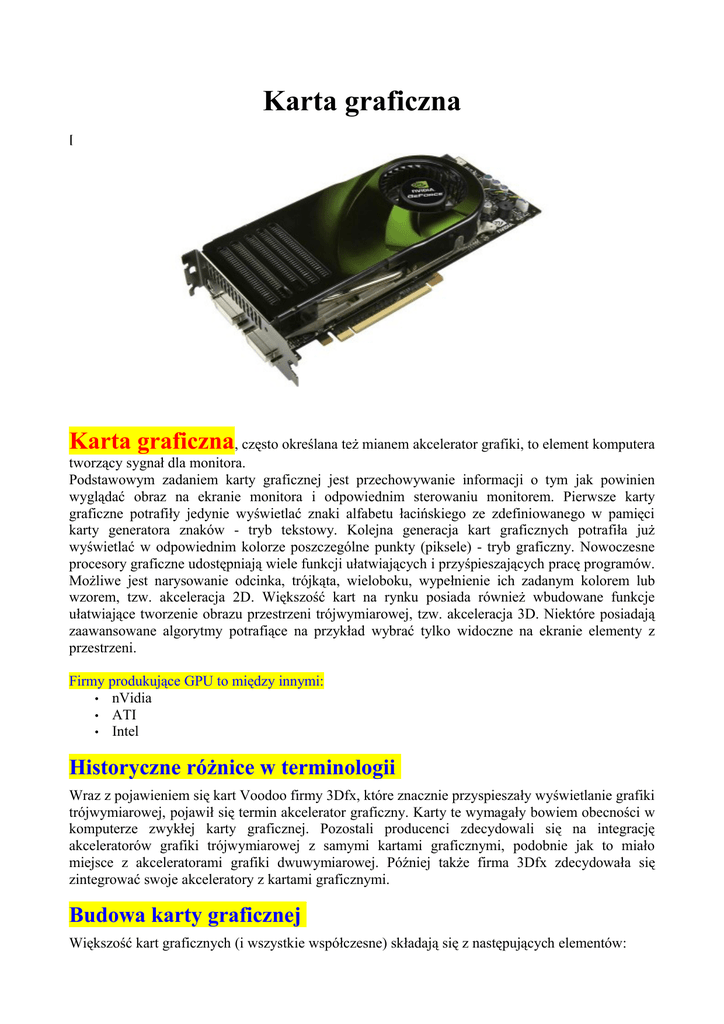 Karta graficzna [ Karta graficzna, często określana też mianem akcelerator grafiki, to element komputera tworzący sygnał dla monitora. Podstawowym zadaniem karty graficznej jest przechowywanie informacji o tym jak powinien wyglądać obraz na ekranie monitora i odpowiednim sterowaniu monitorem. Pierwsze karty graficzne potrafiły jedynie wyświetlać znaki alfabetu łacińskiego ze zdefiniowanego w pamięci karty generatora znaków - tryb tekstowy. Kolejna generacja kart graficznych potrafiła już wyświetlać w odpowiednim kolorze poszczególne punkty (piksele) - tryb graficzny. Nowoczesne procesory graficzne udostępniają wiele funkcji ułatwiających i przyśpieszających pracę programów. Możliwe jest narysowanie odcinka, trójkąta, wieloboku, wypełnienie ich zadanym kolorem lub wzorem, tzw. akceleracja 2D. Większość kart na rynku posiada również wbudowane funkcje ułatwiające tworzenie obrazu przestrzeni trójwymiarowej, tzw. akceleracja 3D. Niektóre posiadają zaawansowane algorytmy potrafiące na przykład wybrać tylko widoczne na ekranie elementy z przestrzeni. Firmy produkujące GPU to między innymi: • nVidia • ATI • Intel Historyczne różnice w terminologii Wraz z pojawieniem się kart Voodoo firmy 3Dfx, które znacznie przyspieszały wyświetlanie grafiki trójwymiarowej, pojawił się termin akcelerator graficzny. Karty te wymagały bowiem obecności w komputerze zwykłej karty graficznej. Pozostali producenci zdecydowali się na integrację akceleratorów grafiki trójwymiarowej z samymi kartami graficznymi, podobnie jak to miało miejsce z akceleratorami grafiki dwuwymiarowej. Później także firma 3Dfx zdecydowała się zintegrować swoje akceleratory z kartami graficznymi. Budowa karty graficznej Większość kart graficznych (i wszystkie współczesne) składają się z następujących elementów: • • • • • Procesor graficzny (GPU) - odpowiedzialny za generowanie obrazu w pamięci obrazu Pamięć obrazu - VideoRAM, bufor ramki (ang. framebuffer) - przechowuje cyfrowe dane o obrazie Pamięć ROM - pamięć przechowująca dane (np. dane generatora znaków) lub firmware karty graficznej, obecnie realizowana jako pamięć flash DAC - przetwornik C/A (ang. Digital-to-Analog Converter) - odpowiedzialny za przekształcenie cyfrowych danych z pamięci obrazu na sygnał sterujący dla monitora analogowego; w przypadku kart wyłącznie z wyjściem cyfrowym DAC nie stosuje się Interfejs do systemu komputerowego - umożliwia wymianę danych i sterowanie kartą graficzną - zazwyczaj PCI, AGP, PCI-Express