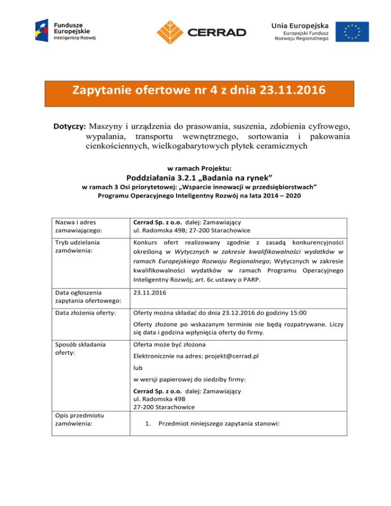 Dotyczy:Maszyny i urządzenia do prasowania, suszenia, zdobienia cyfrowego, wypalania, transportu wewnętrznego, sortowania i pakowania cienkościennych, wielkogabarytowych płytek ceramicznych wramachProjektu: Poddziałania3.2.1„Badanianarynek” wramach3Osipriorytetowej:„Wsparcieinnowacjiwprzedsiębiorstwach” ProgramuOperacyjnegoInteligentnyRozwójnalata2014–2020 Nazwaiadres CerradSp.zo.o.dalej:Zamawiający zamawiającego: ul.Radomska49B;27-200Starachowice Zapytanieofertowenr4zdnia23.11.2016 Trybudzielania zamówienia: Konkurs ofert realizowany zgodnie z zasadą konkurencyjności określoną w Wytycznych w zakresie kwalifikowalności wydatków w ramach Europejskiego Rozwoju Regionalnego; Wytycznych w zakresie kwalifikowalności wydatków w ramach Programu Operacyjnego InteligentnyRozwój;art.6custawyoPARP. Dataogłoszenia 23.11.2016 zapytaniaofertowego: Datazłożeniaoferty: Ofertymożnaskładaćdodnia23.12.2016dogodziny15:00 Oferty złożone po wskazanym terminie nie będą rozpatrywane. Liczy siędataigodzinawpłynięciaofertydofirmy. Sposóbskładania oferty: Ofertamożebyćzłożona Elektronicznienaadres:[email protected] lub wwersjipapierowejdosiedzibyfirmy: Opisprzedmiotu zamówienia: CerradSp.zo.o.dalej:Zamawiający ul.Radomska49B 27-200Starachowice 1. Przedmiotniniejszegozapytaniastanowi: 1.1. Ciąg technologiczny do prasowania płytek ceramicznych omax. Formacie 320 x 160 cm. Grubość 3 – 20 mm, wydajność10.000m2formatu1200x2400x6mm. 1.2. Ciąg technologiczny do suszenia, zdobienia cyfrowego zwykorzystaniem sześciu kolorów, cienkościennych, wielkogabarytowych płytek ceramicznych o max. Formacie 320x160cm.Grubość3–20mm,wydajnośćmin.4.500m2 dla formatu1200x2400x6mm.,orazwydajności10.000m2 dlaformatu800x800x8mm. 1.3. Ciąg technologiczny do wypalania cienkościennych, wielkogabarytowych płytek ceramicznych o max. formacie 320x160cm,grubości3–20mm,wydajnościdobowejmin. 4.500 m2 dla formatu 1200 x 2400 x 6 mm., oraz wydajności dobowej10.000m2dlaformatu800x800x8mm. 1.4. Ciąg technologiczny do transportu wewnętrznego płytek wielkogabarytowychomax.formacie320x160cm,grubości 3 – 20 mm, wydajności dobowej min. 4.500 m2 dla formatu 1200x2400x6mm.,orazwydajnościdobowej10.000m2dla formatu800x800x8mm. 1.5. Ciąg technologiczny do sortowania i pakowania cienkościennych, wielkogabarytowych płytek ceramicznych omax. formacie 320 x 160 cm, grubości 3 – 20 mm, wydajnościdobowejmin.4.500m2 dla formatu1200x2400x 6mm.,wydajnościdobowej10.000m2dlaformatu800x800 x 8 mm. i wydajności dobowej 7000 m2 dla formatu 1800 x 200x8 1. ZgodniezeWspólnotowymSłownikiemZamówieńprzedmiot zamówieniazostałzdefiniowanyjakoCPV: 42900000-5-Różnemaszynyogólnegoispecjalnego przeznaczenia; 16612000-8-maszynydosortowanialubklasyfikowania produktów; 42341000-8–Pieceprzemysłowe; 39713211-5–Urządzeniadosuszeniaiprasowania. 2. Zamawiający zastrzega sobie prawo do ograniczenia zakresu opisu przedmiotu zamówienia, przy czym zobowiązuje się do przesłania uzupełnienia szczegółowego (wyłączonego) opisu przedmiotu zamówienia na pisemną prośbę wszystkich zainteresowanych potencjalnych Wykonawców, którzy pisemnie zobowiążą się do zachowania poufności w odniesieniu do przedstawionych informacji poprzez dostarczenieoświadczeniapodpisanegoprzezZarząd.. Warunkiudziałuw postępowaniu: Zamawiającyniedopuszczamożliwościskładaniaofertczęściowych. DOŚWIADCZENIEWYKONAWCY: 1. Wykonawcapowinienwykazaćsięreferencjami, 2. Napotwierdzeniewymogu,wymagasięzałączeniadoofertyopisu zrealizowanej co najmniej 1 dostawy wraz z krótkim opisem przedmiotujakichowadostawa/dostawydotyczyły. *** A. Zamawiający dokona oceny spełnienia warunków udziału w postępowaniu na podstawie oświadczenia Wykonawcy oraz ww. opisu. Ocena spełnienia wymogu zostanie dokonana metodą spełnia/niespełnia. B. Dokumenty żądane przez Zamawiającego w celu potwierdzenia spełniania warunków udziału w postępowaniu należy składać w formieoryginałulubkopiipoświadczonejzazgodnośćzoryginałem przez Wykonawcę (w przypadku składania oferty w formie elektronicznejnależyprzesłaćskanww.dokumentów). C. Zamawiającyprzedpodpisaniemumowyzastrzegasobieprawodo weryfikacji oświadczeń Wykonawcy (spełnia/nie spełnia ) dot. warunków udziału w postępowaniu na podstawie właściwych dokumentówpotwierdzającychoświadczenieWykonawcy. D. Z udziału w postępowaniu wykluczone są podmioty powiązane osobowoikapitałowozzamawiającym. Przez powiązania kapitałowe lub osobowe rozumie się wzajemne powiązaniamiędzyZamawiającymlubosobamiupoważnionymido zaciągania zobowiązań w imieniu Zamawiającego lub osobami wykonującymi w imieniu Zamawiającego czynności związane z przygotowaniem i przeprowadzaniem procedury wyboru wykonawcy,awykonawcą,polegającewszczególnościna: − uczestniczeniu w spółce, jako wspólnik spółki cywilnej lub spółki osobowej, − posiadaniuconajmniej10%udziałówlubakcji, − pełnieniu funkcji członka organu nadzorczego lub zarządzającego, prokurenta,pełnomocnika, − pozostawaniu w związku małżeńskim, w stosunku pokrewieństwa lubpowinowactwawliniiprostej,pokrewieństwadrugiegostopnia lubpowinowactwadrugiegostopniawliniibocznejlubwstosunku przysposobienia,opiekilubkurateli. Terminrealizacji przedmiotuoferty (umowy): Dostawa zostanie zrealizowana przez Wykonawcę w terminie maksymalnie8miesięcyoddniapodpisaniaumowy. Kryteriawyboruoferty orazsposób dokonywaniaoceny: 1. Wybór najkorzystniejszej oferty nastąpi w oparciu o następujące kryteria; − Cena(20%), − Wydajnośćprasydlaformatpłytki3200x1600x3mm(20%), − Wydajnośćprasydlaformatpłytki800x800x8mm(10%), − Terminrealizacji(5%), − Struktura(10%), − Zdalnesterowanie(5%), − Okresgwarancji(5%), − Asystatechniczna(5%), − Terminpłatności(5%), − System wizyjny do synchronizacji druku z położeniem płytki pod drukarką(5%), − Grubośćpłytek(10%). 2. Cenę