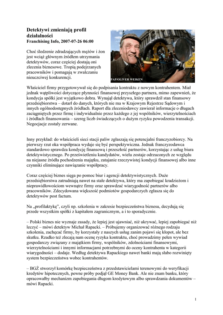 Detektywi zmieniają profil działalności Franchising Info, 2007-07-26 06:00 Choć śledzenie zdradzających mężów i żon jest wciąż głównym źródłem utrzymania detektywów, coraz częściej dostają oni zlecenia biznesowe. Tropią podejrzanych pracowników i pomagają w zwalczaniu nieuczciwej konkurencji. PAP/OLIVER WEIKEN Właściciel firmy przygotowywał się do podpisania kontraktu z nowym kontrahentem. Miał jednak wątpliwości dotyczące płynności finansowej przyszłego partnera, mimo zapewnień, że kondycja spółki jest wyjątkowo dobra. Wynajął detektywa, który sprawdził stan finansowy przedsiębiorstwa – dotarł do danych, których nie ma w Krajowym Rejestrze Sądowym i innych ogólnodostępnych źródłach. Raport dla zleceniodawcy zawierał informacje o długach zaciągniętych przez firmę i indywidualnie przez każdego z jej wspólników, wierzytelnościach i źródłach finansowania – szereg liczb świadczących o dużym ryzyku powodzenia transakcji. Negocjacje zostały zerwane. Inny przykład: do właścicieli sieci stacji paliw zgłaszają się potencjalni franczyzobiorcy. Na pierwszy rzut oka współpraca wydaje się być perspektywiczna. Jednak franczyzodawca standardowo sprawdza kondycję finansową i przeszłość partnerów, korzystając z usług biura detektywistycznego. Po prześwietleniu kandydatów, wielu zostaje odrzuconych ze względu na niejasne źródła pochodzenia majątku, zatajanie rzeczywistej kondycji finansowej albo inne czynniki eliminujące nawiązanie współpracy. Coraz częściej biznes sięga po pomoc biur i agencji detektywistycznych. Duże przedsiębiorstwa zatrudniają nawet na stałe detektywa, który ma zapobiegać kradzieżom i nieprawidłowościom wewnątrz firmy oraz sprawdzać wiarygodność partnerów albo pracowników. Zdecydowana większość podmiotów gospodarczych zgłasza się do detektywów post factum. Na „profilaktykę”, czyli np. szkolenia w zakresie bezpieczeństwa biznesu, decydują się przede wszystkim spółki z kapitałem zagranicznym, a i to sporadycznie. – Polski biznes nie wyznaje zasady, że lepiej jest ujawniać, niż ukrywać, lepiej zapobiegać niż leczyć – mówi detektyw Michał Rapacki. – Próbujemy organizować różnego rodzaju szkolenia, zachęcać firmy, by korzystały z naszych usług zanim pojawi się kłopot, ale bez skutku. Rzadko też zlecają nam ocenę ryzyka kontraktu, choć prowadzimy pełen wywiad gospodarczy związany z majątkiem firmy, wspólników, zdolnościami finansowymi, wierzytelnościami i innymi informacjami potrzebnymi do oceny kontrahenta w kategorii wiarygodności – dodaje. Według detektywa Rapackiego nawet banki mają słabo rozwinięty system bezpieczeństwa wobec kontrahentów. – BGŻ stworzył komórkę bezpieczeństwa z przedstawicielami terenowymi do weryfikacji kredytów hipotecznych, pewne próby podjął GE Money Bank. Ale nie znam banku, który opracowałby mechanizm zapobiegania długom kredytowym albo sprawdzania dokumentów – mówi Rapacki. 1 – Przy wyłudzeniach kredytowych przez podmioty gospodarcze często samo zaświadczenie o prowadzeniu działalności gospodarczej jest już fałszywe, bo kredyt wypłacony jest w ciągu tygodnia, a weryfikacja w urzędzie miasta trwa dwa tygodnie. Wystarczyłoby zatrudnić detektywa lub osobę uprawnioną i przeszkoloną, a weryfikacja dokumentów potrwałaby dzień – twierdzi. Podobnie jest z zabezpieczeniem przed nieuczciwą konkurencją. W opinii detektywów, prewencja to właściwy sposób postępowania. Jeśli przedsiębiorca zauważy jakieś nieprawidłowości, powinien natychmiast to zgłaszać. W chwili, gdy zwleka, albo, co gorsza, sam interweniuje, może tylko stracić, bo podejrzany zatrze wcześniej wszystkie ślady. Jako przykład do naśladowania, fachowcy wskazują postępowanie właściciela dużej sieci pizzerii. Przedsiębiorca planował wprowadzić nową promocję we wszystkich swoich lokalach. Jednak na tydzień przed terminem rozpoczęcia akcji promocyjnej, taka sama zniżka pojawiła się w ofercie konkurencji. Wszystko wskazywało na to, że wśród pracowników znajduje się „wtyka”. Właściciel postanowił zatrudnić detektywa. Specjalista zatrudniony w celu wskazania sabotującego członka personelu potwierdził podejrzenia szefa sieci. Okazało się, że jedna z osób pracuje jednocześnie dla konkurencji. Wyręczając policję O tym, jakie korzyści może przynieść współpraca z detektywem, świadczą chociażby listy referencyjne. Michał Rapacki posiada wiele referencji znanych firm: zarówno tych liczących 10-15 zatrudnionych osób, jak i tych zaliczanych do pierwszej dziesiątki największych firm w Polsce. Wśród jego klientów są również firmy franczyzowe. Właściciel agencji detektywistycznej nie narzeka na brak zleceń. Zajmuje się w większości przypadków wykroczeniami typu: podrabianie towarów, nieuczciwa konkurencja pracowników wobec pracodawcy, czyli ujawnianie tajemnicy służbowej, sprzedaż informacji oraz wzorów zastrzeżonych, a także ochroną marki, czyli wykrywaniem i eliminacją produkcji, albo handlu nielegalnym towarem danego producenta. – Na rynku mamy bardzo dużo podrobionych kosmetyków. Producent oryginalnych perfum o wartości rynkowej 300 zł traci na każdej podrobionej butelce 100-150 zł. Kupujący perfumy za 50-100 zł nie zdaje sobie sprawy, że na drugi dzień jego skóra może po prostu śmierdzieć albo zareagować alergicznie. A gdy tak się stanie, zgłasza się z pretensjami do producenta, a traci na tym wizerunek marki. To samo dotyczy procederu rozprowadzania nielegalnego alkoholu. Zajmują się tym najczęściej zorganizowane grupy przestępcze – mówi Michał Rapacki. – Staramy się zidentyfikować zagrożenie, rozpoznać rynek: sprawdzamy hurtownie, bazary, stoiska nielicencjonowane. Dowiadujemy się, kto handluje podrobionym asortymentem, a kto jest producentem. Kupujemy nawet mniejsze lub