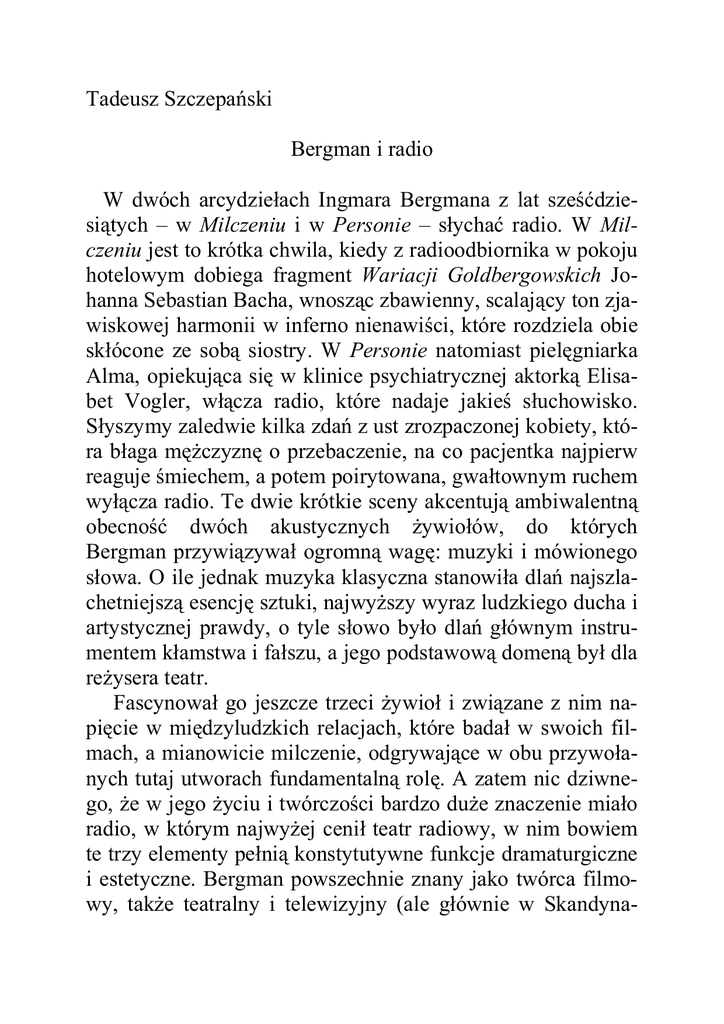 Tadeusz Szczepański Bergman i radio W dwóch arcydziełach Ingmara Bergmana z lat sześćdziesiątych – w Milczeniu i w Personie – słychać radio. W Milczeniu jest to krótka chwila, kiedy z radioodbiornika w pokoju hotelowym dobiega fragment Wariacji Goldbergowskich Johanna Sebastian Bacha, wnosząc zbawienny, scalający ton zjawiskowej harmonii w inferno nienawiści, które rozdziela obie skłócone ze sobą siostry. W Personie natomiast pielęgniarka Alma, opiekująca się w klinice psychiatrycznej aktorką Elisabet Vogler, włącza radio, które nadaje jakieś słuchowisko. Słyszymy zaledwie kilka zdań z ust zrozpaczonej kobiety, która błaga męŜczyznę o przebaczenie, na co pacjentka najpierw reaguje śmiechem, a potem poirytowana, gwałtownym ruchem wyłącza radio. Te dwie krótkie sceny akcentują ambiwalentną obecność dwóch akustycznych Ŝywiołów, do których Bergman przywiązywał ogromną wagę: muzyki i mówionego słowa. O ile jednak muzyka klasyczna stanowiła dlań najszlachetniejszą esencję sztuki, najwyŜszy wyraz ludzkiego ducha i artystycznej prawdy, o tyle słowo było dlań głównym instrumentem kłamstwa i fałszu, a jego podstawową domeną był dla reŜysera teatr. Fascynował go jeszcze trzeci Ŝywioł i związane z nim napięcie w międzyludzkich relacjach, które badał w swoich filmach, a mianowicie milczenie, odgrywające w obu przywołanych tutaj utworach fundamentalną rolę. A zatem nic dziwnego, Ŝe w jego Ŝyciu i twórczości bardzo duŜe znaczenie miało radio, w którym najwyŜej cenił teatr radiowy, w nim bowiem te trzy elementy pełnią konstytutywne funkcje dramaturgiczne i estetyczne. Bergman powszechnie znany jako twórca filmowy, takŜe teatralny i telewizyjny (ale głównie w Skandyna- 2 wii), był równieŜ reŜyserem radiowym. Napisał dwa, a zrealizował trzydzieści dziewięć słuchowisk radiowych; jego dramaty były teŜ inscenizowane w radiu przez innych reŜyserów. Ten rozdział jego twórczości artystycznej jest prawie całkowicie nieznany. Nawet szwedzcy bergmaniści, którzy mają najłatwiejszy dostęp do źródeł, zdają się go ignorować1. Dość powiedzieć, Ŝe w wydanej wiosną ubiegłego roku w Szwecji, sześćsetstronicowej, opartej w duŜej mierze na nieznanych do tej pory źródłach biografii pt. Lusten och dämonerna. Boken om Bergman (Pragnienie i demony. KsiąŜka o Bergmanie, Stockholm 2008) pióra Mikaela Timma, który skrupulatnie omawia wszystkie filmy, przedstawienia teatralne i operowe, seriale telewizyjne i dramaturgię, słuchowiska pominięte są głuchym milczeniem, jeśli nie liczyć fotografii reŜysera z aktorami w studio radiowym z następującym podpisem: „W latach pięćdziesiątych Bergman duŜo pracował w teatrze radiowym: »Kocham to medium. Przypomina muzykę kameralną z głosami aktorów«”. Jedynie Szwedzkie Radio (program I i SR Minnen) kultywuje pamięć o radiowym Bergmanie, poniewaŜ na internetowym portalu tej instytucji w rubryce Bergmaniana moŜna znaleźć prawie kompletny spis2 jego słuchowisk radiowych, z których piętnaście zaginęło, ale te ocalałe przy róŜnych okazjach bywają retransmitowane (jak np. Wielkanoc Augusta Strindberga z 1952 roku, najczęściej wznawiana pozycja w świątecznym repertuarze). Warto teŜ pamiętać, Ŝe jego ostatnim – obok telewizyjnego filmu Sarabanda – dokonaniem ar1 Jedynym chwalebnym wyjątkiem – jak do tej pory – jest tutaj Egil Törnqvist, który dwóch ksiąŜkach – Between Stage and Screen. Ingmar Bergman Directs, Amsterdam University Press, Amsterdam 1995 i Bergman’s Muses.Æsthetic Versality In Film,Theatre,Television and Radio, Mc Farland & Company, Inc., Publishers, Jefferson, North Carolina and London 2003 – poświęca osobne rozdziały słuchowiskom Bergmana, opartym zwłaszcza na sztukach Strindberga. Na uwagę zasługuje równieŜ tekst Magnusa Florina Ingmar Bergman regisserar Strindberg för Radioteatern, opublikowany na stronie internetowej Szwedzkiego Radia (www.sr.se). 2 www.sr.se (brak Pierwszego ostrzeŜenia Strindberga); pełną listę realizacji radiowych Bergmana wraz z ich obsadą i głosami krytyki zamieszcza równieŜ Birgitta Steene w swoim monumentalnym opracowaniu Ingmar Bergman. A Reference Guide, Amsterdam University Press, Amsterdam 2005 (z tego teŜ źródła będę czerpał większość cytatów z radiowych recenzji słuchowisk Bergmana); moŜna ją teŜ znaleźć w Internecie (www.ingmarbergman.se). 3 tystycznym był wystawiony w radiu w 2003 roku Pelikan. W następnym roku zamierzał zrealizować radiowego Rosmersholma Ibsena, do którego opracował scenariusz, ale zamysł ten musiał porzucić ze względu na pogarszający się stan zdrowia, zostawiając jego realizację Gunnel Lindblom. 1. Ingmar Bergman nie byłby sobą, gdyby fascynacji radiem nie wywiódł z wczesnego dzieciństwa. W wywiadzie radiowym (!), jaki w styczniu 2003 roku przeprowadził z nim Magnus Florin, reŜyser opowiadał o swoim pierwszym kontakcie z radiem. W wieku dziewięciu lub dziesięciu lat dostał w prezencie radio z detektorem kryształkowym. W tamtej epoce młoda, powstała w 1922 roku, radiofonia szwedzka nadawała od 1925 roku wiele słuchowisk radiowych. Mały Ingmar, który był obdarzony słuchową nadwraŜliwością (choć później nabawił się defektu prawego ucha w czasie słuŜby wojskowej w artylerii) – o czym świadczą chociaŜby tytuły jego późniejszych filmów: Muzyka w ciemnościach, Milczenie, Szepty i krzyki czy Sonata jesienna – wieczorami namiętnie słuchał radia, pogrąŜając się w fascynującym go świecie dźwięków. Radio – obok dziecięcego teatrzyku i latarni czarnoksięskiej – stało się kolejnym magicznym rekwizytem jego dzieciństwa. Zapamiętał z tego okresu dwa „kolosalne przeŜycia”: radiową adaptację Tragedii amerykańskiej Theodore’a Dreisera i słuchowisko na podstawie Do Damaszku Augusta Strindberga. Z Tragedii amerykańskiej