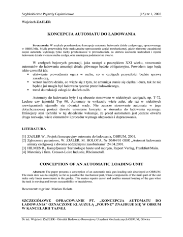 Szybkobieżne Pojazdy Gąsienicowe (15) nr 1, 2002 Wojciech ZAJLER KONCEPCJA AUTOMATU DO ŁADOWANIA Streszczenie: W artykule przedstawiono koncepcje automatu ładowania działa czołgowego, opracowanego w OBRUMie. Myślą przewodnią było maksymalne uproszczenie części mechanicznej, gdzie elementy zasadniczej części automatu wykonują tylko ruchy prostoliniowe w prowadnicach, co ułatwia usuwanie uszkodzeń i ręczne ładowanie działa w czasie ruchu czołgu, oraz zmniejsza podatność na awarie. W czołgach bojowych generacji, jaka nastąpi z początkiem XXI wieku, stosowanie automatów do ładowania amunicji działa głównego będzie obligatoryjne. Powodem tego będą takie czynniki jak: ułatwienie prowadzenia ognia w ruchu, co w czołgach przyszłości będzie sprawą zasadniczą, wzrost kalibru działa, co wiąże się z tym, że amunicja stanie się ciężka i duża, tak że nie będzie już mogła być ładowana ręcznie przez ładowniczego, trend do redukcji załogi do dwóch osób. Automaty do ładowania były i są obecnie stosowane w niektórych czołgach, np. T-72, Leclerc czy japoński Typ 90. Automaty te wykazały wiele zalet, ale też w niektórych rozwiązaniach ujawniły się również wady. Nie zawsze stosowanie automatu w jego dotychczasowej postaci dawało wymierne korzyści w stosunku do ładowania ręcznego. Dzisiejszy stan techniki w tej dziedzinie wskazuje, że przed automatem jest jeszcze otwarta droga rozwoju, wiele elementów i procedur wymaga ulepszenia i dopracowania. LITERATURA [1] ZAJLER W., Projekt koncepcyjny automatu do ładowania, OBRUM, 2001. [2] Zgłoszenie patentowe, W. ZJALER, M. HOLOTA, Nr 20/04/01 OBR „Automat ładowania armaty czołgowej z dwoma oddzielnymi zasobnikami” 24.04.2001. [3] HILMES R., Kampfpanzer Technologie heute und morgen, Report Verlag, Frankfurt/Main. [4] Materiały i firm. Creusot-Loire Industie, Rheinmetall. CONCEPTION OF AN AUTOMATIC LOADING UNIT Abstract: The paper presents a conception of an automatic tank gun-loading unit developed at OBRUM. The main idea was to simplify as far as possible the mechanical part, where components of the main part of the unit make only linear movements in the guides. This makes repairs easier and enables manual loading of the gun when the tank is moving and lowers susceptibility to breakdowns. Recenzent: mgr inż. Marian Holota SZCZEGÓŁOWE OPRACOWANIE PT. „KONCEPCJA AUTOMATU DO ŁADOWANIA” OZNACZONE KLAUZULĄ „POUFNE” ZNAJDUJE SIĘ W OBRUM W KANCELARII TAJNEJ. Dr inż. Wojciech ZAJLER - Ośrodek Badawczo-Rozwojowy Urządzeń Mechanicznych OBRUM, Gliwice