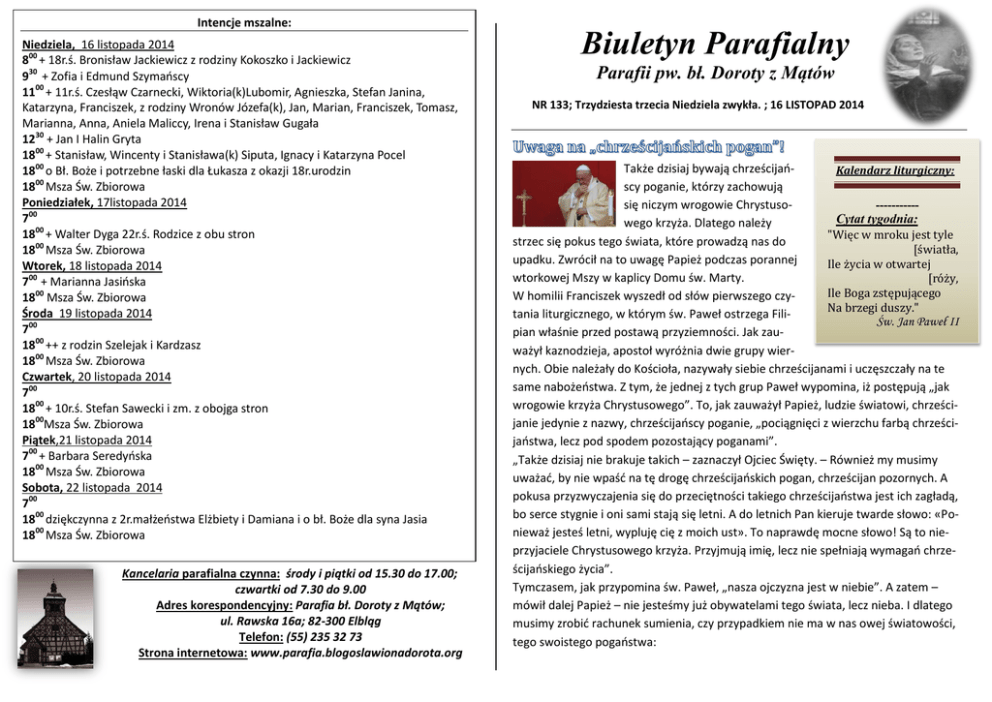 Intencje mszalne: Niedziela, 16 listopada 2014 800 + 18r.ś. Bronisław Jackiewicz z rodziny Kokoszko i Jackiewicz 930 + Zofia i Edmund Szymańscy 1100 + 11r.ś. Czesłąw Czarnecki, Wiktoria(k)Lubomir, Agnieszka, Stefan Janina, Katarzyna, Franciszek, z rodziny Wronów Józefa(k), Jan, Marian, Franciszek, Tomasz, Marianna, Anna, Aniela Maliccy, Irena i Stanisław Gugała 1230 + Jan I Halin Gryta 1800 + Stanisław, Wincenty i Stanisława(k) Siputa, Ignacy i Katarzyna Pocel 1800 o Bł. Boże i potrzebne łaski dla Łukasza z okazji 18r.urodzin 1800 Msza Św. Zbiorowa Poniedziałek, 17listopada 2014 700 1800 + Walter Dyga 22r.ś. Rodzice z obu stron 1800 Msza Św. Zbiorowa Wtorek, 18 listopada 2014 700 + Marianna Jasińska 1800 Msza Św. Zbiorowa Środa 19 listopada 2014 700 1800 ++ z rodzin Szelejak i Kardzasz 1800 Msza Św. Zbiorowa Czwartek, 20 listopada 2014 700 1800 + 10r.ś. Stefan Sawecki i zm. z obojga stron 1800Msza Św. Zbiorowa Piątek,21 listopada 2014 700 + Barbara Seredyńska 1800 Msza Św. Zbiorowa Sobota, 22 listopada 2014 700 1800 dziękczynna z 2r.małżeństwa Elżbiety i Damiana i o bł. Boże dla syna Jasia 1800 Msza Św. Zbiorowa Kancelaria parafialna czynna: środy i piątki od 15.30 do 17.00; czwartki od 7.30 do 9.00 Adres korespondencyjny: Parafia bł. Doroty z Mątów; ul. Rawska 16a; 82-300 Elbląg Telefon: (55) 235 32 73 Strona internetowa: www.parafia.blogoslawionadorota.org Biuletyn Parafialny Parafii pw. bł. Doroty z Mątów NR 133; Trzydziesta trzecia Niedziela zwykła. ; 16 LISTOPAD 2014 Także dzisiaj bywają chrześcijańKalendarz liturgiczny: scy poganie, którzy zachowują ----------się niczym wrogowie ChrystusoCytat tygodnia: wego krzyża. Dlatego należy "Więc w mroku jest tyle strzec się pokus tego świata, które prowadzą nas do [światła, upadku. Zwrócił na to uwagę Papież podczas porannej Ile życia w otwartej wtorkowej Mszy w kaplicy Domu św. Marty. [róży, Ile Boga zstępującego W homilii Franciszek wyszedł od słów pierwszego czyNa brzegi duszy." tania liturgicznego, w którym św. Paweł ostrzega FiliŚw. Jan Paweł II pian właśnie przed postawą przyziemności. Jak zauważył kaznodzieja, apostoł wyróżnia dwie grupy wiernych. Obie należały do Kościoła, nazywały siebie chrześcijanami i uczęszczały na te same nabożeństwa. Z tym, że jednej z tych grup Paweł wypomina, iż postępują „jak wrogowie krzyża Chrystusowego”. To, jak zauważył Papież, ludzie światowi, chrześcijanie jedynie z nazwy, chrześcijańscy poganie, „pociągnięci z wierzchu farbą chrześcijaństwa, lecz pod spodem pozostający poganami”. „Także dzisiaj nie brakuje takich – zaznaczył Ojciec Święty. – Również my musimy uważać, by nie wpaść na tę drogę chrześcijańskich pogan, chrześcijan pozornych. A pokusa przyzwyczajenia się do przeciętności takiego chrześcijaństwa jest ich zagładą, bo serce stygnie i oni sami stają się letni. A do letnich Pan kieruje twarde słowo: «Ponieważ jesteś letni, wypluję cię z moich ust». To naprawdę mocne słowo! Są to nieprzyjaciele Chrystusowego krzyża. Przyjmują imię, lecz nie spełniają wymagań chrześcijańskiego życia”. Tymczasem, jak przypomina św. Paweł, „nasza ojczyzna jest w niebie”. A zatem – mówił dalej Papież – nie jesteśmy już obywatelami tego świata, lecz nieba. I dlatego musimy zrobić rachunek sumienia, czy przypadkiem nie ma w nas owej światowości, tego swoistego pogaństwa: „Czy lubię się chwalić? Czy pociągają mnie pieniądze? Czy podoba mi się duma, pycha? Skąd wyrastają moje korzenie, to znaczy czego jestem obywatelem: nieba czy ziemi? Świata czy ducha światowości? A nasza ojczyzna jest w niebie i stamtąd wyczekujemy, jako Zbawcy, Pana Jezusa Chrystusa. A tamci? Ich losem jest zagłada! Ci malowani chrześcijanie skończą marnie... I patrzcie na cel: dokąd prowadzi to obywatelstwo, które masz w sercu? Światowe – ku zagładzie; przynależność do Chrystusowego krzyża – na spotkanie z Nim” – powiedział Papież. Na koniec odniósł się do przypowieści o nieuczciwym rządcy, którą słyszymy w Ewangelii. Zachęcił przy tym wiernych, by „stali mocno w Panu”, nie ulegając pokusie zepsucia: „Jak doszedł ów rządca z Ewangelii do tego, że zaczął oszukiwać i okradać swego pana? Czy stało się to z dnia na dzień? Nie. Przecież to się dzieje krok po kroku. Jednego dnia jakiś prezencik tu, drugiego jakaś łapówka tam, i tak krok za krokiem dochodzi się do korupcji. Droga światowości owych nieprzyjaciół Chrystusowego krzyża wygląda właśnie tak: prowadzi do zepsucia! I kończy się jak u tego człowieka – do jawnej kradzieży...” KRRiT twierdzi, że nie dostaje skarg w związku z emisją spotu "Najbliżsi obcy". Natomiast organizacja CitizenGO poinformowała, że za pomocą ich strony internetowej co najmniej kilka tysięcy osób wysłało do Krajowej Rady petycję z żądaniem zdjęcia spotu z emisji. A to nie jedyna droga, którą można owe protesty wysyłać. Dlaczego nie dochodzą do KRRiT? Rzeczniczka instytucji powiedziała KAI, że skargi owszem wpłynęły do Rady, ale tylko przed emisją spotu. W piątek, 7 listopada br., rzeczniczka KRRiT, odnosząc się do spotu "Najbliżsi obcy", na antenie radia tok.fm powiedziała, że "skala protestu jest ogromna". Dodała, że Krajowa Rada Radiofonii i Telewizji otrzymała 54 200 protestów drogą mailową. Takiej wypowiedzi Katarzyna Twardowska udzieliła w 10 dniu emisji spotu. Dzisiaj powiedziała KAI, że jej wypowiedź dotyczyła protestów, które wpłynęły do Krajowej Rady przed emisją spotu. Natomiast Magdalena Korzekwa z organizacji CitizenGo, powiedziała KAI, że "maili z żądaniem zdjęcia z emisji spotu "Najbliżsi obcy", wysłano z ich strony co najmniej kilka tysięcy". 13 listopada licznik podpisanych petycji na stronie internetowej organizacji, łącznie - przed i po emisji spotu - wskazywał liczb