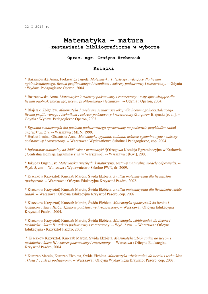 22 I 2015 r. Matematyka – matura -zestawienie bibliograficzne w wyborze Oprac. mgr. Grażyna Hrebeniuk Książki * Baszanowska Anna, Forkiewicz Jagoda. Matematyka 1 :testy sprawdzające dla liceum ogólnokształcącego, liceum profilowanego i technikum : zakresy podstawowy i rozszerzony. -- Gdynia : Wydaw. Pedagogiczne Operon, 2004. * Baszanowska Anna. Matematyka 2 :zakresy podstawowy i rozszerzony : testy sprawdzające dla liceum ogólnokształcącego, liceum profilowanego i technikum. -- Gdynia : Operon, 2004. * Blajerski Zbigniew. Matematyka 1 :wybrane scenariusze lekcji dla liceum ogólnokształcącego, liceum profilowanego i technikum : zakresy podstawowy i rozszerzony /Zbigniew Blajerski [et al.]. -Gdynia : Wydaw. Pedagogiczne Operon, 2003. * Egzamin z matematyki dla poziomu podstawowego opracowany na podstawie przykładów zadań angielskich. Z.7. -- Warszawa : MEN, 1999. * Herbut Irmina, Olszańska Anna. Matematyka :pytania, zadania, arkusze egzaminacyjne : zakresy podstawowy i rozszerzony. -- Warszawa : Wydawnictwa Szkolne i Pedagogiczne, cop. 2004. * Informator maturalny od 2005 roku z matematyki /[Okręgowa Komisja Egzaminacyjna w Krakowie ; Centralna Komisja Egzaminacyjna w Warszawie]. -- Warszawa : [b.w.], 2003. * Jakubas Eugeniusz. Matematyka :niezbędnik maturzysty, zestawy maturalne, modele odpowiedzi. -Wyd. 5, zm. -- Warszawa : Wydawnictwo Szkolne PWN, dr. 2009. * Kłaczkow Krzysztof, Kurczab Marcin, Świda Elżbieta. Analiza matematyczna dla licealistów :podręcznik. -- Warszawa : Oficyna Edukacyjna Krzysztof Pazdro, 2002. * Kłaczkow Krzysztof, Kurczab Marcin, Świda Elżbieta. Analiza matematyczna dla licealistów :zbiór zadań. -- Warszawa : Oficyna Edukacyjna Krzysztof Pazdro, cop. 2002. * Kłaczkow Krzysztof, Kurczab Marcin, Świda Elżbieta. Matematyka :podręcznik do liceów i techników : klasa III.Cz. 1,Zakres podstawowy i rozszerzony. -- Warszawa : Oficyna Edukacyjna Krzysztof Pazdro, 2004. * Kłaczkow Krzysztof, Kurczab Marcin, Świda Elżbieta. Matematyka :zbiór zadań do liceów i techników : klasa II : zakres podstawowy i rozszerzony. -- Wyd. 2 zm. -- Warszawa : Oficyna Edukacyjna - Krzysztof Pazdro, 2006. * Kłaczkow Krzysztof, Kurczab Marcin, Świda Elżbieta. Matematyka :zbiór zadań do liceów i techników : klasa III : zakres podstawowy i rozszerzony. -- Warszawa : Oficyna Edukacyjna Krzysztof Pazdro, 2004. * Kurczab Marcin, Kurczab Elżbieta, Świda Elżbieta. Matematyka :zbiór zadań do liceów i techników : klasa 1 : zakres podstawowy. -- Warszawa : Oficyna Wydawnicza Krzysztof Pazdro, cop. 2008. * Ludwikowska Ewa, Brzezińska Jadwiga. Matematyka :zestawy maturalne : zakres podstawowy, zakres rozszerzony dla liceum i technikum. -- Warszawa : Nowa Era, 2005. * Ludwikowska Małgorzata, Krawczyk Marcin. Matematyka :nowa matura 2005 : zakres podstawowy i rozszerzony : suplement dla nauczyciela liceum ogólnokształcącego, liceum profilowanego i technikum. -- Gdynia : Operon, 2005. * Ludwikowska Małgorzata, Krawczyk Marcin. Matematyka :nowa matura 2005 : zakresy podstawowy i rozszerzony : testy dla ucznia liceum ogólnokształcącego, liceum profilowanego i technikum. -- Gdynia : "Operon", 2005. * Matematyka dla klasy 2 liceum i technikum :zakres podstawowy i rozszerzony /Ryszard Kalina [i in.]. -- Poznań : Wydw. SENS, cop. 2003. * Matematyka - raport z egzaminu maturalnego na Dolnym Śląsku i Opolszczyźnie w 2006 roku /[przyg. zespół ekspertów Okręgowej Komisji Egzaminacyjnej we Wrocławiu] ; Okręgowa Komisja Egzaminacyjna we Wrocławiu. -- Wrocław : Wydawnictwo Continuo, 2006. * Orlińska Marzena. Matematyka :matura 2013 : poziom podstawowy : testy i arkusze dla maturzysty. -- Gdynia : Wydawnictwo Pedagogiczne Operon, 2012. * Orlińska Marzena. Matematyka :matura 2013 : poziom rozszerzony : testy i arkusze dla maturzysty. -- Gdynia : Wydawnictwo Pedagogiczne Operon, 2012. * Osiągnięcia maturzystów w roku 2007 :komentarz do zadań z przedmiotów matematycznoprzyrodniczych : sprawozdanie z egzaminu maturalnego 2007 /[wstęp i red. Katarzyna Lisowska, Barbara Czarnecka-Cicha]. -- Warszawa : Centralna Komisja Egzaminacyjna, 2007. * Osiągnięcia maturzystów w roku 2007 :sprawozdanie z egzaminu maturalnego 2007 /[oprac. Barbara Czarnecka-Cicha ; współpr. Barbara Andrzejewska et al. ; materiał oprac. w Centralnej Komisji Egzaminacyjnej przy współpr. wszystkich okręgowych komisji egzaminacyjnych]. -Warszawa : Centralna Komisja Egzaminacyjna, 2007. * Pawłowski Henryk. Matematyka 3 :zakresy podstawowy i rozszerzony : zbiór zadań dla liceum ogólnokształcącego, liceum profilowanego i technikum : linia 1 ponadstandardowa. -- Gdynia : Operon, 2004. * Pawłowski Henryk. Matematyka 3 :zakres podstawowy : podręcznik dla liceum ogólnokształcącego, liceum profilowanego i technikum. -- Gdynia : "Operon", 2004. * Pawłowski Henryk, Tomalczyk Wojciech. Zadania z matematyki dla olimpijczyków :gimnazjalistów i licealistów. -- Wyd. 3. -- Toruń : Oficyna Wydawnicza "Tutor", 2010. * Piórek Katarzyna. Repetytorium maturzysty :matematyka : cały materiał w jednej książce, wszystkie zadania z rozwiązaniami, objaśnienia krok po kroku /[aut. Katarzyna Piórek]. -- Kraków : Wydawnictwo Greg, cop. 2009. * Pyrdoł Piotr. Matematyka 1 :zakresy podstawowy i rozszerzony : zbiór zadań dla liceum ogólnokształcącego, liceum profilowanego i technikum : linia 2 [standardowa]. -- Gdynia : Wydaw. Pedagogiczne Operon, 2003. * Pyrdoł Piotr. Matematyka 2 :zakresy podstawowy i rozszerzony : zbiór zadań dla liceum ogólnokształcącego, liceum profilowanego i technikum : linia 2 standardowa. -- Gdynia : Operon, 2004. * Raport z egzaminu maturalnego z matematyki na Dolnym Śląsku i Opolszczyźnie w sesji wiosennej 2005 roku /Okręgowa Komisja Egzaminacyjna we Wrocławiu. -- Wrocław : Wydawnictwo Continuo, 2005. * Syllabus i egzamin pilotażowy :matematyka /[aut. Urszula Aszychmin et al.]. -- Warszawa : Ministerstwo Edukacji Narodowej, 1999.