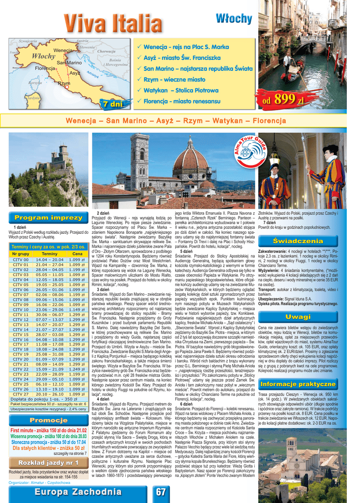 Viva Italia Austria Szwajcaria Francja Monaco Wenecja Włochy Florencja Korsyka Słowenia Chorwacja Bośnia i Hercegowina San Marino Asyż Ad ria tyk Wenecja - rejs na Plac S. Marka Asyż - miasto Św. Franciszka San Marino – najstarsza republika Świata Rzym - wieczne miasto Rzym Watykan – Stolica Piotrowa Sardynia 7 dni Florencja - miasto renesansu od 899 zł We n e c j a – S a n M a r i n o – A s y ż – R z y m – Wa t y k a n – F l o r e n c j a 2 dzień Przyjazd do Wenecji - rejs wynajętą łodzią po Lagunie Weneckiej. Po rejsie piesze zwiedzanie. Spacer rozpoczynamy od Placu Św. Marka – 1 dzień Wyjazd z Polski według rozkładu jazdy. Przejazd do zdaniem Napoleona Bonaparte „najpiękniejszego salonu świata”. Następnie zwiedzamy Bazylikę Włoch przez Czechy i Austrię. Św. Marka - sanktuarium skrywające relikwie Św. Terminy i ceny za os. w pok. 2/3 os. Marka i najcenniejsze dzieło jubilerskie zwane Pala d’Oro - Złotym Ołtarzem, sprowadzone z podbitego Nr grupy Terminy Cena w 1204 roku Konstantynopola. Będziemy również CITV 00 14.04 – 20.04 1.099 zł podziwiać Pałac Dożów oraz Most Westchnień. CITV 01 21.04 – 27.04 1.099 zł Wjazd na Kampanillę – dzwonnicę Św. Marka, z CITV 02 28.04 – 04.05 1.199 zł której rozpościera się widok na Lagunę Wenecką. CITV 03 05.05 – 11.05 1.099 zł Spacer malowniczymi uliczkami do Mostu Rialto, CITV 04 12.05 – 18.05 1.099 zł czas wolny na posiłek. Przejazd do hotelu w okolicy CITV 05 19.05 – 25.05 1.099 zł Rimini, kolacja*, nocleg. 3 dzień CITV 06 26.05 – 01.06 1.099 zł Śniadanie. Wyjazd do San Marino - zwiedzanie najCITV 07 02.06 – 08.06 1.199 zł starszej republiki świata znajdującej się w obrębie CITV 08 09.06 – 15.06 1.099 zł państwa włoskiego. Pieszy spacer wśród średnioCITV 09 16.06 – 22.06 1.099 zł wiecznej architektury rozpoczniemy od najstarszej CITV 10 23.06 – 29.06 1.149 zł bramy prowadzącej do stolicy republiki - Bramy CITV 11 30.06 – 06.07 1.299 zł Św. Franciszka. Następnie przejdziemy do Groty CITV 12 07.07 – 13.07 1.299 zł Kuszników i przed budynek parlamentu Republiki CITV 13 14.07 – 20.07 1.299 zł S. Marino. Dalej nawiedzimy Bazylikę Del Santo, CITV 14 21.07 – 27.07 1.299 zł w której przechowywane są relikwie Św. Marino CITV 15 28.07 – 03.08 1.299 zł i przejdziemy do wieży Guida, najstarszej części CITV 16 04.08 – 10.08 1.299 zł fortyfikacji otaczającej średniowieczne San Marino. CITV 17 11.08 – 17.08 1.299 zł Przejazd do Umbrii. Wizyta w Asyżu - mieście Św. CITV 18 18.08 – 24.08 1.299 zł Franciszka. Zwiedzanie Bazyliki S.Maria degli AngeCITV 19 25.08 – 31.08 1.299 zł li z Kaplicą Porcjunkuli – miejsca będącego kolebką CITV 20 01.09 – 07.09 1.299 zł zakonu franciszkańskiego, a także miejsca śmierci CITV 21 08.09 – 14.09 1.299 zł świętego. Wizyta w Bazylice Św. Franciszka. W baCITV 22 15.09 – 21.09 1.249 zł zylice nawiedzimy grób Św. Franciszka oraz będzieCITV 23 22.09 – 28.09 1.199 zł my podziwiać m.in. cykl 28 fresków mistrza Giotto. CITV 24 29.09 – 05.10 1.099 zł Następnie spacer przez centrum miasta, na koniec CITV 25 06.10 – 12.10 1.099 zł którego zwiedzimy Kościół Św. Klary. Przejazd do CITV 26 13.10 – 19.10 1.099 zł hotelu w okolicy Fiuggi na południe od Rzymu, koCITV 27 20.10 – 26.10 1.099 zł lacja*, nocleg. Dopłata do pokoju 1-os. - 350 zł 4 dzień Pakiet bezpieczeństwa 50 zł - szczegóły na str. 6 Śniadanie. Wyjazd do Rzymu. Przejazd metrem do Bazyliki Św. Jana na Lateranie i znajdujących się Ubezpieczenie kosztów rezygnacji - 2,4% ceny tuż obok Św. Schodów. Następnie przejście pod najsłynniejszy amfiteatr świata – Koloseum. WejPromocje dziemy także na Wzgórze Palatyńskie, miejsce w którym narodziło się antyczne Imperium Rzymskie. First minute - zniżka 150 zł do dnia 21.02 Z Palatynu zjedziemy do Forum Romanum aby Wiosenna promocja - zniżka 100 zł do dnia 20.03 przejść słynną Via Sacra – Świętą Drogą, którą w Słoneczna promocja - zniżka 50 zł do 17.04 czasach antycznych kroczyli w swoich pochodach Dla stałych klientów - zniżka 50 zł triumfalnych wodzowie powracający ze zwycięskich szczegóły na stronie 7 bitew. Z Forum dotrzemy na Kapitol – miejsce od czasów antycznych uważane za serce duchowe, polityczne i kulturalne Rzymu. Następnie Plac Rozkład jazdy nr 1 Wenecki, przy którym stoi pomnik przypominający Rozkład jazdy, lista przystanków oraz wykaz dopłat o wielkim dziele zjednoczenia państwa włoskiego w latach 1860-1870 i przedstawiający pierwszego za miejsce wsiadania na str. 154-155 Program imprezy Organizator: Almatur - Częstochowa Europa Zachodnia 67 jego króla Wiktora Emanuela II. Piazza Navona z fontanną „Czterech Rzek” Berniniego. Panteon – perełka architektoniczna wybudowana w I połowie II wieku n.e., jedyna antyczna pozostałość stojąca po dziś dzień w całości. Na koniec naszego spaceru udamy się do najsłynniejszej fontanny świata – Fontanny Di Trevi i dalej na Plac i Schody Hiszpańskie. Powrót do hotelu, kolacja*, nocleg. 5 dzień Śniadanie. Przejazd do Stolicy Apostolskiej na Audiencję Generalną, będącą spotkaniem głowy kościoła rzymsko-katolickiego z wiernymi w formie katechezy. Audiencja Generalna odbywa się tylko w czasie obecności Papieża w Watykanie. Po otrzymaniu papieskiego błogosławieństwa, które oficjalnie kończy audiencję udamy się na zwiedzanie Muzeów Watykańskich, w których będziemy oglądać bogatą kolekcję dzieł sztuki zgromadzonych przez papieży wszystkich epok. Punktem kulminacyjnym naszego pobytu w Muzeach Watykańskich będzie zwiedzanie Kaplicy Sykstyńskiej – miejsca wielu w historii wyborów papieży, tzw. Konklawe. Podziwianie najpiękniejszych dzieł artystycznych kaplicy, fresków Michała Anioła – „Sąd ostateczny” i „Stworzenie Świata”. Wprost z Kaplicy Sykstyńskiej zejdziemy do Ba