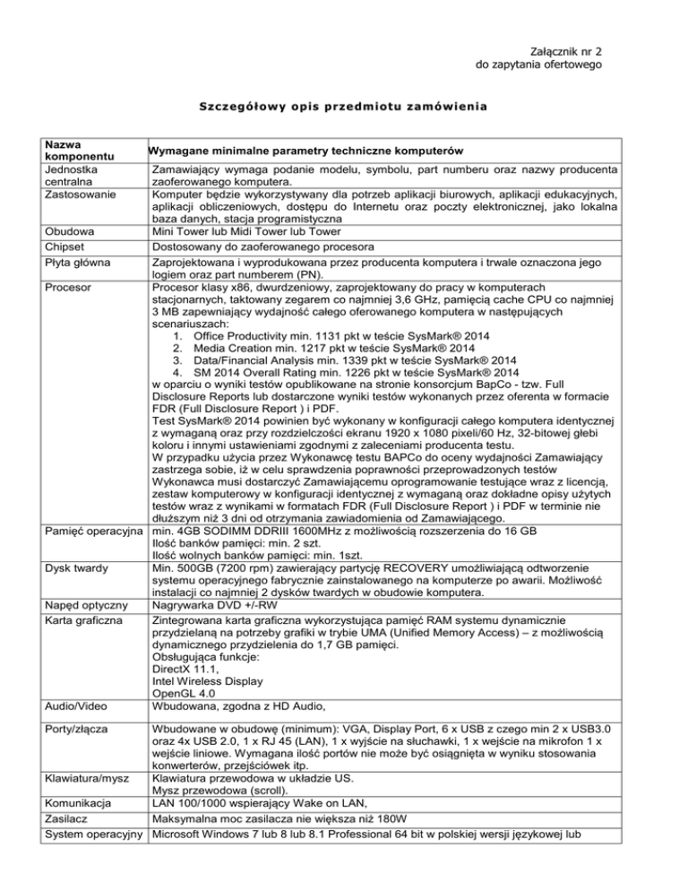 Załącznik nr 2 do zapytania ofertowego S z cz eg ół o wy o p is p r z e d mi o tu z a m ó wi e ni a Nazwa komponentu Jednostka centralna Zastosowanie Wymagane minimalne parametry techniczne komputerów Zamawiający wymaga podanie modelu, symbolu, part numberu oraz nazwy producenta zaoferowanego komputera. Komputer będzie wykorzystywany dla potrzeb aplikacji biurowych, aplikacji edukacyjnych, aplikacji obliczeniowych, dostępu do Internetu oraz poczty elektronicznej, jako lokalna baza danych, stacja programistyczna Obudowa Mini Tower lub Midi Tower lub Tower Chipset Dostosowany do zaoferowanego procesora Płyta główna Zaprojektowana i wyprodukowana przez producenta komputera i trwale oznaczona jego logiem oraz part numberem (PN). Procesor Procesor klasy x86, dwurdzeniowy, zaprojektowany do pracy w komputerach stacjonarnych, taktowany zegarem co najmniej 3,6 GHz, pamięcią cache CPU co najmniej 3 MB zapewniający wydajność całego oferowanego komputera w następujących scenariuszach: 1. Office Productivity min. 1131 pkt w teście SysMark® 2014 2. Media Creation min. 1217 pkt w teście SysMark® 2014 3. Data/Financial Analysis min. 1339 pkt w teście SysMark® 2014 4. SM 2014 Overall Rating min. 1226 pkt w teście SysMark® 2014 w oparciu o wyniki testów opublikowane na stronie konsorcjum BapCo - tzw. Full Disclosure Reports lub dostarczone wyniki testów wykonanych przez oferenta w formacie FDR (Full Disclosure Report ) i PDF. Test SysMark® 2014 powinien być wykonany w konfiguracji całego komputera identycznej z wymaganą oraz przy rozdzielczości ekranu 1920 x 1080 pixeli/60 Hz, 32-bitowej głebi koloru i innymi ustawieniami zgodnymi z zaleceniami producenta testu. W przypadku użycia przez Wykonawcę testu BAPCo do oceny wydajności Zamawiający zastrzega sobie, iż w celu sprawdzenia poprawności przeprowadzonych testów Wykonawca musi dostarczyć Zamawiającemu oprogramowanie testujące wraz z licencją, zestaw komputerowy w konfiguracji identycznej z wymaganą oraz dokładne opisy użytych testów wraz z wynikami w formatach FDR (Full Disclosure Report ) i PDF w terminie nie dłuższym niż 3 dni od otrzymania zawiadomienia od Zamawiającego. Pamięć operacyjna min. 4GB SODIMM DDRIII 1600MHz z możliwością rozszerzenia do 16 GB Ilość banków pamięci: min. 2 szt. Ilość wolnych banków pamięci: min. 1szt. Dysk twardy Min. 500GB (7200 rpm) zawierający partycję RECOVERY umożliwiającą odtworzenie systemu operacyjnego fabrycznie zainstalowanego na komputerze po awarii. Możliwość instalacji co najmniej 2 dysków twardych w obudowie komputera. Napęd optyczny Nagrywarka DVD +/-RW Karta graficzna Zintegrowana karta graficzna wykorzystująca pamięć RAM systemu dynamicznie przydzielaną na potrzeby grafiki w trybie UMA (Unified Memory Access) – z możliwością dynamicznego przydzielenia do 1,7 GB pamięci. Obsługująca funkcje: DirectX 11.1, Intel Wireless Display OpenGL 4.0 Audio/Video Wbudowana, zgodna z HD Audio, Porty/złącza Wbudowane w obudowę (minimum): VGA, Display Port, 6 x USB z czego min 2 x USB3.0 oraz 4x USB 2.0, 1 x RJ 45 (LAN), 1 x wyjście na słuchawki, 1 x wejście na mikrofon 1 x wejście liniowe. Wymagana ilość portów nie może być osiągnięta w wyniku stosowania konwerterów, przejściówek itp. Klawiatura/mysz Klawiatura przewodowa w układzie US. Mysz przewodowa (scroll). Komunikacja LAN 100/1000 wspierający Wake on LAN, Zasilacz Maksymalna moc zasilacza nie większa niż 180W System operacyjny Microsoft Windows 7 lub 8 lub 8.1 Professional 64 bit w polskiej wersji językowej lub 2 BIOS Zintegrowany System Diagnostyczny Certyfikaty i standardy równoważny. Zaproponowany system operacyjny musi poprawnie współpracować z posiadanym przez Wykonawcę oprogramowaniem aplikacyjnym: system finansowoksięgowy SIGID, Bestia, SjoBestia, PB-USC, SEL-WIN, MS Office 2010, MS OFFICE 2007 Uwaga: Zamawiający nie testował w/w aplikacji z systemem Windows 8/8.1 Pro, w przypadku zaoferowania tego produktu Zamawiający może zażądać od Dostawcy tzw. „downgrade”. W przypadku złożenia oferty z produktami równoważnymi należy do oferty załączyć dokumenty poświadczające ich równoważność z funkcjonalnością oprogramowania u Zamawiającego. BIOS zgodny ze specyfikacją UEFI. Obsługa Bios za pomocą klawiatury i myszy. Możliwość odczytania z BIOS bez uruchamiania systemu operacyjnego z dysku twardego komputera lub innych podłączonych do niego urządzeń zewnętrznych następujących informacji: • wersji BIOS wraz z datą, • producencie oraz nazwie modelu komputera, • nr seryjnym komputera • ilości pamięciami RAM i taktowaniu • typie procesora i jego prędkości i liczbie rdzeni • MAC adresu zintegrowanej karty sieciowej • stanie pracy wentylatora • napędach lub dyskach podłączonych do portów SATA (model dysku twardego i napędu optycznego) • unikalnych nr inwentażowych tzw. Asset Tag’ów Administrator z poziomu BIOS musi mieć możliwość wykonania poniższych czynnośći: • Możliwość autentykacji uzytkownika w BIOS z wykorzystaniem czytnika linii papilarnych • Możliwość ustawienia hasła dla twardego dysku • Możliwość ustawienia hasła na starcie komputera tzw. POWER-On Password • Mozliwość włączania/wyłaczania wirutalizacji z poziomu BIOSU • Możliwość ustawienia kolejności bootowania • Możliwość Wyłączania/Włączania: zintegrowanej karty sieciowej, zintegrowanej karty dźwiękowej, • Wyłączania/Włączania selektywnego (pojedynczego) portów USB, • Wyłączania/Włączania selektywnego (pojedynczego) portów SATA, Wizualny system diagnostyczny producenta dzialający nawet w przypadku uszkodzenia dysku twardego z systemem operacyjnym komputera umożliwiający na wykonanie diagnostyki następujących podzespołów: • wykonanie testu pamięci RAM • test dysku twardego • test matrycy LCD • test magistrali PCI-e • test portów USB Wizualna sygna