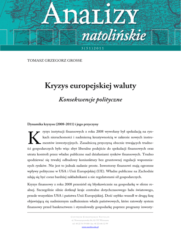 1 3(51)2011 TOMASZ GRZEGORZ GROSSE Kryzys europejskiej waluty Konsekwencje polityczne Dynamika kryzysu (2008-2011) i jego przyczyny K ryzys instytucji finansowych z roku 2008 wywołany był spekulacją na rynkach nieruchomości i nadmierną kreatywnością w zakresie nowych instrumentów inwestycyjnych. Zasadniczą przyczyną obecnie trwających trudno- ści gospodarczych było więc zbyt liberalne podejście do spekulacji finansowych oraz utrata kontroli przez władze publiczne nad działaniami rynków finansowych. Trudno spodziewać się trwałej odbudowy koniunktury bez gruntownej regulacji wspomnianych rynków. Nie jest to jednak zadanie proste. Inwestorzy finansowi mają ogromne wpływy polityczne w USA i Unii Europejskiej (UE). Władze publiczne na Zachodzie zdają się być coraz bardziej zakładnikami a nie regulatorami sił gospodarczych. Kryzys finansowy z roku 2008 przeniósł się błyskawicznie na gospodarkę w sferze realnej. Szczególnie silnie dotknął kraje centralne dotychczasowego ładu światowego, przede wszystkim USA i państwa Unii Europejskiej. Dość szybko wszedł w drugą fazę objawiającą się nadmiernym zadłużeniem władz państwowych, które ratowały system finansowy przed bankructwem i stymulowały gospodarkę poprzez programy inwestyCENTRUM EUROPEJSKIE NATOLIN ul. Nowoursynowska 84, 02-797 Warszawa tel: 48 22 54 59 800· fax: 48 22 646 12 99 www.natolin.edu.pl 2 cyjne. W tej fazie kryzysu ucierpiała również Unia Gospodarcza i Walutowa (UGW). Zadłużenie wielu państw strefy euro w połączeniu z obniżeniem tempa wzrostu gospodarczego przyniosło systemową zapaść Eurolandu. Bardzo szybko okazało się, że problemy wypłacalności finansowej nie dotyczą jedynie państw peryferyjnych określanych mianem PIGS (Portugalia, Irlandia, Grecja i Hiszpania). W roku 2011 sięgają już głównych filarów tego systemu, czyli Włoch, a nawet Francji. Kryzys wspólnej waluty był przewidywany przez wielu ekonomistów, którzy dowodzili, że system ma podstawowe wady i luki instytucjonalne. W sytuacji dekoniunktury muszą one zaowocować poważnymi trudnościami, a nawet grożą rozpadem Eurolandu. Jednak nie tylko wady instytucjonalne omawianego systemu są przyczyną narastających problemów euro. W drugiej połowie 2011 roku uwidoczniło się spowolnienie tempa wzrostu głównych gospodarek świata: USA, państw UE, a także w mniejszym stopniu Chin. Kolejnym czynnikiem nawrotu kryzysu wspólnej waluty jest także to, że władze publiczne w Europie nie radzą sobie z rozwiązywaniem problemów. Grają na zwłokę i mają trudności z wypracowaniem decyzji. Nie rozwiązują zasadniczych problemów systemowych. Niekiedy nawet potęgują trudności, na przykład podejmując działania w istocie ograniczające możliwości odrodzenia gospodarczego. Zamiast uspokajać inwestorów, wywołują niepokój sprzecznymi komunikatami. Przeważają doraźne interesy narodowe, a nie troska o ustabilizowanie całego systemu. Dlatego władze publiczne w Europie, zarówno na poziomie UE, jak i w wiodących państwach członkowskich, tracą wiarygodność w oczach uczestników rynków finansowych. Staje się coraz bardziej oczywiste, że nie są w stanie zapanować nad kryzysem euro. W tej sytuacji niektórzy inwestorzy podejmują działania wymierzone wprost w stabilność wspólnej waluty. Grają na załamanie kursu euro, kolejne bankructwa najbardziej zadłużonych członków tego systemu, a być może (w konsekwencji) nawet na rozpad eurostrefy. W obecnej fazie kryzysu nie mamy już więc do czynienia jedynie z kłopotami wynikającymi z wad systemowych i odwlekanych (lub nieadekwatnych) decyzji politycznych. Na przestrzeni 2011 roku można zaobserwować długofalowy atak spekulacyjny na podstawy systemu wspólnej waluty. Jest to sytuacja znacznie trudniejsza do opanowania. Skoro elity europejskie od ponad roku (czyli od wybuchu kryzysu greckiego w maju 2010 roku) nie potrafią uporządkować instytucji systemu euro, tym bardziej nie będą zapewne w stanie skutecznie przeciwdziałać spekulacjom finansowym. WymagałoCENTRUM EUROPEJSKIE NATOLIN ul. Nowoursynowska 84, 02-797 Warszawa tel: 48 22 54 59 800· fax: 48 22 646 12 99 www.natolin.edu.pl 3 by to podjęcia nowych regulacji i przejęcia kontroli nad rynkami finansowymi nie tylko w samej Europie, ale i w skali globalnej. Tymczasem nie widać końca kłopotów gospodarczych. Przeciwnie, zanosi się na kolejny - trzeci już - etap kryzysu (2011-2012). Dotknie on zarówno sfery realnej, jak i rynków finansowych. Będzie on zapewne łagodzony poprzez znacznie bardziej aktywne - niż do tej pory - działania banków centralnych, przede wszystkim monetyzację długu. Oznacza to skupowanie papierów dłużnych przez banki centralne poprzez zwiększenie emisji pieniądza. Przyniesie to zapewne kolejną falę inflacyjną, a także uruchomi nową (już bodaj czwartą) fazę kryzysu gospodarczego. Trzy główne czynniki decydujące o przyszłości strefy euro W tej sytuacji warto zastanowić się nad przyszłością wspólnej waluty. Jest to zadanie trudne, gdyż nauki społeczne - w tym politologia i ekonomia – nie wypracowały jak dotąd skutecznej metodologii prognostycznej. Niemniej dla ułatwienia tego zadania można wskazać trzy główne czynniki mające znaczenie dla stabilności systemu euro. Po pierwsze należy wymienić uwarunkowania geopolityczne. Warto przypomnieć, że wprowadzenie euro miało służyć wzmocnieniu integracji politycznej na Starym Kontynencie, jak również zwiększeniu autonomii zjednoczonej Europy w relacjach ze Stanami Zjednoczonymi Ameryki. Euro miało być rywalem dolara na rynkach globalnych, co poza korzyściami ekonomicznymi ma oczywiste implikacje geopolityczne. Po drugie, czynnikiem decydującym o przyszłości strefy euro są interesy gospodarcze. Bez wątpienia euro przyczyniło się do zintegrowania wspólnego rynku w Europie, zwłaszcza rynków finansowych. Przyniosło szer