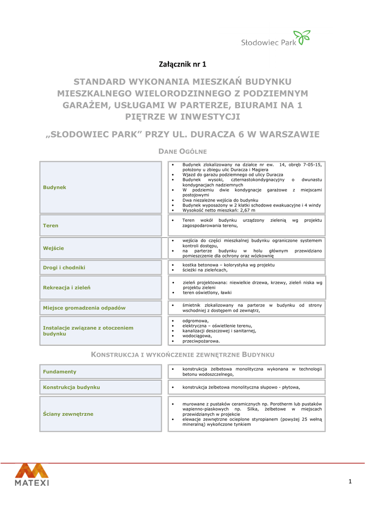 Załącznik nr 1 STANDARD WYKONANIA MIESZKAŃ BUDYNKU MIESZKALNEGO WIELORODZINNEGO Z PODZIEMNYM GARAŻEM, USŁUGAMI W PARTERZE, BIURAMI NA 1 PIĘTRZE W INWESTYCJI „SŁODOWIEC PARK” PRZY UL. DURACZA 6 W WARSZAWIE DANE OGÓLNE • • • Budynek • • • • • Teren wokół budynku zagospodarowania terenu, • wejścia do części mieszkalnej budynku ograniczone systemem kontroli dostępu, na parterze budynku w holu głównym przewidziano pomieszczenie dla ochrony oraz wózkownię Teren Wejście • Drogi i chodniki Budynek zlokalizowany na działce nr ew. 14, obręb 7-05-15, położony u zbiegu ulic Duracza i Magiera Wjazd do garażu podziemnego od ulicy Duracza Budynek wysoki, czternastokondygnacyjny o dwunastu kondygnacjach nadziemnych W podziemiu dwie kondygnacje garażowe z miejscami postojowymi Dwa niezależne wejścia do budynku Budynek wyposażony w 2 klatki schodowe ewakuacyjne i 4 windy Wysokość netto mieszkań: 2,67 m urządzony zielenią wg projektu • • kostka betonowa – kolorystyka wg projektu ścieżki na zieleńcach, • zieleń projektowana: niewielkie drzewa, krzewy, zieleń niska wg projektu zieleni teren oświetlony, ławki Rekreacja i zieleń • Miejsce gromadzenia odpadów • śmietnik zlokalizowany na parterze wschodniej z dostępem od zewnątrz, Instalacje związane z otoczeniem budynku • • • • • odgromowa, elektryczna – oświetlenie terenu, kanalizacji deszczowej i sanitarnej, wodociągowa, przeciwpożarowa. w budynku od strony KONSTRUKCJA I WYKOŃCZENIE ZEWNĘTRZNE BUDYNKU Fundamenty • konstrukcja żelbetowa monolityczna wykonana w technologii betonu wodoszczelnego, Konstrukcja budynku • konstrukcja żelbetowa monolityczna słupowo - płytowa, • murowane z pustaków ceramicznych np. Porotherm lub pustaków wapienno-piaskowych np. Silka, żelbetowe w miejscach przewidzianych w projekcie elewacje zewnętrzne ocieplone styropianem (powyżej 25 wełną mineralną) wykończone tynkiem Ściany zewnętrzne • 1 Elewacja • ściany zewnętrzne ocieplone i wykończone wyprawa tynkarską w technologii lekkiej-mokrej, kolorystyka wg projektu loggie i balkony – balustrady ze stali malowanej proszkowo, piętra 10 i 11 balustrady stalowe wypełnione szkłem bezpiecznym, Stropy • monolityczne żelbetowe płytowe, Dach • • • • izolacja termiczna styropianowa, pokrycie papą termozgrzewalną, odwodnienie wpustami dachowymi, obróbki blacharskie z blachy stalowej, urządzona powierzchnia biologicznie czynna wg projektu • GARAŻE WIELOSTANOWISKOWE Ściany zewnętrzne, wewnętrzne, konstrukcyjne i słupy • • ściany zewnętrzne żelbetowe, ściany wewnętrzne żelbetowe lub murowane z cegły, Sufit • • strop nad poz. -1 w obrysie budynku ocieplony wełną mineralną, strop nad poz.-1 poza obrysem budynku nieocieplony, Posadzki • betonowe zbrojone, wykończone - utwardzenie powierzchniowe z oznakowaniem miejsc parkingowych oraz organizacją ruchu, Drzwi • stalowe według wymagań przeciwpożarowych, z ograniczoną kontrolą dostępu • otwierana automatycznie wyjazdowa, • • • • • • • wentylacja mechaniczna wyciągowa oraz oddymiania, elektryczna - oświetleniowa z oprawami, kanalizacyjna z odwodnieniem powierzchni garażu i separatorem, instalacja sygnalizacji pożaru, instalacja detekcji tlenku węgla i LPG, węzeł cieplny zasilany z sieci ciepłowniczej, przyłącze wodociągowe z licznikiem, Brama garażowa Instalacje za pomocą pilota, wjazdowo- KORYTARZE, HOLL GŁÓWNY Wejście do budynku • drzwi wejściowe do budynku aluminiowe lub stalowe, profile ciepłe, wyposażone w system kontroli dostępu, • • • tynki gipsowe malowane, szachty instalacyjne zamknięte drzwiczkami, na części holu wejściowego sufit podwieszony, ściany we fragmentach obłożone płytami HPL – zgodnie z projektem wnętrz, • powierzchnia o strukturze antypoślizgowej – kolorystka wg projektu, przy wejściu do budynku, w holu głównym, wycieraczki, • Ściany i sufity Posadzki • Schody • powierzchnia o strukturze antypoślizgowej – kolorystyka wg projektu, Instalacje elektryczne • oprawy oświetleniowe wg projektu Wyposażenie • • • • skrzynki na listy, gablota administracyjna, instalacja domofonowa z osprzętem, oznaczenie numeru piętra i numeru lokali na każdej kondygnacji Windy • dwie windy osobowe np. KONE, OTIS. W każdej klatce jedna zapewnia komunikację do poziomu garaży, 2 KLATKI SCHODOWE EWAKUACYJNE Ściany i sufity • Żelbetowe impregnowane, Biegi i spoczniki • biegi i spoczniki żelbetowe impregnowane, Balustrady • stalowe, malowane proszkowo z pochwytem, Instalacje elektryczne i wentylacji • • oprawy oświetleniowe sterowane fotokomórką, wentylacja mechaniczna oraz oddymiania, MIESZKANIA I KOMÓRKI LOKATORSKIE Drzwi wejściowe • antywłamaniowe klasy B np. Dierre, Gerda , z jednym zamkiem i sztywnym łańcuchem, wyposażone w wizjer, • konstrukcyjne żelbetowe w miejscach przewidzianych w projekcie oraz murowane z pustaków ceramicznych lub cegły wapiennopiaskowej, tynk gipsowy, działowe murowane z bloczków gipsowych lub pustaków ceramicznych lub cegły wapienno-piaskowej, Ściany wewnętrzne • • Ściany międzylokalowe • żelbetowe lub murowane z pustaków lub cegły wapiennopiaskowej o odpowiedniej izolacyjności akustycznej. Sufity • tynk gipsowy, Posadzki • wylewki cementowe zbrojone włóknem rozproszonym, • PVC dwukolorowe - od strony mieszkania białe od zewnątrz kolor wg projektu, rozwieralne w każdym pomieszczeniu przynajmniej jedno skrzydło z dodatkową funkcją uchylności, nawietrzaki okienne w miejscach wyznaczonych w projekcie, szklone zestawem ze szkłem niskoemisyjnym k = 1,0, bezbarwnym, okucia obwiedniowe, Parapety wewnętrzne • Pod oknami wykonane z konglomeratu gr 2 cm, kolorystyka wg projektu Drzwi wewnętrzne • otwory, przygotowane do montażu ościeżnic, • instalacja elektryczna - trójfazowa do kuchni elektrycznej,