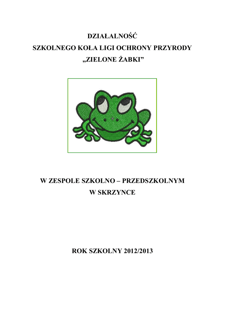 DZIAŁALNOŚĆ SZKOLNEGO KOŁA LIGI OCHRONY PRZYRODY „ZIELONE ŻABKI” W ZESPOLE SZKOLNO – PRZEDSZKOLNYM W SKRZYNCE ROK SZKOLNY 2012/2013 I. Wstęp i charakterystyka programu Ziemia to jedyna planeta, na której istnieje życie. Aby mogło istnieć nadal, trzeba ją chronić. Ludzie, zwierzęta, rośliny, powietrze i woda muszą istnieć w równowadze, którą tak łatwo jest zniszczyć. Zanieczyszczenia sprawiają, że zmieniają się warunki życia na niej: efekt cieplarniany, dziura ozonowa, kwaśne deszcze. Wymierają bezpowrotnie w zastraszającym tempie różne gatunki roślin i zwierząt. Musimy się zastanowić dokąd zmierzamy i podjąć stosowne kroki. Ochrona środowiska to już więc nie tylko potrzeba, ale konieczność. Dlatego szczególną rolę przypisuje się edukacji środowiskowej, jako podstawie budowy nowej świadomości ludzi. Globalna równowaga ekologiczna zależy od przyznania się człowieka do niszczenia przyrody i wzięcia na siebie odpowiedzialności za swe czyny. Zmiana sposobu odnoszenia się do naszej planety jest jedyną drogą do budowy nowego związku między cywilizacją a przyrodą. Jak stwierdzają coroczne raporty o stanie środowiska, wszystkie podstawowe wskaźniki stanu środowiska nie wskazują na jego poprawę. Zasięg i różnorodność problemów ekologicznych powiększa się z roku na rok. Cechą charakterystyczną Polski są ogromne kontrasty środowiskowe. Istnieją piękne, dobrze zachowane, często unikatowe obszary przyrodnicze. Są również tereny najbardziej zdegradowane w Europie. Na znacznej powierzchni zagrożone jest istnienie lasów W ochronie przyrody wiele zależy od świadomości jej znaczenia w społeczeństwie, toteż kształtowanie powszechnej świadomości ekologicznej, właściwych postaw prośrodowiskowych , trzeba traktować jako ważny czynnik wspomagania systemu ochrony przyrody. W tym zakresie główna rola przypada szkołom i nauczycielom, jak też organizacjom społecznym. W Polsce problemy ochrony i kształtowania środowiska wspiera i pomaga rozwiązywać społeczna organizacja Liga Ochrony Przyrody (LOP) założona już w 1928 roku. LOP wraz z dużą liczbą innych organizacji kształtuje opinię publiczną w kierunku pozytywnym dla ochrony przyrody oraz wspiera służby ochrony przyrody w ich codziennych działaniach. Upowszechnienie wiedzy o przyrodzie i ochronie jest głównym polem działania LOP od początku jej istnienia. Szkolne koła LOP :Zielone Żabki”, od wielu lat prowadzi swą działalność w nasze szkole. Umożliwiają szeroką realizację celów organizacji pełniąc jednocześnie istotne funkcje edukacyjne i wychowawcze. II. Cel ogólny: Kształtowanie postawy szacunku wobec przyrody, wrażliwości na jej problemy oraz odpowiedzialności za jej stan, ze szczególnym uwzględnieniem najbliższej okolicy. W poznawaniu zagadnień ochrony środowiska wskazana jest samodzielna praca ucznia przez realizację ćwiczeń, w których podejmuje on różne działania, np.: przeprowadza obserwacje, eksperymenty, pomiary, projektuje prace społecznie-użyteczne w najbliższym otoczeniu Zajęcia koła LOP związane są z bezpośrednim kontaktem z przyrodą. Wpływa to na atrakcyjność zajęć i powoduje, że edukacja ekologiczna cieszy się wśród uczniów dużym zainteresowaniem. III. Główne założenia programu: kształtowanie właściwego stosunku dzieci i młodzieży do przyrody; pogłębianie wiedzy o środowisku przyrodniczym, potrzebie i sposobach jego ochrony; zachęcanie do organizowania i wykonywania społecznie prac na rzecz środowiska przyrodniczego; czuwanie nad przestrzeganiem prawa ochrony przyrody. IV. Szczegółowe cele edukacyjne. Uczeń zdobywa podstawowe wiadomości dotyczące: pojęć ekologicznych i z zakresu ochrony przyrody; zagrożeń środowiska ze szczególnym uwzględnieniem najbliższej okolicy; form ochrony przyrody; współzależności między organizmami a środowiskiem; ekologicznego stylu życia; przepisów prawnych dotyczących ochrony przyrody; działalności LOP wśród dzieci i osób dorosłych. Uczeń zdobywa podstawowe umiejętności w zakresie: definiowania podstawowych pojęć ekologicznych i z zakresu ochrony przyrody; obserwacji środowiska, przeprowadzania prostych badań dotyczących stanu środowiska, wyciągania wniosków; dokumentowania wyników prac i spostrzeżeń; dostrzegania przyczyn i skutków zagrożeń środowiska; racjonalnego gospodarowania zasobami przyrody; postrzegania związku między stanem środowiska a zdrowiem człowieka; planowania działań na rzecz ochrony przyrody; zdobywania wiedzy przyrodniczej. Uczeń kształci postawy dotyczące: przyjaznego stosunku do przyrody; aktywności w praktycznych działaniach na rzecz środowiska; przestrzegania i propagowania zdrowego stylu życia; rozpowszechniania idei ochrony przyrody wśród dzieci i osób dorosłych. V. Metody i formy pracy praca indywidualna i zespołowa obserwacje wycieczki zajęcia terenowa praca z komputerem, Internet burza mózgów drama inscenizacja pogadanka VI. Treści programu: podstawowe pojęcia ekologiczne: ekologia, sozologia, ekosystem, biocenoza, biotop, populacja zagrożenia środowiskowe: skażenia i sposoby ochrony powietrza, wody, gleby, efekt cieplarniany, dziura ozonowa właściwy stosunek do wszelkich form życia: pomoc zwierzętom w czasie zimy, pielęgnowanie roślin w szkole i wokół szkoły formy ochrony przyrody: ochrona gatunkowa, pomniki przyrody, rezerwaty, parki narodowe ekologiczny styl życia: zdrowa żywność, życie bez papierosów, oszczędzanie wody i energii, zagospodarowywanie odpadów działalność LOP: historia działalności, struktura organizacji, cele i zadania LOP, przepisy prawne dotyczące ochrony przyrody zależność człowieka od przyrody: rośliny w życiu człowieka, znaczenie i ochrona lasów VII. Planowane osiągnięcia uczniów: Uczeń potrafi: definiować podstawowe pojęcia ekologiczne i z zakresu ochrony przyrody; 