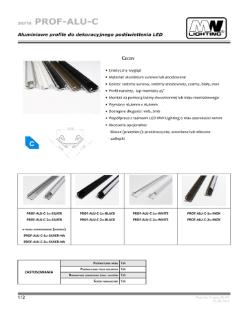seria PROF-ALU-C Aluminiowe profile do dekoracyjnego podświetlenia LED CECHY • Estetyczny wygląd • Materiał: aluminium surowe lub anodowane • Kolory: srebrny surowy, srebrny anodowany, czarny, biały, inox • Profil narożny, kąt montażu 45° • Montaż za pomocą taśmy dwustronnej lub kleju montażowego • Wymiary: 16,6mm x 16,6mm • Dostępne długości: 1mb, 2mb • Współpraca z taśmami LED MW-Lighting o max szerokości 10mm • Akcesoria opcjonalne: - klosze (przesłony): przeźroczyste, szronione lub mleczne - zaślepki PROF-ALU-C-1M-SILVER PROF-ALU-C-1M-BLACK PROF-ALU-C-1M-WHITE PROF-ALU-C-1M-INOX PROF-ALU-C-2M-SILVER PROF-ALU-C-2M-BLACK PROF-ALU-C-2M-WHITE PROF-ALU-C-2M-INOX W WERSJI NIEANODOWANEJ (SUROWEJ): PROF-ALU-C-1M-SILVER-NA PROF-ALU-C-2M-SILVER-NA PODŚWIETLENIE MEBLI Tak ZASTOSOWANIA PODŚWIETLENIE PÓŁEK SZKLANYCH Tak DEKORACYJNE OSWIETLENIE ŚCIAN I SUFITÓW Tak ŚCIEŻKI EWAKUACYJNE Tak 1/2 Prof-Alu-C-spec_PL-R1 25.06.2014 seria PROF-ALU-C Aluminiowe profile do dekoracyjnego podświetlenia LED AKCESORIA MODEL PRZESŁONY - SZYBKI KLOSZ-MILK-1M KLOSZ-MILK-2M KLOSZ-TRANSPARENT-1M KLOSZ-TRANSPARENT-2M KLOSZ-GLASS-1M KLOSZ-GLASS-2M MODEL ZAŚLEPKI PROF-ALU-C-Z-SILVER PROF-ALU-C-Z-BLACK PROF-ALU-C-Z-WHITE PROF-ALU-C-Z-INOX 2/2 PARAMETR OPIS TYP MONTAŻU PROFILE ALUMINIOWE MATERIAŁ TWORZYWO SZTUCZNE MLECZNE TYP MONTAŻU PROFILE ALUMINIOWE MATERIAŁ TWORZYWO SZTUCZNE TRANSPARENTNE (SZRONIONE) TYP MONTAŻU PROFILE ALUMINIOWE MATERIAŁ TWORZYWO SZTUCZNE PRZEŹROCZYSTE PARAMETR OPIS TYP KOMPLET ZAŚLEPEK (2 SZT.) DO PROFILU PROF-ALU-C MATERIAŁ TWORZYWO SZTUCZNE Prof-Alu-C-spec_PL-R1 25.06.2014