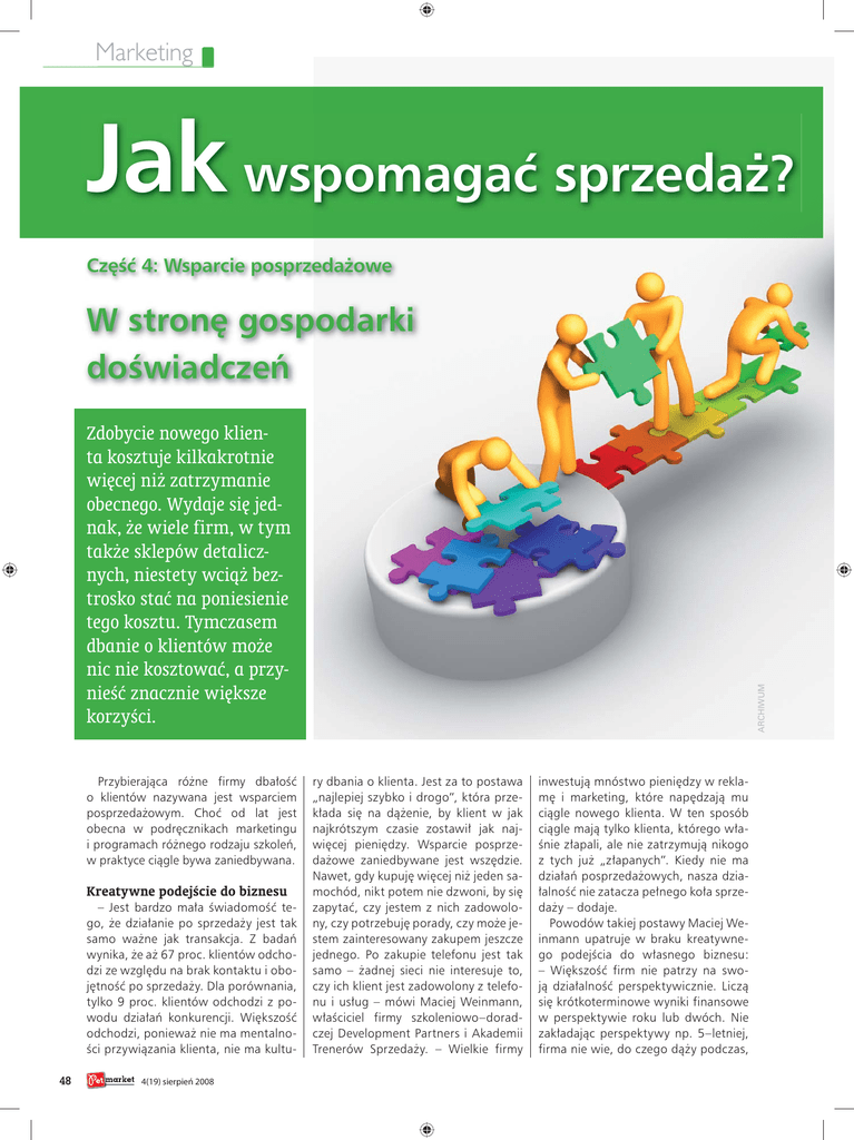Marketingg Jak wspomagać sprzedaż? Część 4: Wsparcie posprzedażowe W stronę gospodarki doświadczeń Przybierająca różne firmy dbałość o klientów nazywana jest wsparciem posprzedażowym. Choć od lat jest obecna w podręcznikach marketingu i programach różnego rodzaju szkoleń, w praktyce ciągle bywa zaniedbywana. Kreatywne podejście do biznesu – Jest bardzo mała świadomość tego, że działanie po sprzedaży jest tak samo ważne jak transakcja. Z badań wynika, że aż 67 proc. klientów odchodzi ze względu na brak kontaktu i obojętność po sprzedaży. Dla porównania, tylko 9 proc. klientów odchodzi z powodu działań konkurencji. Większość odchodzi, ponieważ nie ma mentalności przywiązania klienta, nie ma kultu48 4(19) sierpień 2008 ARCHIWUM Zdobycie nowego klienta kosztuje kilkakrotnie więcej niż zatrzymanie obecnego. Wydaje się jednak, że wiele firm, w tym także sklepów detalicznych, niestety wciąż beztrosko stać na poniesienie tego kosztu. Tymczasem dbanie o klientów może nic nie kosztować, a przynieść znacznie większe korzyści. ry dbania o klienta. Jest za to postawa „najlepiej szybko i drogo”, która przekłada się na dążenie, by klient w jak najkrótszym czasie zostawił jak najwięcej pieniędzy. Wsparcie posprzedażowe zaniedbywane jest wszędzie. Nawet, gdy kupuję więcej niż jeden samochód, nikt potem nie dzwoni, by się zapytać, czy jestem z nich zadowolony, czy potrzebuję porady, czy może jestem zainteresowany zakupem jeszcze jednego. Po zakupie telefonu jest tak samo – żadnej sieci nie interesuje to, czy ich klient jest zadowolony z telefonu i usług – mówi Maciej Weinmann, właściciel firmy szkoleniowo–doradczej Development Partners i Akademii Trenerów Sprzedaży. – Wielkie firmy inwestują mnóstwo pieniędzy w reklamę i marketing, które napędzają mu ciągle nowego klienta. W ten sposób ciągle mają tylko klienta, którego właśnie złapali, ale nie zatrzymują nikogo z tych już „złapanych”. Kiedy nie ma działań posprzedażowych, nasza działalność nie zatacza pełnego koła sprzedaży – dodaje. Powodów takiej postawy Maciej Weinmann upatruje w braku kreatywnego podejścia do własnego biznesu: – Większość firm nie patrzy na swoją działalność perspektywicznie. Liczą się krótkoterminowe wyniki finansowe w perspektywie roku lub dwóch. Nie zakładając perspektywy np. 5–letniej, firma nie wie, do czego dąży podczas, gdy dbałość o klientów może się okazać trafioną inwestycją na lata. – Odnawianie kontaktu jest prostsze i tańsze niż jego nawiązywanie – przekonuje Maciej Weinmann. Do głosu dochodzą uczucia Dlaczego opieka nad klientem w formie m.in. wsparcia posprzedażowego jest tak ważna? – Wchodzimy w gospodarkę doświadczeń, gospodarkę doznań, do głosu dochodzi element, którego dotąd w biznesie unikaliśmy – uczucia i emocje. Zapamiętujemy doświadczenia najintensywniejsze i najmocniejsze w pozytywnym sensie, jak i najbardziej negatywne. Decyzje opieramy na emocjach, na prostym „spodobało się lub nie” – mówi Dorota Duda z firmy Academy of Service Excellence, której nazwa w języku polskim brzmiałaby „Akademia Doskonałości Obsługi Klienta”. Academy of Service Excellence, której Dorota Duda jest współwłaścicielką, koncentruje się właśnie na doskonaleniu jakości obsługi klienta i proponuje szkolenia dla pracowników wszystkich szczebli – od menedżerów strategicznych po tzw. „pierwszą linię” kontaktu z klientem. Wszystkie propozycje szkoleniowe tworzą pakiet „Zarządzanie Doświadczeniami Klientów”. Jednym z jego elementów są warsztaty pod nazwą „Klient na całe życie. Strategiczna rola obsługi klienta”. Jak sprawić, by osoba odwiedzająca sklep została klientem na całe życie lub przynajmniej raz wróciła? – W małych firmach istotne jest kreowanie strategii dyferencjacji poprzez obsługę, czyli odróżniania się od innych – mówi Dorota Duda. – Chodzi o to, żeby oferować to, co odmienne i zapamiętywane. Jeżeli klientowi zaoferujemy to samo, co np. nasza konkurencja, dokona on wyboru, kierując się ceną, ponieważ nie otrzyma od nas żadnej innej wskazówki – dodaje. Odróżnienie się jest, jej zdaniem, łatwiejsze w przypadku małych firm. – W dużych sklepach klient jest anonimowy, a w małym możemy go dobrze poznać – mówi Dorota Duda. Wsparcie posprzedażowe może się zacząć już w momencie transakcji. – Kiedy klient wybiera najtańszą karmę, możemy powiedzieć, że to produkt z najlepszą relacją ceny do wartości i dodać odpowiednio dobrane próbki droższych produktów, mówiąc, żeby sprawdził, czy posmakują psu czy kotu. Jeżeli zakupy są ciężkie, możemy zaproponować pomoc w zaniesieniu ich do samochodu. W ten sposób klient nas zapamięta, a gdy jego zwierzęciu posmakuje karma z próbek, pomyśli o tym, jak świetnie go obsłużono. Być może wróci, by kupić ten droższy produkt – mówi Dorota Duda. Społeczność wokół biznesu Gdy klient wróci, możemy spróbować choć trochę przywiązać go do swojej firmy. – Prosimy klienta o wypełnienie ankiety z kilkoma pytaniami o zadowolenie z jakości obsługi i prośbą o jego e–mail lub numer telefonu. W ten prosty sposób zyskujemy bazę, z której korzystamy, by wysyłać informacje o nowej karmie, nowych rybkach, obniżkach czy indywidualnym rabacie, który klient otrzyma przy kolejnej wizycie w naszym sklepie. To działania, które może podejmować każdy – mówi Maciej Weinmann. Kiedy klient powraca, pozostaje tylko troskliwie się nim opiekować. – Metody najprostsze i najtańsze w małych firmach zadziałają najlepiej. Gwarancja, informacja i kontakt pozwolą zatrzymać przy sobie klienta – przekonuje Maciej Weinmann. – Mój znajomy, który prowadzi 10–metrowy salonik Ery po miesiącu dzwoni do każdego klienta i pyta, czy jest zado- wolony z telefon