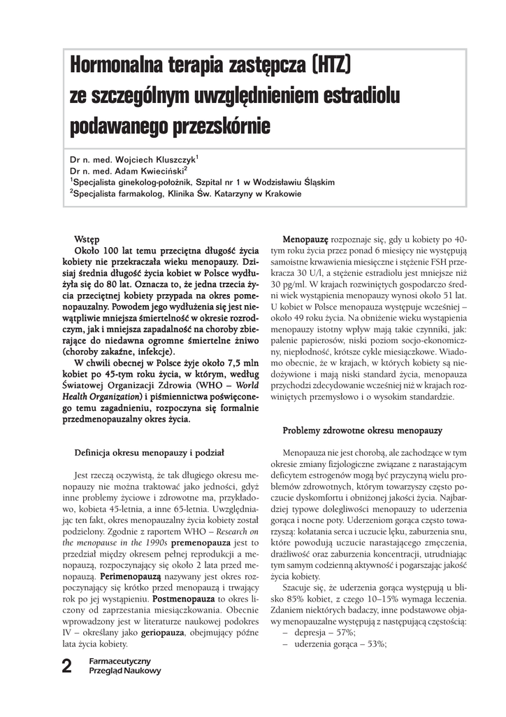 Hormonalna terapia zastêpcza (HTZ) ze szczególnym uwzglêdnieniem estradiolu podawanego przezskórnie Nr 6/2007 Dr n. med. Wojciech Kluszczyk1 Dr n. med. Adam Kwieciñski2 1 Specjalista ginekolog-po³o¿nik, Szpital nr 1 w Wodzis³awiu l¹skim 2 Specjalista farmakolog, Klinika w. Katarzyny w Krakowie Wstęp Około 100 lat temu przeciętna długość życia k obiety nie przekraczała wiek u menopauzy wieku menopauzy.. Dzisiaj średnia długość życia kobiet w Polsce wydłużyła się do 80 lat. Oznacza to, że jedna trzecia życia przeciętnej kobiety przypada na okres pomeowodem jego wydłużenia się jest nienopauzalny nopauzalny.. P Powodem wątpliwie mniejsza śmiertelność w okresie rozrodczym, jak i mniejsza zapadalność na choroby zbierające do niedawna ogromne śmiertelne żniwo (choroby zak aźne, infek cje). zakaźne, infekcje). ce żyje około 7,5 mln W chwili obecnej w Pols Polsce k obiet po 45-tym rok u życia, w któr ym, według roku którym, Światowej Organizacji Zdrowia (WHO – W orld World Health Organization Organization)) i piśmiennictwa poświęconego temu zagadnieniu, rozpoczyna się formalnie przedmenopauzalny okres życia. Menopauzę rozpoznaje się, gdy u kobiety po 40tym roku życia przez ponad 6 miesięcy nie występują samoistne krwawienia miesięczne i stężenie FSH przekracza 30 U/l, a stężenie estradiolu jest mniejsze niż 30 pg/ml. W krajach rozwiniętych gospodarczo średni wiek wystąpienia menopauzy wynosi około 51 lat. U kobiet w Polsce menopauza występuje wcześniej – około 49 roku życia. Na obniżenie wieku wystąpienia menopauzy istotny wpływ mają takie czynniki, jak: palenie papierosów, niski poziom socjo-ekonomiczny, niepłodność, krótsze cykle miesiączkowe. Wiadomo obecnie, że w krajach, w których kobiety są niedożywione i mają niski standard życia, menopauza przychodzi zdecydowanie wcześniej niż w krajach rozwiniętych przemysłowo i o wysokim standardzie. Problemy zdrowotne okresu menopauzy Definicja okresu menopauzy i podział Jest rzeczą oczywistą, że tak długiego okresu menopauzy nie można traktować jako jedności, gdyż inne problemy życiowe i zdrowotne ma, przykładowo, kobieta 45-letnia, a inne 65-letnia. Uwzględniając ten fakt, okres menopauzalny życia kobiety został podzielony. Zgodnie z raportem WHO – Research on the menopause in the 1990s premenopauza jest to przedział między okresem pełnej reprodukcji a menopauzą, rozpoczynający się około 2 lata przed menopauzą. Perimenopauzą nazywany jest okres rozpoczynający się krótko przed menopauzą i trwający rok po jej wystąpieniu. Postmenopauza to okres liczony od zaprzestania miesiączkowania. Obecnie wprowadzony jest w literaturze naukowej podokres IV – określany jako geriopauza geriopauza, obejmujący późne lata życia kobiety. Farmaceutyczny Przegl¹d Naukowy Menopauza nie jest chorobą, ale zachodzące w tym okresie zmiany fizjologiczne związane z narastającym deficytem estrogenów mogą być przyczyną wielu problemów zdrowotnych, którym towarzyszy często poczucie dyskomfortu i obniżonej jakości życia. Najbardziej typowe dolegliwości menopauzy to uderzenia gorąca i nocne poty. Uderzeniom gorąca często towarzyszą: kołatania serca i uczucie lęku, zaburzenia snu, które powodują uczucie narastającego zmęczenia, drażliwość oraz zaburzenia koncentracji, utrudniając tym samym codzienną aktywność i pogarszając jakość życia kobiety. Szacuje się, że uderzenia gorąca występują u blisko 85% kobiet, z czego 10–15% wymaga leczenia. Zdaniem niektórych badaczy, inne podstawowe objawy menopauzalne występują z następującą częstością: – depresja – 57%; – uderzenia gorąca – 53%; Hormonalna terapia zastêpcza (HTZ) ze szczególnym uwzglêdnieniem estradiolu podawanego przezskórnie Nr 6/2007 – zaburzenia snu – 52%; – brak libido – 37% – suchość pochwy – 21%. Częstość występowania typowych objawów wegetatywnych waha się od kilku w tygodniu do kilku w ciągu godziny. Psychopatologia tego zjawiska nie jest całkowicie wyjaśniona i związana jest prawdopodobnie z kontrolą funkcji nerwów sympatycznych i skórnym przepływem krwi. Zaburzenia okresu menopauzy dotyczą praktycznie wszystkich aspektów biologicznego życia kobiety. Najczęściej obserwowanymi zmianami są objawy naczynioruchowe, zaburzenia emocjonalne, zmiany w kośćcu oraz zaburzenia metabolizmu lipidów i węglowodanów. Pomenopauzalne zmiany zwiększają ryzyko wystąpienia choroby niedokrwiennej serca i mózgu, osteoporozy i złamań patologicznych, obniżenia sprawności fizycznej, paradontozy, zaćmy, zmian zanikowych w układzie moczowo-płciowym, boli stawowo-mięśniowych itd. Wszystkie te czynniki powodują rozpoczęcie procesu apoptozy oraz starzenia się fizycznego i psychicznego. Należy przyjąć, że najważniejszym czynnikiem życia w okresie menopauzalnym jest jego jakość. Na obniżenie jakości życia wpływają przede wszystkim choroby wieku menopauzalnego. Według danych publikowanych przez Polskie Towarzystwo Kardiologiczne, kobiety polskie w wieku menopauzalnym umierają najczęściej na choroby serca i wielkich naczyń – 59% ogółu zgonów. Na wszystkie choroby onkologiczne umiera natomiast 20,5% kobiet. Tak więc te 2 grupy chorób mają zasadniczy wpływ na długość życia kobiet polskich. Rola hormonalnej terapii zastępczej (HTZ) Nie ulega wątpliwości, że niedobór estrogenów u kobiet po wygaśnięciu czynności jajników w okresie pomenopauzalnym może powodować zarówno nieprzyjemne dolegliwości, jak i poważne problemy zdrowotne. Ze względu na wydłużający się przeciętny okres życia kobiet poświęca się tym zagadnieniom wiele uwagi. Ze względu na wspomnianą już długość życia kobiety po menopauzie. Oczywiste wydaje, że powinno dążyć się do tego, aby lata te były spędzone w dobrym zdrowiu fizycznym i umysłowym. Należy zatem dbać o jakość ż