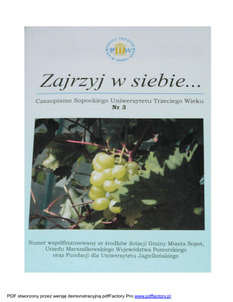PDF stworzony przez wersję demonstracyjną pdfFactory Pro www.pdffactory.pl Szanowni Słuchacze Sopockiego Uniwersytetu Trzeciego Wieku, Z początkiem nowego roku akademickiego składam Państwu serdeczne życzenia pełnej satysfakcji z odkrywania nowych horyzontów wiedzy oraz z uczestnictwa w różnych formach życia uniwersyteckiego. Szczególne gratulacje kieruję do wszystkich Słuchaczy rozpoczynających zajęcia na pierwszym roku. Stajecie się Państwo częścią wspólnoty Sopockiego Uniwersytetu Trzeciego Wieku - jedynej i niepowtarzalnej społeczności. Cieszę się, że intensywna i prowadzona z rozmachem działalność naszego Uniwersytetu spowodowała ożywienie działalności gdańskiego, a także powołanie podobnego w Gdyni i Rumi. Przed nami wszystkimi stają ważne wyzwania wynikające z misji Uniwersytetu. Jestem przekonany, że wzbogacicie Państwo rozwój naszej uczelni swoim partnerstwem, inwencją i twórczymi pomysłami. Jacek Karnowski Prezydent Miasta Sopotu Sopot, październik 2005 PDF stworzony przez wersję demonstracyjną pdfFactory Pro www.pdffactory.pl Szlachetne zdrowie... Grypa jest to ostra, wirusowa choroba zakaźna dotycząca całego organizmu, chociaż główne dolegliwości i objawy dotyczą dróg oddechowych. Objawia się bardzo wysoką gorączką, ogólnym rozbiciem, suchym kaszlem. W okresie tym organizm jest bardzo podatny na nadkażenia i często objawy grypy są wikłane innymi chorobami, takimi jak na przykład zapalenie mięśnia sercowego, co niestety może prowadzić do kardiomiopatii i w efekcie niewydolności krążenia, a nawet do śmierci. Grypa przenosi się drogą kropelkową, więc bardzo prosto można ulec zakażeniu. Wywołana jest przez dwa główne typy wirusów: typu A (odpowiedzialnego także za tzw. ptasią grypę) i typu B oraz przez wiele podtypów. Wszystkie typy wirusów w yk a z u ją z na c z ną z mie n no ś ć spowodowaną licznymi mutacjami zawartych w nich genów, co pozwala im unikać tych odczynów odpornościowych organizmu, które wywołała poprzednia infekcja. Zatem na grypę można chorować wiele razy w życiu, ale częstotliwość zachorowań, a także przebieg choroby zależy od kondycji nas samych, a przede wszystkim naszego systemu odpornościowego - im wyższa nasza odporność, tym mniejsze ryzyko zachorowania. Wzrost zachorowań na grypę w naszym klimacie ma miejsce szczególnie w sezonie jesiennozimowym oraz wczesnowiosennym. Epidemie występują cyklicznie, co 2-3 lata. Czasem ich zasięg jest tak ogromny, że zyskują miano pandemii. Pandemia w latach 1918-1919 zabiła około 25 milionów ludzi (była to tzw. „ h i s z p a n k a ” ) , a w 1968 roku grypa Hong-Kong spowodowała śmierć 700 tysięcy pacjentów. Czy można przetrwać ten okres i nie złapać wirusów grypy? Z całą pewnością można. Cała sztuka polega na tym, by nie dać im dostępu do s i e b i e . A jeśli już nas podstępne wirusy dopadną, musimy zapobiegać rozwojowi choroby. Pierwszą metodą, można powiedzieć najbardziej lekarską, jest szczepienie przeciw grypie. Osobiście rekomenduję, by szczepili się wszyscy, u których nie istnieją przeciwwskazania, to znaczy nie są uczulone na białko jaja kurzego (jest ono jednym ze składników szczepionki) oraz w danym okresie nie mają gorączki. A już na pewno powinni się szczepić c i, kt ó r z y z r a c j i s w o ic h codziennych obowiązków mają kontakt z dużą ilością ludzi: sprzedawcy, nauczyciele, lekarze, a także ludzie starsi oraz dzieci (w obu przypadkach układ odpornościowy nie jest w pełni sprawny - u dzieci nie całkiem rozwinięty, a u starszych już nie w pełni funkcjonujący). W związku ze wspomnianą stałą modyfikacją wirusów szczepienia trzeba powtarzać każdego r o k u . Po zaszczepieniu pełną ochronę uzyskujemy po 4 - 6 tygodniach i trwa ona do 6 miesięcy. Po zaszczepieniu mogą wystąpić słabe objawy przypominające grypę, ale są one krótkotrwałe i mijają nie pozostawiając śladów. Czasami w miejscu podania szczepionki pojawia się delikatny obrzęk i rumień - również te objawy szybko ustępują. Jeżeli jednak z jakiś powodów nie poddaliśmy się szczepieniu, unikajmy sytuacji, w których może dojść do zachorowania - w dużych skupiskach ludzkich, wśród ludzi kaszlących i kichających. Podejmijmy działania zmierzające do podniesienia naszej odporności, takie jak powszechnie znane profilaktyczne zażywanie witaminy C, a jeszcze lepiej preparatów złożonych z witaminy C, selenu i cynku (zawiera je popularny rutinoskorbin). Substancje te sprzyjają tzw. odpowiedzi immunologicznej, tzn. w momencie infekcji wspierają produkcję przeciwciał - naszej naturalnej armii walczącej zaciekle z wrogiem, czyli w tym przypadku wirusami grypy. Wielu ludzi ma też pozytywne doświadczenia Str. 3 PDF stworzony przez wersję demonstracyjną pdfFactory Pro www.pdffactory.pl ZA J R ZYJ W S I E B I E . .. Szlachetne zdrowie... - ciąg dalszy związane z homeopatią lub ziołolecznictwem, ja osobiście rekomenduję wyciąg z jeżówki purpurowej - echinacea, czy to w postaci kropli, tabletek, czy też taniego dostępnego w sklepach zielarskich ziółka do samodzielnego zaparzania herbatki w dług ie, jesienne w i e c z o r y . Systematyczne popijanie herbatki z jeżówki zapobiega nie tylko grypie, ale także innym chorobom infekcyjnym dróg oddechowych tej pory roku. Istotny jest również sposób, w jaki się ubieramy. N ie na leż y u b ier ać s ię w tym okresie ani zbyt lekko, gdyż wyziębienie organizmu sprzyja zakażeniom, ani zbyt grubo, ponieważ również przegrzanie działa niekorzystnie. Najlepiej ubierać się na tzw. „cebulkę”. W razie potrzeby, na przykład idąc z przyjaciółmi do kina, kawiarni czy na zakupy do s u p e r m a r k e t u , m o ż e m y z łatwością zdjąć z siebie jedną warstwę i w ten sposób uniknąć przegrzania. Nie zapominajmy o szalikach i okryciach głowy - aż 30 % 
