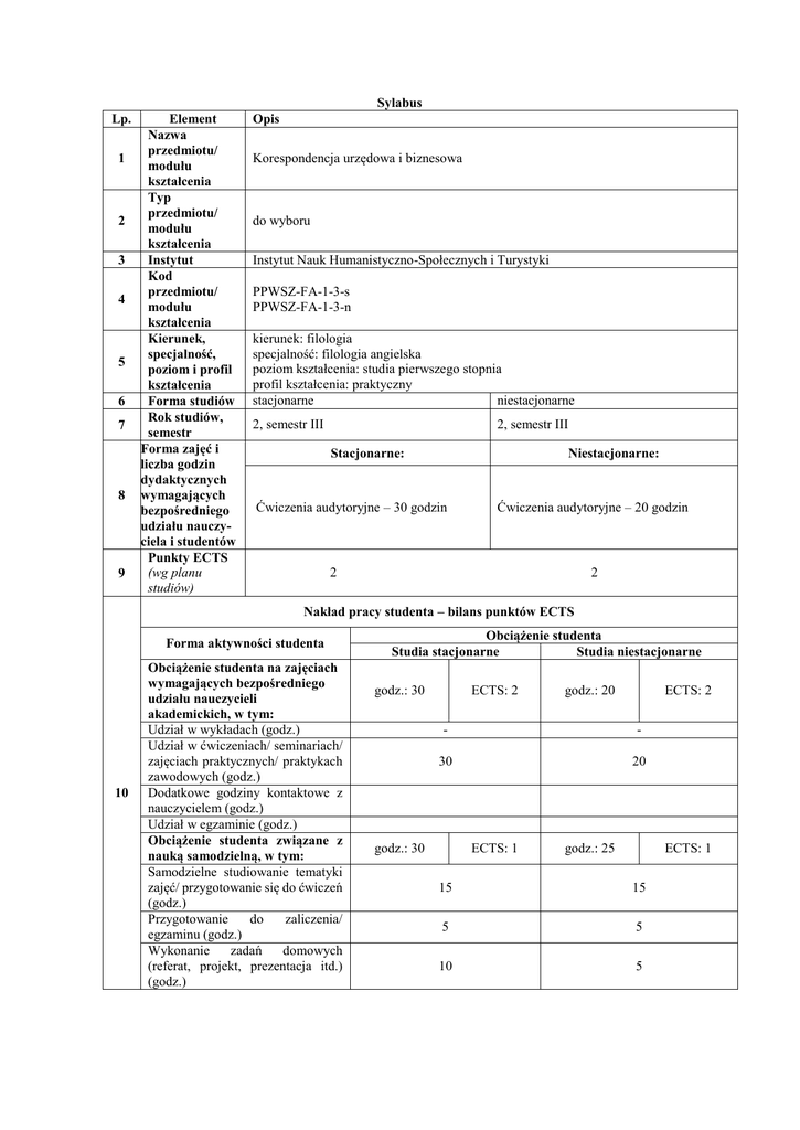 Sylabus Lp. 1 2 3 4 5 6 7 8 9 Element Nazwa przedmiotu/ modułu kształcenia Typ przedmiotu/ modułu kształcenia Instytut Kod przedmiotu/ modułu kształcenia Kierunek, specjalność, poziom i profil kształcenia Forma studiów Rok studiów, semestr Forma zajęć i liczba godzin dydaktycznych wymagających bezpośredniego udziału nauczyciela i studentów Punkty ECTS (wg planu studiów) Opis Korespondencja urzędowa i biznesowa do wyboru Instytut Nauk Humanistyczno-Społecznych i Turystyki PPWSZ-FA-1-3-s PPWSZ-FA-1-3-n kierunek: filologia specjalność: filologia angielska poziom kształcenia: studia pierwszego stopnia profil kształcenia: praktyczny stacjonarne niestacjonarne 2, semestr III 2, semestr III Stacjonarne: Niestacjonarne: Ćwiczenia audytoryjne – 30 godzin Ćwiczenia audytoryjne – 20 godzin 2 2 Nakład pracy studenta – bilans punktów ECTS Forma aktywności studenta 10 Obciążenie studenta na zajęciach wymagających bezpośredniego udziału nauczycieli akademickich, w tym: Udział w wykładach (godz.) Udział w ćwiczeniach/ seminariach/ zajęciach praktycznych/ praktykach zawodowych (godz.) Dodatkowe godziny kontaktowe z nauczycielem (godz.) Udział w egzaminie (godz.) Obciążenie studenta związane z nauką samodzielną, w tym: Samodzielne studiowanie tematyki zajęć/ przygotowanie się do ćwiczeń (godz.) Przygotowanie do zaliczenia/ egzaminu (godz.) Wykonanie zadań domowych (referat, projekt, prezentacja itd.) (godz.) Obciążenie studenta Studia stacjonarne Studia niestacjonarne godz.: 30 ECTS: 2 godz.: 20 ECTS: 2 - - 30 20 godz.: 30 ECTS: 1 godz.: 25 ECTS: 1 15 15 5 5 10 5 11 12 13 14 Obciążenie studenta w ramach zajęć związanych z praktycznym godz.: ECTS: godz.: ECTS: przygotowaniem zawodowym Suma (obciążenie studenta na zajęciach wymagających bezpośredniego godz.: 60 ECTS: 2 godz.: 45 ECTS: 2 udziału nauczycieli akademickich oraz związane z nauką samodzielną) Nauczyciel akademicki odpowiedzialny za przedmiot/ moduł (egzaminujący) Nauczyciele akademiccy prowadzący przedmiot/ moduł Wymagania Znajomość języka angielskiego na poziomie B1+/B2 (kompetencje) wstępne 1. Nauczenie terminologii typowej dla przedmiotu 2. Wypracowanie umiejętności prowadzenia takiej korespondencji Założenia i cele 3. Zaznajomienie z techniką pisania na poziomie akademickim 4. Tworzenie tekstów dotyczących szeroko pojętej sfery biznesu, w szczególności przedmiotu ekonomii, marketingu, finansów, reklamy, bankowości, współczesnych technologii, itd. Opis efektów kształcenia w zakresie: W1 W2 W3 15 Efekty kształcenia U1 U2 K1 K2 Odniesienie do kierunkowyc h efektów kształcenia WIEDZY Student posiada uporządkowaną wiedzę o K_W01 korespondencji biznesowej i urzędniczej Student ma uporządkowaną wiedzę podstawową na temat fonologicznej, K_W03 morfologicznej i gramatycznej struktury języka angielskiego Student zna i rozumie podstawowe pojęcia i zasady z zakresu ochrony własności K_W11 intelektualnej, technologii informacyjnej i prawa autorskiego UMIEJĘTNOŚCI Student potrafi wyszukać, analizować, oceniać, selekcjonować i użytkować K_U01 informacje, wykorzystując różne źródła i sposoby Student umie samodzielnie zdobywać wiedzę, doskonalić umiejętności profesjonalne K_U02 związane z wybranym obszarem działalności zawodowej KOMPETENCJI SPOŁECZNYCH Student rozumie konieczność rozwoju K_K01 zawodowego i osobistego przez całe życie Student potrafi odpowiednio określić priorytety służące realizacji określonego przez K_K03 siebie lub przez innych zadania Odniesienie do efektów kształcenia dla obszaru H1P_W01 H1P_W02 H1P_W10 H1P_U01 H1P_U02 H1P_K01 H1P_K03 Język angielski w korespondencji biznesowo-urzędowej: listy, pisma, umowy, CV, resume, Inventory Skills i inne dokumenty związane z pracą i zatrudnieniem w środowisku angielskojęzycznym. - Korespondencja handlowa z terminologią transakcji. Wizyty. Wzory listów. Typowe zwroty Treści 16 - Zasady pisania faxów i poczty elektronicznej kształcenia - Udział w zebraniach prowadzonych w języku angielskim - Pisanie raportów, protokołów z zebrań, notatek - Sposoby pisania życiorysów i listów motywacyjnych - Wzory listów intencyjnych Ćwiczenia, dyskusja, pokaz, rozwiązywanie zadań, praca w grupach, metody Stosowane aktywizujące, metody programowane z użyciem komputera, prace domowe, metoda 17 metody projektów, obserwowanie w czasie zajęć dydaktyczne Efekt Sposób weryfikacji efektów kształcenia kształcenia Metody W1 Zaliczenie pisemne, egzamin pisemny, dyskusja weryfikacji W2 Zaliczenie pisemne, egzamin pisemny, dyskusja efektów W3 Zaliczenie pisemne, egzamin pisemny, dyskusja 18 kształcenia (w odniesieniu do U1 Zaliczenie pisemne, egzamin pisemny, projekt, dyskusja poszczególnych U2 Zaliczenie pisemne, egzamin pisemny, projekt, dyskusja efektów) K1 Dyskusja, obserwacja w czasie zajęć K2 Dyskusja, obserwacja w czasie zajęć Efekt Na ocenę 3 Na ocenę 4 Na ocenę 5 kształcenia Student posiada w Student posiada miarę uporządkowaną uporządkowaną wiedzę o Student posiada w bardzo wiedzę o korespondencji dobrym stopniu korespondencji biznesowej i uporządkowaną wiedzę o biznesowej i urzędniczej, korespondencji urzędniczej, słownictwie z biznesowej i urzędniczej, słownictwie z zakresu zakresu biznesu słownictwie z zakresu biznesu pozwalającą pozwalającą na jej biznesu pozwalającą na jej na jej wykorzystywanie bardzo sprawne i W1 wykorzystywanie w w zadowalający kreatywne zadowalający sposób sposób w sytuacji wykorzystywanie w w sytuacji zajęć czy zajęć czy trakcie zajęć czy aktywności aktywności aktywności zawodowej. Kryteria oceny zawodowej. zawodowej. Uzyskanie co najmniej osiągniętych 19 Uzyskanie co Uzyskanie co 90% z zaliczenia oraz z efektów najmniej 60% z najmniej 75% z egzaminu. kształcenia zaliczenia oraz z zaliczenia oraz z egzaminu. egzaminu. Student ma Student ma w miarę uporządkowaną w u
