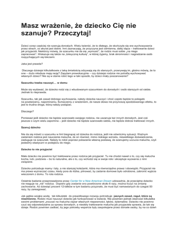 Masz wrażenie, że dziecko Cię nie szanuje? Przeczytaj! Dzieci coraz częściej nie szanują dorosłych. Wielu twierdzi, że to dlatego, że skończyła się era wychowywania przez strach, co akurat jest dobre. Inni zaznaczają, że przyczyna jest odmienna, dalej idąca – traktowanie dzieci jak przyjaciół. Niektórzy mówią, że szacunku nie da się „wymusić”, że rodzic musi sobie „na niego zapracować”. Wskazuje się także na „toksyczną kulturę”, w której żyjemy, brak skromności i nagradzanie osób rozpychających się łokciami. Jaka jest prawda? Dlaczego dzisiejsi kilkulatkowie z taką śmiałością odzywają się do starszych, przerywają im, głośno mówią, że to one – dużo młodsze mają rację? Zapytam prowokacyjnie – czy dzisiejsi rodzice nie potrafią wychowywać własnych dzieci? Nie są w stanie robić tego w taki sposób, by dzieci miały poszanowanie? Szacunku trzeba nauczyć… w domu Może się wydawać, że dziecko rodzi się z wbudowanym szacunkiem do dorosłych i osób starszych od siebie. Jednak to nieprawda. Szacunku, tak jak zasad dobrego wychowania, należy dziecka nauczyć i choć często będzie to polegało na powtarzaniu, napominaniu, tłumaczeniu z wrażeniem, że nasze słowa nie przynoszą spodziewanego efektu, to jest to trudna droga, którą należy podążać. Dlaczego? Ponieważ jeśli dziecko nie będzie szanowało swojego rodzica, nie uszanuje też innych dorosłych. Jest coś jeszcze o czym wielu zapomina – jeśli dziecko nie będzie szanowało siebie, nie będzie dobrze traktować innych. Szanuj dziecko Nie da się mówić o szacunku w linii biegnącej od dziecka do rodzica, jeśli nie odwrócimy sytuacji. Ważnym zadaniem rodzica jest nauczenie malucha, że on również, mimo niskiego wzrostu, niewielkiego doświadczenia, zasługuje na szacunek. Należy to robić poprzez pokazanie własną postawą, że szanujemy uczucia malucha, czyli jesteśmy elastyczni w podejściu do niego. Dziecko to nie przyjaciel Małe dziecko nie powinno być traktowane przez rodzica jak przyjaciel. Tu nie chodzi nawet o to, czy się malucha kocha, lubi, podziwia – bo to naturalne, ale o to, czy wchodzi się w swoje role i akceptuje wyzwania z nimi związane. Dziecko potrzebuje mamy i taty, a nie starszej koleżanki, która ma równorzędne prawa i obowiązki. Przyjaciel nie ma prawa wyznaczać czasu, kiedy pora do łóżka, pilnować, by zadanie domowe było odrobione, zabronić wyjścia wieczorem z domu. To rola rodzica. Ostatnie badanie przeprowadzone przez Center for a New American Dream udowadnia, że przeciętne dziecko nie reaguje na „nie” rodzica. Dopiero gdy zostanie ono powtórzone około 6 razy, można liczyć na zmianę zachowania. Aż dziesięć procent 12-latków w tym badaniu przyznało, że musi być namawianych do czegoś 50 razy, by zareagować. Jak gąbka wsiąka wodę, tak kilkulatek do prawidłowego rozwoju potrzebuje jasnych zasad, reguł, które są niezmienne. Rodzic musi nauczyć dziecko jak funkcjonować w świecie. Nie powinien jednak obarczać kilkulatka swoimi problemami ,zrzucać na malucha ciężar własnych niepewności, lęków, dylematów. Dziecko nie powinno czuć się odpowiedzialne za sprawy dorosłych, a niestety traktowanie malucha jak przyjaciela sprawia, że tak się dzieje. Rodzic powinien zadbać, by jego potrzeby wsparcia były zaspokajane przez dorosłe osoby, by na co dzień mógł się wygadać, dzięki temu swoje frustracje, kłopoty będzie omawiał z osobą do tego przygotowaną, która będzie w stanie doradzić, okazać zrozumienie. Pewnego dnia, gdy dziecko będzie już dorosłe, relacje zmieniają się, stają się partnerskie, zanim jednak to nastąpi, rodzic powinien podjąć się trudu wychowywania. Zanim do tego dojdzie: - staraj się monitorować, na jakie tematy rozmawiasz z dzieckiem, - zwróć uwagę, czy mówisz do malucha jak do dziecka czy jak do osoby dorosłej. Ustal wspólny front Rodzice powinni mówić jednym głosem. Upewnij się, że jeden z rodziców nie pozwala na przykre zachowanie, gdy w tym czasie drugi stara się je przezwyciężyć. Dziecko powinno otrzymywać jasny, jednoznaczny przekaz co do tego, co jest dobre a co nie. Poza tym wspólny front zakłada coś jeszcze – szacunek do ojca/matki dzieci. Trudno wymagać, że dziecko będzie szanowało mamę czy tatę, jeśli nie jest on/ona szanowany przez współmałżonka. Współczesna kultura nie pomaga… Wszystko łatwe i teoretycznie jasne, ale… Niestety rodzic ma dzisiaj nie lada zadanie. Współczesna kultura bowiem nie buduje wizerunku rodzica jako osoby, która zasługuje na szacunek. Wręcz przeciwnie – ojcowie to zabawni tatusiowie, którzy z niczym sobie nie radzą, można ich oszukiwać, manipulować nimi, dziecko pokazywane jest jako sprytniejsze i bardziej rozgarnięte od dorosłych, a postawa stanowcza i konsekwentna jako niepożądana, niemodna. Z jednej strony to zabawne, ale z drugiej…nie sprzyja wychowywaniu. Uczenie szacunku wymaga pokazania, że sprawujemy nadzór nad prawidłowym rozwojem dziecka i jesteśmy konsekwentni w tym zakresie i nie pozwalamy na przekroczenie pewnych granic. Ucz dziecko dobrych manier Niech maluch wie, w jaki sposób należy się przedstawiać, kiedy mówimy dziękuję, przepraszam i proszę. Powtarzaj i dawaj przykład, by dziecko otrzymywało lekcję na kilku poziomach. W tych naukach należy zachować spokój i konsekwencję. Uczenie dziecka szacunku nie powinno opierać się na krzykach, ośmieszaniu, ale na postawie empatycznej i wyrozumiałej. Jednak takiej, która uwzględnia konsekwencje złych wyborów – naruszenie zaufania rodzica powinno wiązać się ze staraniami, by je odzyskać. Brak szacunku – pierwsze objawy Dzieci mają to do siebie, że testują, na ile mogą sobie pozwolić. Dlatego ważne jest, by pokazać, że pewne zachowania nie będą akceptowane. Gdy nie pozwolimy już na drobne oznaki „braku szacunku”, będzie łatw