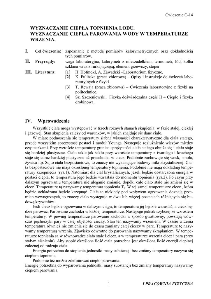 Ćwiczenie C-14 WYZNACZANIE CIEPŁA TOPNIENIA LODU. WYZNACZANIE CIEPŁA PAROWANIA WODY W TEMPERATURZE WRZENIA. I. Cel ćwiczenia: zapoznanie z metodą pomiarów kalorymetrycznych oraz dokładnością tych pomiarów. II. Przyrządy: waga laboratoryjna, kalorymetr z mieszadełkiem, termometr, lód, kolba szklana wraz z rurką łączącą, element grzewczy, stoper. III. Literatura: [1] H. Hofmokl, A. Zawadzki –Laboratorium fizyczne, [2] K. Fulińska (praca zbiorowa) – Opisy i instrukcje do ćwiczeń laboratoryjnych z fizyki. [3] T. Rewaja (praca zbiorowa) − Ćwiczenia laboratoryjne z fizyki na politechnice. [4] Sz. Szczeniowski, Fizyka doświadczalna część II − Ciepło i fizyka drobinowa. IV. Wprowadzenie Wszystkie ciała mogą występować w trzech różnych stanach skupienia: w fazie stałej, ciekłej i gazowej. Stan skupienia zależy od warunków, w jakich znajduje się dane ciało. W miarę podnoszenia się temperatury słabną własności charakterystyczne dla ciała stałego, przede wszystkim sprężystość postaci i moduł Younga. Następuje rozluźnienie więzów między cząsteczkami. Przy wzroście temperatury granica sprężystości ciała stałego obniża się i ciało staje się bardziej plastyczne. Ciało takie jak szkło przy wzroście temperatury z twardego i kruchego staje się coraz bardziej plastyczne aż przechodzi w ciecz. Podobnie zachowuje się wosk, smoła, żywica itp. Są to ciała bezpostaciowe, to znaczy nie wykazujące budowy mikrokrystalicznej. Ciała bezpostaciowe nie mają określonej temperatury topnienia. Podobnie nie mają dokładnej temperatury krzepnięcia (rys.1). Natomiast dla ciał krystalicznych, jeżeli będzie dostarczona energia w postaci ciepła, to temperatura jego będzie wzrastała do momentu topnienia (rys.2). Po czym przy dalszym ogrzewaniu temperatura nie uleganie zmianie, dopóki całe ciało stałe nie zmieni się w ciecz. Temperaturę tą nazywamy temperatura topnienia Tt. W tej samej temperaturze ciecz , która będzie ochładzana będzie krzepnąć. Ciała te niekiedy pod wpływem ogrzewania doznają przemian wewnętrznych, to znaczy ciało występuje w dwu lub więcej postaciach różniących się budową kryształów. Jeśli ciecz będzie ogrzewana w dalszym ciągu, to temperatura jej będzie wzrastać, a ciecz będzie parować. Parowanie zachodzi w każdej temperaturze. Następuje jednak szybciej ze wzrostem temperatury. W pewnej temperaturze parowanie zachodzi w sposób gwałtowny, powstają wówczas pęcherzyki pary w całej objętości cieczy. Stan ten nazywamy wrzeniem. W czasie wrzenia temperatura również nie zmienia się do czasu zamiany całej cieczy w parę. Temperaturę tę nazywamy temperaturą wrzenia. Zjawisko odwrotne do parowania nazywamy skraplaniem. W temperaturze topnienia są w równowadze ciało stale i ciecz, a w temperaturze wrzenia ciecz i para (przy stałym ciśnieniu). Aby stopić określoną ilość ciała potrzebna jest określona ilość energii cieplnej zależnej od rodzaju ciała. Energia potrzebna do stopienia jednostki masy substancji bez zmiany temperatury nazywa się ciepłem topnienia. Podobnie też można zdefiniować ciepło parowania: Energię potrzebną do wyparowania jednostki masy substancji bez zmiany temperatury nazywamy ciepłem parowania. 1 I PRACOWNIA FIZYCZNA Temperatura Temperatura Ćwiczenie C-14 para nienasycona Tw Ciecz+para nasycona Tt ciało stałe ciało +ciecz stałe Ilość Energii cieplnej Q Ilość Energii cieplnej Q Rys.1 Krzywa topnienia ciał bezpostaciowych Rys.2 Krzywa topnienia i parowania ciał krystalicznych Zależność między temperaturą topnienia T, ciśnieniem p, przy którym proces się odbywa i ciepłem topnienia L wyrażony jest wzorem Clapeyrona − Clausiusa. dp L = T(V2 – V1) (1) dT gdzie V1 jest objętością właściwą ciała stałego, a V2 jest objętością właściwą cieczy. Zwykle przy dp topnieniu następuje wzrost objętości w takim razie V2 – V1 > 0 ale L > 0 (zawsze), więc > 0, dT temperatura topnienia wzrasta z ciśnieniem. Lód pod ciśnieniem normalnym (ciśnienie normalne p = 101325 N/m2) topi się w temperaturze 0oC. Temperaturę tę nazywamy temperaturą topnienia lodu w warunkach normalnych. Ciepłem topnienia lodu nazywamy ilość energii jaką należy dostarczyć, aby 1 kg lodu w temperaturze 0oC zamienić na wodę o tej samej temperaturze. Wymiarem ciepła topnienia w układzie SI jest J/kg. Podwyższenie ciśnienia wywieranego na lód obniża jego temperaturę topnienia. Woda (podobnie bizmut) jest wyjątkiem, ponieważ lód podczas topnienia zmniejsza swą objętość. Woda rozszerza się tak jak inne ciecze, tylko w przedziale temperatur +4oC do temperatury wrzenia. W przedziale temperatur 0oC do +4oC woda podczas ogrzewania kurczy się. W temperaturze +4oC woda zajmuje najmniejszą objętość, wskutek czego jej gęstość jest największa. Ciepłem parowania wody nazywamy ilość energii jaką należy dostarczyć, aby 1 kg wody zamienić na parę nasyconą o tej samej temperaturze (w przemianie izotermicznej). Wymiarem ciepła parowania R w układzie SI jest J/kg. Ponieważ ciepło parowania w dużym stopniu zależy od temperatury, dlatego też przy wyznaczaniu ciepła parowania należy zawsze podawać temperaturę, w której odbywa się pomiar. Ciepło parowania maleje ze wzrostem temperatury i wynosi zero dla temperatury krytycznej (następuje zanik własności fizycznych fazy stanu pary nasyconej i cieczy).Temperatura krytyczna dla wody wynosi 374,2oC. Podobnie jak i przy topnieniu i tu ma zastosowanie wzór Clapeyrona – Clausiusa. dp (2) R= T(V2 – V1) dT gdzie V2 i V1 są objętościami właściwymi pary nasyconej i cieczy, p − ciśnieniem pary nasyconej w temperaturze T. W temperaturze krytycznej V2 = V1. 2 I PRACOWNIA FIZYCZNA Ćwiczenie C-14 V. Wiadomości z kalorymetrii Energia cieplna potrzebna do podwyższenia temperatury wody o masie m od To do temperatury Tw wynosi Q = c m (Tw – To) (3) Stos