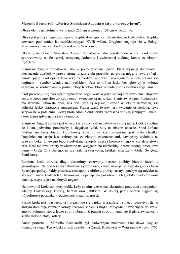 Marcello Bacciarelli – „Portret Stanisława Augusta w stroju koronacyjnym”. Obraz olejny na płótnie o wymiarach 255 cm w pionie i 158 cm w poziomie. Obraz jest jedną z najwcześniejszych replik słynnego portretu ostatniego króla Polski. Replika powstała pod koniec lat sześćdziesiątych XVIII wieku. Oryginał znajduje się w Pokoju Marmurowym na Zamku Królewskim w Warszawie. Ukazany na obrazie Stanisław August Poniatowski stoi przodem do widza. Król został sportretowany na tle szarej, masywnej kolumny i zwieszonej zielonej kotary ze złotymi frędzlami. Stanisław August Poniatowski stoi w jakby tanecznej pozie. Pierś wysunął do przodu i nieznacznie zwrócił w prawą stronę, ciężar ciała przeniósł na prawą nogę, a lewą cofnął i uniósł piętę. Król opiera lewą rękę na biodrze, w prawej, wyciągniętej w bok, trzyma zaś regiment – symbol władzy nad wojskiem. Jest to krótka laska bez głowicy w kolorze czarnym, ze zdobieniami w postaci złotych orłów, która wsparta jest na stoliku z regaliami. Król prezentuje się niezwykle wytwornie. Jego twarz wyraża spokój i zadowolenie. Brązowe oczy, o nieco zmysłowym spojrzeniu, zwrócone są na widza. Stanisław August Poniatowski ma szerokie, łukowate brwi, nos orli. Usta są wąskie, ułożone w lekkim uśmiechu, zaś policzki lekko okraszone rumieńcem. Prawa część twarzy jest wyraźnie oświetlona, lewa skrywa się w półcieniu. Głowę króla zdobi blond peruka zaczesana do tyłu, z bujnymi lokami, które luźno spływają na kark i ramiona. Stanisław August ubrany jest w srebrzysty strój: kaftan haftowany złotą nicią, krótkie spodnie do kolan, jedwabne pończochy i, sięgające łydki, buty na niskim obcasie. Spod kaftana wystają mankiety białej, koronkowej koszuli, na szyi zawiązana jest biała chustka. Dopełnieniem stroju jest srebrny pas ze złotymi zakończeniami, zawiązany ozdobnie na prawym boku. U lewego biodra połyskuje rękojeść miecza koronacyjnego w kształcie głowy orła. Król ma dwa ordery zawieszone na wstęgach: na niebieskiej, przewieszonej przez lewe ramię – Order Orła Białego, na szyi zaś, na czerwonej, krótkiej wstędze – Order Świętego Stanisława. Ramiona króla okrywa długi, aksamitny, czerwony płaszcz podbity białym futrem z gronostajów. Na płaszczu wyhaftowane są złote orły, całość nawiązuje więc do godła i barw Rzeczypospolitej. Fałdy płaszcza, szczególnie obfite z prawej strony, spoczywają miękko na stojącym obok króla fotelu tronowym i opadają na posadzkę. Fotel, obity bladoczerwoną tkaniną, wsparty jest na złotych nogach. Na prawo od króla stoi złoty stolik. Leży na nim czerwona, aksamitna poduszka z insygniami władzy królewskiej: koroną, berłem oraz jabłkiem. W dolnej partii obrazu ciągnie się trójkolorowa posadzka w odcieniach brązu i szarości. Postać króla jest rozświetlona i prezentuje się bardzo wyraziście na nieco rozmytym tle, w którym dominują złamane kolory szarości, zieleni i brązu. Masywna, nawiązująca do sztuki antyku kolumna stoi z lewej strony obrazu. Z prawej strony mienią się frędzle zwisającej z sufitu zielono-złotej kotary. Autor portretu – Marcello Bacciarelli był nadwornym malarzem Stanisława Augusta Poniatowskiego. Ten włoski artysta przybył na Zamek Królewski w Warszawie w roku 1766. Wykonał ponad 30 portretów króla, z czego najbardziej znany jest właśnie portret w stroju koronacyjnym. W licznych kopiach i replikach, wykonywanych przez cały okres panowania Stanisława Augusta, portret ten dotarł na obce dwory, sławiąc króla i jego malarza.