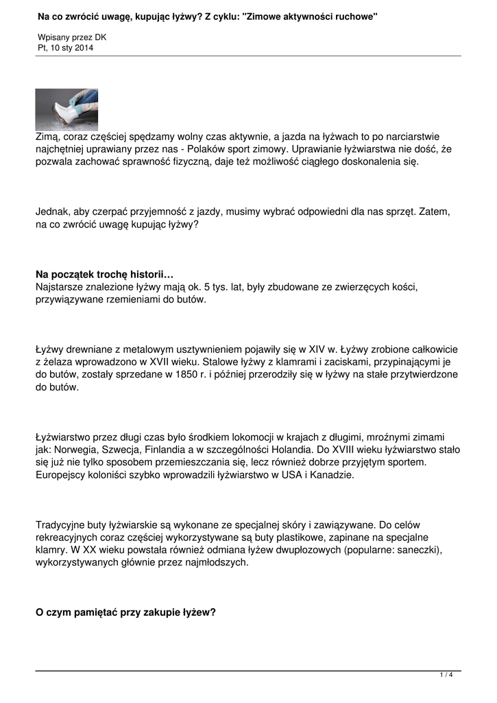 Na co zwrócić uwagę, kupując łyżwy? Z cyklu: "Zimowe aktywności ruchowe" Wpisany przez DK Pt, 10 sty 2014 Zimą, coraz częściej spędzamy wolny czas aktywnie, a jazda na łyżwach to po narciarstwie najchętniej uprawiany przez nas - Polaków sport zimowy. Uprawianie łyżwiarstwa nie dość, że pozwala zachować sprawność fizyczną, daje też możliwość ciągłego doskonalenia się. Jednak, aby czerpać przyjemność z jazdy, musimy wybrać odpowiedni dla nas sprzęt. Zatem, na co zwrócić uwagę kupując łyżwy? Na początek trochę historii… Najstarsze znalezione łyżwy mają ok. 5 tys. lat, były zbudowane ze zwierzęcych kości, przywiązywane rzemieniami do butów. Łyżwy drewniane z metalowym usztywnieniem pojawiły się w XIV w. Łyżwy zrobione całkowicie z żelaza wprowadzono w XVII wieku. Stalowe łyżwy z klamrami i zaciskami, przypinającymi je do butów, zostały sprzedane w 1850 r. i później przerodziły się w łyżwy na stałe przytwierdzone do butów. Łyżwiarstwo przez długi czas było środkiem lokomocji w krajach z długimi, mroźnymi zimami jak: Norwegia, Szwecja, Finlandia a w szczególności Holandia. Do XVIII wieku łyżwiarstwo stało się już nie tylko sposobem przemieszczania się, lecz również dobrze przyjętym sportem. Europejscy koloniści szybko wprowadzili łyżwiarstwo w USA i Kanadzie. Tradycyjne buty łyżwiarskie są wykonane ze specjalnej skóry i zawiązywane. Do celów rekreacyjnych coraz częściej wykorzystywane są buty plastikowe, zapinane na specjalne klamry. W XX wieku powstała również odmiana łyżew dwupłozowych (popularne: saneczki), wykorzystywanych głównie przez najmłodszych. O czym pamiętać przy zakupie łyżew? 1/4 Na co zwrócić uwagę, kupując łyżwy? Z cyklu: "Zimowe aktywności ruchowe" Wpisany przez DK Pt, 10 sty 2014 Rodzaj łyżew (figurówki czy hokejówki?) Obecnie na rynku dostępny jest ogromny wybór łyżew. Zanim podejmiemy decyzję, należy wziąć pod uwagę, jaki jest preferowany przez nas styl jazdy. Jeśli jesteśmy początkującymi łyżwiarzami i dopiero zaczynamy przygodę z tym sportem, zaopatrzmy się w figurówki. Są to stabilne, niezbyt szybkie łyżwy charakteryzujące się delikatnym wyglądem. Pomagają w utrzymaniu równowagi na lodzie, ponieważ wyposażone są w ząbki, zaś tylna część płozy jest nieco przedłużona. Z kolei hokejówki umożliwiają zarówno szybką jazdę, jak i wykonywanie rozmaitych trików, takich jak skoki czy piruety. Jeszcze do niedawna powszechne było przekonanie, że figurówki przeznaczone są wyłącznie dla kobiet, a hokejówki tylko dla mężczyzn. Dziś to się zmienia i każdy amator łyżwiarstwa dopasowuje łyżwy odpowiednio do swoich potrzeb i możliwości. Materiał (skóra vs plastik) Ważnym elementem, na który trzeba zwrócić uwagę przy zakupie łyżew to decyzja czy chcemy jeździć w łyżwach skórzanych czy plastikowych. Oczywiście każdy ma prawo jeździć na tym, na czym mu najwygodniej. Jednak eksperci polecają łyżwy skórzane, ze względu na ich doskonałe dopasowanie się do stopy przyszłego łyżwiarza. W przypadku łyżew plastikowych o takim dopasowaniu nie może być mowy, gdyż plastik nie jest materiałem, który do czegokolwiek się dopasuje. Sznurowane czy też zapinane? Mimo, że buty zapinane na klamry zakłada się i ściąga wygodniej (szybciej), częściej poleca się zakup łyżew z butami sznurowanymi. Ich zaletą jest to, że pozwalają dokładniej wyregulować ucisk w konkretnych miejscach. Rozmiar – mierzenie łyżew Aby zminimalizować ryzyko kontuzji, łyżwy muszą być idealnie dopasowane do nogi. Zbyt małe uprzykrzą nam jazdę, w zbyt dużych natomiast, zamiast na jeździe, będziemy koncentrować się na odpowiednim utrzymaniu nogi w bucie. Pamiętajmy, by do mierzenia butów założyć grubszą skarpetę. Producenci zazwyczaj oferują buty dla wąskich i szerokich stóp. Rozpoznamy je po oznaczeniu, umieszczonym na języku buta – litera „D” oznacza stopę wąską, a „E” – stopę szeroką. 2/4 Na co zwrócić uwagę, kupując łyżwy? Z cyklu: "Zimowe aktywności ruchowe" Wpisany przez DK Pt, 10 sty 2014 Cena… na znaczenia Cena łyżew jest także ważna. Nie kupujmy ich z promocji w supermarkecie za 30-50zł, bo na pewno szybko się zepsują. Porządne narzędzie jazdy łyżwiarskiej powinniśmy kupić w sklepie sportowym z „lepszej” firmy za 150 - 250zł. Takie łyżwy są lepszej klasy, wytrzymałe i do tego z gwarancją. Odpowiedni strój jest również ważny To, jaki strój na łyżwy założymy, zależy przede wszystkim od tego, gdzie planujemy jeździć. Na lodowiskach zamkniętych temperatura powietrza wynosi około 10-15 st. C, wystarczy więc założenie nieco grubszego swetra czy bluzki i bezrękawnika oraz spodni zapewniających pełną swobodę ruchów. Inaczej jest w przypadku lodowisk otwartych, na których temperatura jest równa tej panującej w otoczeniu. Tu więc, w zależności od pogody, załóżmy nie tylko kurtkę, ale też czapkę, krótki szalik (długi mógłby się platać między nogami), rękawiczki i ciepłe skarpety. W obu przypadkach strój powinien być przylegający, ale nie ograniczający ruchów. Odradza się więc jazdę na przykład w spodniach jeansowych. Generalnie przyjęło się, by na lodowisko ubierać się na tzw. cebulkę. Podczas dłuższej jazdy może bowiem zacząć się nam robić nieco cieplej i wtedy trzeba będzie zdjąć jedną warstwę ubrania. Zawsze dobrym rozwiązaniem jest też bielizna termoaktywna, dzięki której nie będziemy się zanadto pocić. Jest to o tyle ważne, że mokre ciało dużo szybciej się wyziębia. Gdy wybieramy się na lodowisko z dzieckiem, zwłaszcza tym zaczynającym przygodę z łyżwiarstwem, zainwestujmy dla niego w kask, który ochroni głowę podczas upadków. Pełne bezpieczeństwo zapewni także zestaw ochraniaczy - na nadgarstki, łokcie i kolana. Jak dbać o łyż