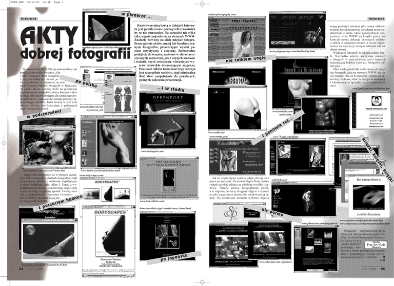NUDA.QXD 02/11/05 12:48 Page 1 w p le n e r z e .. . internet AKTY members.tripod.com/~SethMayerPhoto/nudes.htm dobrej fotografii Na łamach FOTO (3/98) prezentowaliśmy już prace z krakowskiej wystawy „On i Oni”. Bogatszy zbiór fotografii z niej pochodzących można jepo p szcze podziwiać w Internecie na stroolsk nach Muzeum Historii Fotografii w Krakowie. u To polski akcent. Łatwiej trafić na prezentacje zagranicznych fotografów, którzy Internet wykorzystują jako galerię dostępną dla szerokiego grona odbiorców i jednocześnie metodę promocji artystycznego dorobku. Jedni tworzą w tym celu własne witryny, inni korzystają z gościnnych muzeum.mhf.krakow.pl stron większych galerii. /wystawy/on_oni/ cze w pod rwien chabot-photography.com/ internet Kontrowersyjną kartą w dziejach Internetu jest publikowanie pornografii (cokolwiek by to nie oznaczało). Na szczęście nie tylko taka nagość pojawia się na stronach WWW. Znalazły bowiem na nich miejsce fotograficzne galerie aktów, mniej lub bardziej znanych fotografów, prezentujące wysoki poziom artystyczny i estyczny. Różnorodne podejście do tematu, zarówno w sferze artystycznych zamierzeń, jak i użytych środków i technik, czyni zwiedzanie wirtualnych wystaw niezwykle interesującym zajęciem. Ponieważ odbiór twórczości tego rodzaju jest szczególnie osobisty, stąd minimalna ilość słów uzupełnienia do poniższych, godnych polecenia prezentacji. www.gruppogarage.com/html/maing.html n a g ie n ie c a ³k ie m .. .i w s t u d iu mogą posłużyć również jako temat elektronicznej kartki pocztowej wysyłanej za pośrednictwem e-maila. Dość powszechnym elementem stron WWW są książki gości, do których można dokonać imiennych wpisów z opinią o oglądanej stronie, a nawet zagłosować na najlepszy naszym zdaniem akt na danej stronie. Większość fotografii to zdjęcia czarno-białe. Nierzadko autorzy korzystają również z fotografii w podczerwieni, nieco innaczej rejestrującej ludzkie ciało niż fotografia tradycyjna. Zbyt wielu porad dla osób chcących zająć się fotografią aktu na stronach WWW nie da się znaleźć. Ale za to możemy sięgnąć do literatury fachowej dość licznie prezentowanej i oferowanej na sprzedaż za pośrednictwem sieci. www2.pair.com/tracylee/fineline.htm i www.hilstudio.com/ nudes.html. www.vahle.net/ www.rundu.com/ a i p w no ie ¿ te ... www75.pair.com/hbutz/ ks i¹ ¿k i, www.debenport.com/ ks i¹ ¿k i, www.kelvin.net/dcardish/index.html i ie Jak to często bywa autorzy zdjęć oferują swe oellerich.com/ prace na sprzedaż. Na stronie Sepia Press można jednak uzyskać zdjęcie za odrobinę wysiłku i zabawy. Należy ułożyć fotograficzne puzle, a w nagrodę możemy ściągnąć zdjęcie i używać je jako wygaszacza ekrenu lub windowsowej tapety. Na niektórych stronach wybrane zdjęcia ¿k z zuc poc i¹ Nagie ciała fotografuje się w różnych scener- www.bodyscapes.com/ jach wykreowanych w studiach fotografów, bądź wykorzystuje plenery - doskonale współgrające z naturą ludzkiego ciała. Allan I. Teger, z wykształcenia psycholog, wykorzystuje nagie ciało w jeszcze inny, oryginalny sposób. Tworzy swoiste „ciałokrajobrazy” - śmieszne i wizjonerru skie. Podobny charakter mają praumo h ce Juergena Kirchhoffa. m ks www.onedoor.com/infrared/Nudes.htm www.jeanvallette.com/ home.interlink.or.jp/~tamaki/soave_home.html nic dar mo www.aaquino.com/photobooks/nude.htm www.photoserve.com/jorgeparra/ www.editionsone.com/illuminations/gallery.html poñs po ja ku www.cyber-dyne.com/~gjohnson/ Większość zaprezentowanych tu stron jest rekomendowana przez The Fine Art Nude Photography Network intenetowy „organ prasowy” promujący wartościowe strony poświęcone fotografii aktu i gwarantujący wysoki ich poziom merytoryczny i edytorski. T GM www.neuss.netsurf.de/~schachts/ks15.htm 64 foto 11/98 foto 11/98 65
