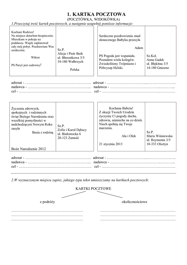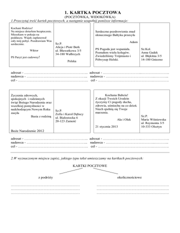 1. KARTKA POCZTOWA (POCZTÓWKA, WIDOKÓWKA) 1.Przeczytaj treść kartek pocztowych, a następnie uzupełnij poniższe informacje: Kochani Rodzice! Na miejsce dotarłem bezpiecznie. Mieszkam w pokoju na poddaszu. Wujek zaplanował cały mój pobyt. Pozdrawiam Was serdecznie. Wiktor Serdeczne pozdrowienia znad słonecznego Bałtyku przesyła Sz.P. Alicja i Piotr Berk ul. Bławatkowa 3/5 34-180 Wałbrzych PS Paryż jest cudowny! Polska Adam PS Pogoda jest wspaniała. Poznałem wielu kolegów. Zwiedziliśmy Trójmiasto i Półwysep Helski. Sz.Kol. Anna Gadek ul. Błękitna 3/5 14-180 Gniezno adresat - …………………………………………….. adresat - …………………………...………………….. nadawca - …………………………………………... nadawca - …………………………………..………... cel - …………………………………………………. cel - ……………………………………….…………. Życzenia zdrowych, spokojnych i rodzinnych świąt Bożego Narodzenia oraz wszelkiej pomyślności w nadchodzącym Nowym Roku zasyła Basia z rodziną Sz.P. Zofia i Karol Dębscy ul. Białostocka 6 20-123 Zamość Kochana Babciu! Z okazji Twoich Urodzin życzymy Ci pogody ducha, zdrowia, uśmiechu na co dzień. Niech spełnią się Twoje marzenia. Ala i Olek 21 stycznia 2013 Sz.P. Maria Wiśniewska ul. Reymonta 3/5 10-333 Olsztyn Boże Narodzenie 2012 adresat - …………………………………………….. adresat - …………………………...………………….. nadawca - …………………………………………... nadawca - …………………………………..………... cel - …………………………………………………. cel - ……………………………………….…………. 2.W wyznaczonym miejscu zapisz, jakiego typu tekst umieszczamy na kartkach pocztowych: KARTKI POCZTOWE z podróży ………………………………………………… ………………………………………………… ………………………………………………… okolicznościowe …………………………………………………… …………………………………………………… …………………………………………………… 3.Opisz poszczególne elementy adresu: ……………………………………………. …………………………………………………… Sz.P. Maria Wiśniewska ul. Reymonta 3/5 10-333 Olsztyn …………………………………………………… … ………………………………………………………… 4.Sformułuj co najmniej 3 bardzo ważne Twoim zdaniem wskazówki dotyczące sposobu zapisu tekstu na kartce pocztowej. Użyj 2. osoby liczby pojedynczej trybu rozkazującego. 1/ ……………………………………………………………………………………………………… 2/ ……………………………………………………………………………………………………… 3/ ……………………………………………………………………………………………………… 5.Na poniższych kartkach pocztowych zredaguj teksty zgodne z intencją. Kartki poprawnie zaadresuj (wymyśl imię i nazwisko adresata): 1/ Na kartce pocztowej zapisz życzenia z okazji Dnia Dziadka. Zaadresuj kartkę.