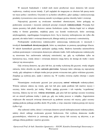 W naszych budynkach i wokół nich może przebywać mysz domowa lub szczur wędrowny, rzadziej szczur śniady. Z pól zaglądać do magazynu ze zbożem lub paszą może też mysz polna i zaroślowa. Gryzonie te są bardzo szkodliwe, gdyż zjadają i zanieczyszczają produkty żywnościowe oraz roznoszą zarazki wywołujące groźne choroby ludzi i zwierząt. Najczęściej gryzonie są zwalczane metodami chemicznymi, które polegają na podawaniu szczurom i myszom zatrutych przynęt zwanych rodentycydami. Przynętą być ziarno pszenicy lub płatki zbożowe zatrute fosforkiem cynku. Można kupić też w sklepie trutkę w formie granulatu, miękkiej pasty czy kostek woskowych, które zawierają antykoagulanty, zapobiegające krzepnięciu krwi. Są to trucizny niebezpieczne nie tylko dla gryzoni, ale także ludzi i zwierząt domowych, dlatego należy je stosować z ostrożnością. Profesjonalni użytkownicy rodentycydów umieszczają rodentycydy w mocnych i trwałych karmnikach deratyzacyjnych, które są zamykane za pomocą specjalnego klucza. W takich karmnikach gryzonie spokojnie zjadają trutkę. Budowa karmnika uniemożliwia osobom postronnym i zwierzętom domowym zabranie trutki. Jeśli niebezpieczne rodentycydy są stosowane bez zachowania należytej ostrożności, np. gdy są wykładane tylko na kartonowej tacy, wtedy dzieci i zwierzęta domowe mają łatwy do dostęp do trutki i może zdarzyć się nieszczęście. Gdy zwierzę domowe, np. pies lub kot, zje trutkę wyłożoną dla gryzoni, wtedy ulegnie zatruciu, które określa się jako zatrucie pierwotne. Sytuacje takie zdarzają się najczęściej wtedy, gdy zakupiona w sklepie trutka jest po prostu wrzucona tam, gdzie widziano gryzonie. Znajduje ją szybciej pies, zjada i zatruwa się. W wyniku zwierzę ciężko choruje i często umiera. Nieumiejętne zwalczanie gryzoni jest przyczyną zatruć wtórnych rodentycydami. Wtórne zatrucie zdarza się wtedy, gdy kot lub pies zjada podtrute lub martwe myszy i szczury, które strawiły już trutkę. Wtedy zjadają gryzonie i ich wątrobę ‘wypełnioną’ trucizną. Zdarza się też tzw. wtórne strawienie, gdy pies lub kot upoluje szczura wcześniej niż on strawił pobrana trutkę i zjada go, gdy ma trutkę jeszcze w żołądku. Zagrożeniem większym dla naszych zwierząt domowych są podtrute szczury niż myszy, gdyż szczury zjadają podczas jednego posiłku około 30 g trutki, a więc znacznie większą porcję niż myszy (tylko 4 g). Aby uchronić siebie, dzieci i zwierzęta domowe przed niebezpiecznymi rodentycydami, należy zlecić zabiegi zwalczania gryzoni fachowcom. Oni wybiorą skuteczne środki gryzoniobójcze, właściwie je zastosują tam, gdzie myszy lub szczury są aktywne, a po zabiegu zbiorą podtrute i martwe gryzonie. Opracował Prof. dr hab. Stanisław Ignatowicz – SGGW, Katedra Entomologii Stosowanej w Warszawie