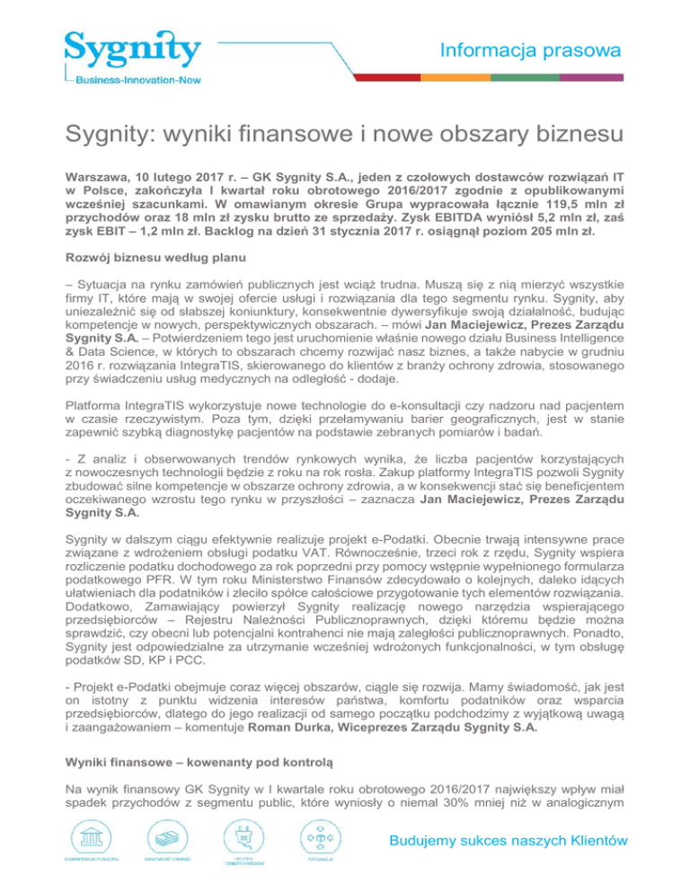 Informacja prasowa Sygnity: wyniki finansowe i nowe obszary biznesu Warszawa, 10 lutego 2017 r. – GK Sygnity S.A., jeden z czołowych dostawców rozwiązań IT w Polsce, zakończyła I kwartał roku obrotowego 2016/2017 zgodnie z opublikowanymi wcześniej szacunkami. W omawianym okresie Grupa wypracowała łącznie 119,5 mln zł przychodów oraz 18 mln zł zysku brutto ze sprzedaży. Zysk EBITDA wyniósł 5,2 mln zł, zaś zysk EBIT – 1,2 mln zł. Backlog na dzień 31 stycznia 2017 r. osiągnął poziom 205 mln zł. Rozwój biznesu według planu – Sytuacja na rynku zamówień publicznych jest wciąż trudna. Muszą się z nią mierzyć wszystkie firmy IT, które mają w swojej ofercie usługi i rozwiązania dla tego segmentu rynku. Sygnity, aby uniezależnić się od słabszej koniunktury, konsekwentnie dywersyfikuje swoją działalność, budując kompetencje w nowych, perspektywicznych obszarach. – mówi Jan Maciejewicz, Prezes Zarządu Sygnity S.A. – Potwierdzeniem tego jest uruchomienie właśnie nowego działu Business Intelligence & Data Science, w których to obszarach chcemy rozwijać nasz biznes, a także nabycie w grudniu 2016 r. rozwiązania IntegraTIS, skierowanego do klientów z branży ochrony zdrowia, stosowanego przy świadczeniu usług medycznych na odległość - dodaje. Platforma IntegraTIS wykorzystuje nowe technologie do e-konsultacji czy nadzoru nad pacjentem w czasie rzeczywistym. Poza tym, dzięki przełamywaniu barier geograficznych, jest w stanie zapewnić szybką diagnostykę pacjentów na podstawie zebranych pomiarów i badań. - Z analiz i obserwowanych trendów rynkowych wynika, że liczba pacjentów korzystających z nowoczesnych technologii będzie z roku na rok rosła. Zakup platformy IntegraTIS pozwoli Sygnity zbudować silne kompetencje w obszarze ochrony zdrowia, a w konsekwencji stać się beneficjentem oczekiwanego wzrostu tego rynku w przyszłości – zaznacza Jan Maciejewicz, Prezes Zarządu Sygnity S.A. Sygnity w dalszym ciągu efektywnie realizuje projekt e-Podatki. Obecnie trwają intensywne prace związane z wdrożeniem obsługi podatku VAT. Równocześnie, trzeci rok z rzędu, Sygnity wspiera rozliczenie podatku dochodowego za rok poprzedni przy pomocy wstępnie wypełnionego formularza podatkowego PFR. W tym roku Ministerstwo Finansów zdecydowało o kolejnych, daleko idących ułatwieniach dla podatników i zleciło spółce całościowe przygotowanie tych elementów rozwiązania. Dodatkowo, Zamawiający powierzył Sygnity realizację nowego narzędzia wspierającego przedsiębiorców – Rejestru Należności Publicznoprawnych, dzięki któremu będzie można sprawdzić, czy obecni lub potencjalni kontrahenci nie mają zaległości publicznoprawnych. Ponadto, Sygnity jest odpowiedzialne za utrzymanie wcześniej wdrożonych funkcjonalności, w tym obsługę podatków SD, KP i PCC. - Projekt e-Podatki obejmuje coraz więcej obszarów, ciągle się rozwija. Mamy świadomość, jak jest on istotny z punktu widzenia interesów państwa, komfortu podatników oraz wsparcia przedsiębiorców, dlatego do jego realizacji od samego początku podchodzimy z wyjątkową uwagą i zaangażowaniem – komentuje Roman Durka, Wiceprezes Zarządu Sygnity S.A. Wyniki finansowe – kowenanty pod kontrolą Na wynik finansowy GK Sygnity w I kwartale roku obrotowego 2016/2017 największy wpływ miał spadek przychodów z segmentu public, które wyniosły o niemal 30% mniej niż w analogicznym Budujemy sukces naszych Klientów Informacja prasowa okresie roku poprzedniego. Spadek w segmencie utilities wyniósł niecałe 10% rok do roku, a sprzedaż w segmencie bankowo-finansowym była na porównywalnym poziomie. W efekcie łączne przychody Grupy Sygnity wyniosły 119,5 mln zł, co oznacza spadek o 14,5% rok do roku. Zysk brutto ze sprzedaży wyniósł 18 mln zł (spadek o 26,8% r/r), zysk EBITDA wyniósł 5,2 mln zł (spadek o 53% r/r), zysk EBIT 1,2 mln zł (spadek o 84% r/r). Utrzymywana jest wysoka dyscyplina kosztów ogólnego zarządu, które w omawianym okresie wyniosły 8,9% sprzedaży. Warto również zaznaczyć, że na koniec omawianego okresu poziom wskaźnika dług netto/EBITDA wynosił niecałe 1,7x, co oznacza, że znajdował się na bardzo bezpiecznym poziomie, nie zagrażającym złamaniu kowenantów. - Z opublikowanych wyników za I kwartał roku obrotowego 2016/2017 wynika, że Grupa Sygnity poruszając się dziś w bardzo trudnym sektorze rynku usług IT, utrzymuje potencjał rozwoju, a jednocześnie dyscyplinę kosztową. To pozwala nam stabilnie realizować strategię na najbliższy czas opartą o dywersyfikację portfela i rozszerzenie portfolio produktów oraz usług – mówi Jakub Leśniewski, Wiceprezes Zarządu ds. Finansowych Sygnity S.A. Dalszych informacji udziela: Lidia Kłosowska Dyrektor ds. Marketingu i Relacji Partnerskich M. +48 508 021 623 e-mail: [email protected] O Sygnity Sygnity S.A. jest czołowym dostawcą rozwiązań informatycznych w Polsce, notowanym na Giełdzie Papierów Wartościowych w Warszawie od 1995 r. Posiada wszechstronne kompetencje w dziedzinie rozwiązań informatycznych dla sektorów bankowo-finansowego, administracji publicznej i utilities, a także firm telekomunikacyjnych, paliwowych i sieci detalicznych. W ofercie Spółki znajduje się pełen zakres usług IT – od consultingu, przez projekty, serwis, aż po outsourcing. Sygnity jest autorem jednego z najnowocześniejszych systemów e-Podatków w Europie. Więcej informacji: http://www.sygnity.pl/ Budujemy sukces naszych Klientów