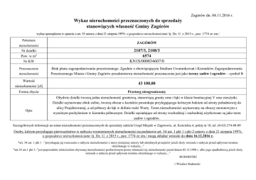 Zagórów dn. 04.11.2016 r. Wykaz nieruchomości przeznaczonych do sprzedaży stanowiących własność Gminy Zagórów wykaz sporządzono w oparciu o art. 35 ustawy z dnia 21 sierpnia 1997r. o gospodarce nieruchomościami /tj. Dz. U. z 2015 r., poz. 1774 ze zm./ Położenie nieruchomości ZAGÓRÓW Nr działki Pow. w m2 Nr KW 2107/3, 2108/3 6574 KN1S/000034607/0 Przeznaczenie Brak planu zagospodarowania przestrzennego. Zgodnie z obowiązującym Studium Uwarunkowań i Kierunków Zagospodarowania Przestrzennego Miasta i Gminy Zagórów przedmiotowa nieruchomość przeznaczona jest jako tereny sadów i ogrodów – symbol S nieruchomości Wartość nieruchomości [zł] 43 100,00 Forma zbycia Przetarg nieograniczony Opis Obydwie działki tworzą jedna nieruchomość gruntową, stanowiącą grunty orne i łąki w klasie bonitacyjnej V oraz nieużytki. Działki usytuowane obok siebie, tworzą obszar o kształcie prostokąta przylegającego krótszym bokiem od strony południowej do ulicy Projektowanej, a od północy do łąk w dolinie rzeki Warty. Teren nieruchomości usytuowany na zboczy morenowym z wyraźnym pochyleniem w kierunku północnym. Działki sąsiadujące od strony wschodniej i zachodniej użytkowane są jako teren sadów i ogrodów. Szczegółowych informacji na temat nieruchomości przeznaczonych do sprzedaży udziela Urząd Miejski w Zagórowie, ul. Kościelna 4, pokój nr 10, tel. (0-63) 274-88-09 Osoby, którym przysługuje pierwszeństwo w nabyciu wymienionych nieruchomości na podstawie art. 34 ust. 1 pkt 1 i pkt 2 ustawy z dnia 21 sierpnia 1997r. o gospodarce nieruchomościami /tj. Dz. U. z 2015 r., poz. 1774 ze zm./ mogą składać wnioski do dnia 16.12.2016 r. *art. 34 ust. 1 pkt 1 -”przysługuje jej roszczenie o nabycie nieruchomości z mocy niniejszej ustawy lub odrębnych przepisów jeżeli złoży wniosek o nabycie przed upływem terminu określonego w wykazie...” *art.34 ust.1 pkt 2 -”jest poprzednim właścicielem zbywanej nieruchomości pozbawionym prawa własności tej nieruchomości przed dniem 05.12.1990 r. albo jego spadkobiercą jeżeli złoży wniosek o nabycie przed upływem terminu określonego w wykazie...” BURMISTRZ /-/Wiesław Radniecki