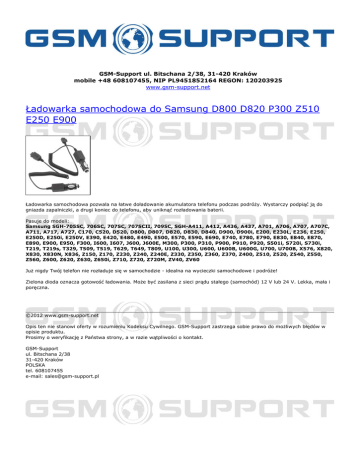 GSM-Support ul. Bitschana 2/38, 31-420 Kraków mobile +48 608107455, NIP PL9451852164 REGON: 120203925 www.gsm-support.net Ładowarka samochodowa do Samsung D800 D820 P300 Z510 E250 E900 Ładowarka samochodowa pozwala na łatwe doładowanie akumulatora telefonu podczas podróży. Wystarczy podpiąć ją do gniazda zapalniczki, a drugi koniec do telefonu, aby uniknąć rozładowania baterii. Pasuje do modeli: Samsung SGH-705SC, 706SC, 707SC, 707SCII, 709SC, SGH-A411, A412, A436, A437, A701, A706, A707, A707C, A711, A717, A727, C170, C520, D520, D800, D807, D820, D830, D840, D900, D900i, E200, E230L, E236, E250, E250D, E250i, E250V, E390, E420, E480, E490, E500, E570, E590, E690, E740, E780, E790, E830, E840, E870, E890, E900, E950, F300, I600, I607, J600, J600E, M300, P300, P310, P900, P910, P920, S501i, S720i, S730i, T219, T219s, T329, T509, T519, T629, T649, T809, U100, U300, U600, U600B, U600G, U700, U700B, X576, X820, X830, X830N, X836, Z150, Z170, Z230, Z240, Z240E, Z330, Z350, Z360, Z370, Z400, Z510, Z520, Z540, Z550, Z560, Z600, Z620, Z630, Z650i, Z710, Z720, Z720M, ZV40, ZV60 Już nigdy Twój telefon nie rozładuje się w samochodzie - idealna na wycieczki samochodowe i podróże! Zielona dioda oznacza gotowość ładowania. Może być zasilana z sieci prądu stałego (samochód) 12 V lub 24 V. Lekka, mała i poręczna. ©2012 www.gsm-support.net Opis ten nie stanowi oferty w rozumieniu Kodeksu Cywilnego. GSM-Support zastrzega sobie prawo do możliwych błędów w opisie produktu. Prosimy o weryfikację z Państwa strony, a w razie wątpliwości o kontakt. GSM-Support ul. Bitschana 2/38 31-420 Kraków POLSKA tel. 608107455 e-mail: [email protected] Powered by TCPDF (www.tcpdf.org)