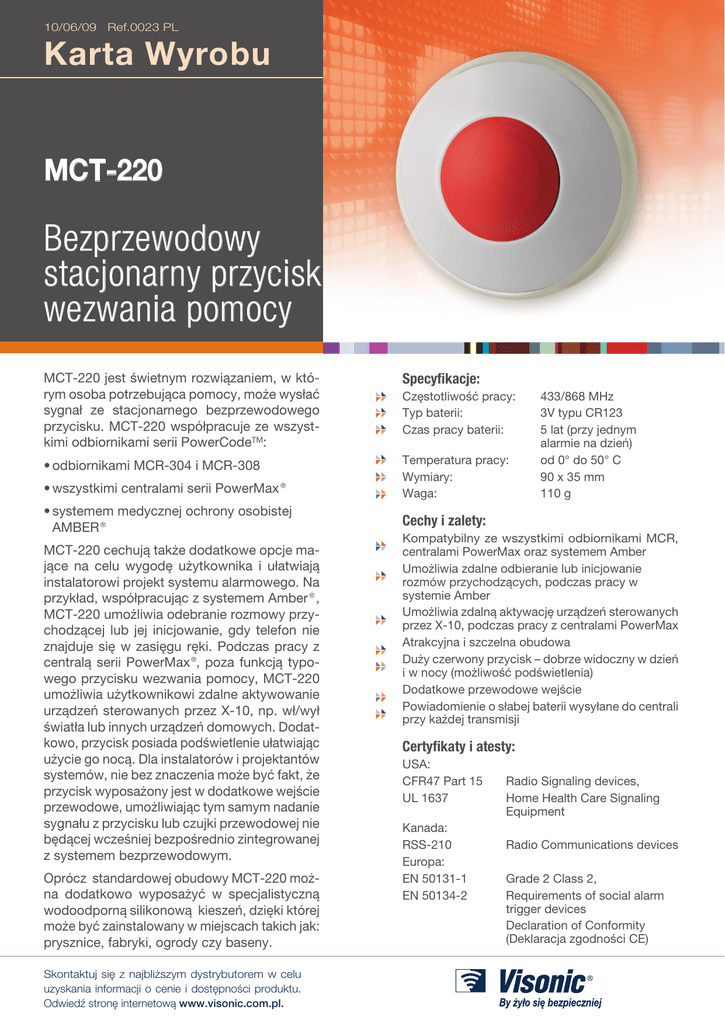 10/06/09 Ref.0023 PL Karta Wyrobu MCT-220 Bezprzewodowy stacjonarny przycisk wezwania pomocy MCT-220 jest świetnym rozwiązaniem, w którym osoba potrzebująca pomocy, może wysłać sygnał ze stacjonarnego bezprzewodowego przycisku. MCT-220 współpracuje ze wszystkimi odbiornikami serii PowerCodeTM: •odbiornikami MCR-304 i MCR-308 •wszystkimi centralami serii PowerMax® •systemem medycznej ochrony osobistej AMBER® MCT-220 cechują także dodatkowe opcje mające na celu wygodę użytkownika i ułatwiają instalatorowi projekt systemu alarmowego. Na przykład, współpracując z systemem Amber®, MCT-220 umożliwia odebranie rozmowy przychodzącej lub jej inicjowanie, gdy telefon nie znajduje się w zasięgu ręki. Podczas pracy z centralą serii PowerMax®, poza funkcją typowego przycisku wezwania pomocy, MCT-220 umożliwia użytkownikowi zdalne aktywowanie urządzeń sterowanych przez X-10, np. wł/wył światła lub innych urządzeń domowych. Dodatkowo, przycisk posiada podświetlenie ułatwiając użycie go nocą. Dla instalatorów i projektantów systemów, nie bez znaczenia może być fakt, że przycisk wyposażony jest w dodatkowe wejście przewodowe, umożliwiając tym samym nadanie sygnału z przycisku lub czujki przewodowej nie będącej wcześniej bezpośrednio zintegrowanej z systemem bezprzewodowym. Oprócz standardowej obudowy MCT-220 można dodatkowo wyposażyć w specjalistyczną wodoodporną silikonową kieszeń, dzięki której może być zainstalowany w miejscach takich jak: prysznice, fabryki, ogrody czy baseny. Skontaktuj się z najbliższym dystrybutorem w celu uzyskania informacji o cenie i dostępności produktu. Odwiedź stronę internetową www.visonic.com.pl. Specyfikacje: Częstotliwość pracy: Typ baterii: Czas pracy baterii: Temperatura pracy: Wymiary: Waga: 433/868 MHz 3V typu CR123 5 lat (przy jednym alarmie na dzień) od 0° do 50° C 90 x 35 mm 110 g Cechy i zalety: Kompatybilny ze wszystkimi odbiornikami MCR, centralami PowerMax oraz systemem Amber Umożliwia zdalne odbieranie lub inicjowanie rozmów przychodzących, podczas pracy w systemie Amber Umożliwia zdalną aktywację urządzeń sterowanych przez X-10, podczas pracy z centralami PowerMax Atrakcyjna i szczelna obudowa Duży czerwony przycisk – dobrze widoczny w dzień i w nocy (możliwość podświetlenia) Dodatkowe przewodowe wejście Powiadomienie o słabej baterii wysyłane do centrali przy każdej transmisji Certyfikaty i atesty: USA: CFR47 Part 15 UL 1637 Kanada: RSS-210 Europa: EN 50131-1 EN 50134-2 Radio Signaling devices, Home Health Care Signaling Equipment Radio Communications devices Grade 2 Class 2, Requirements of social alarm trigger devices Declaration of Conformity (Deklaracja zgodności CE)